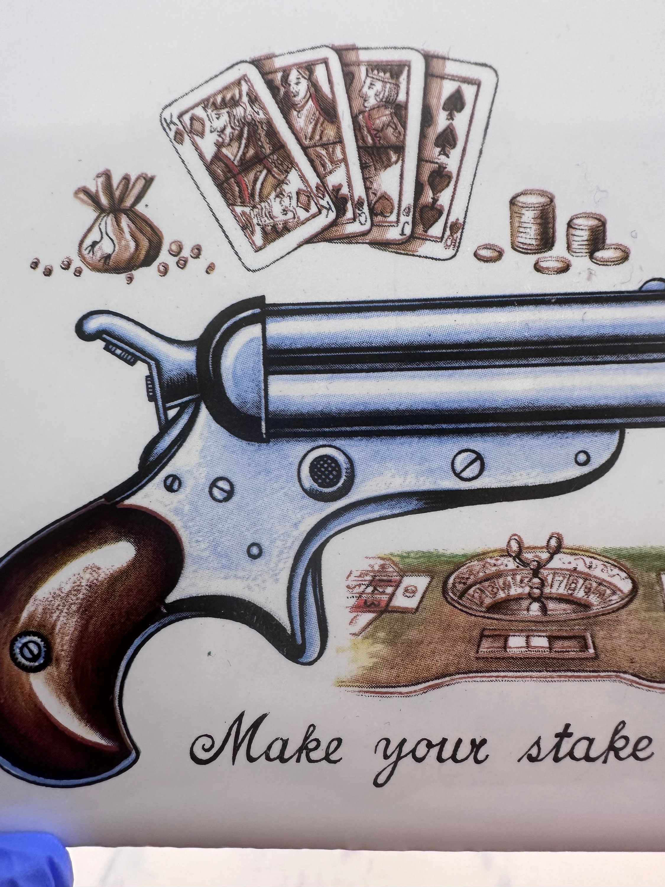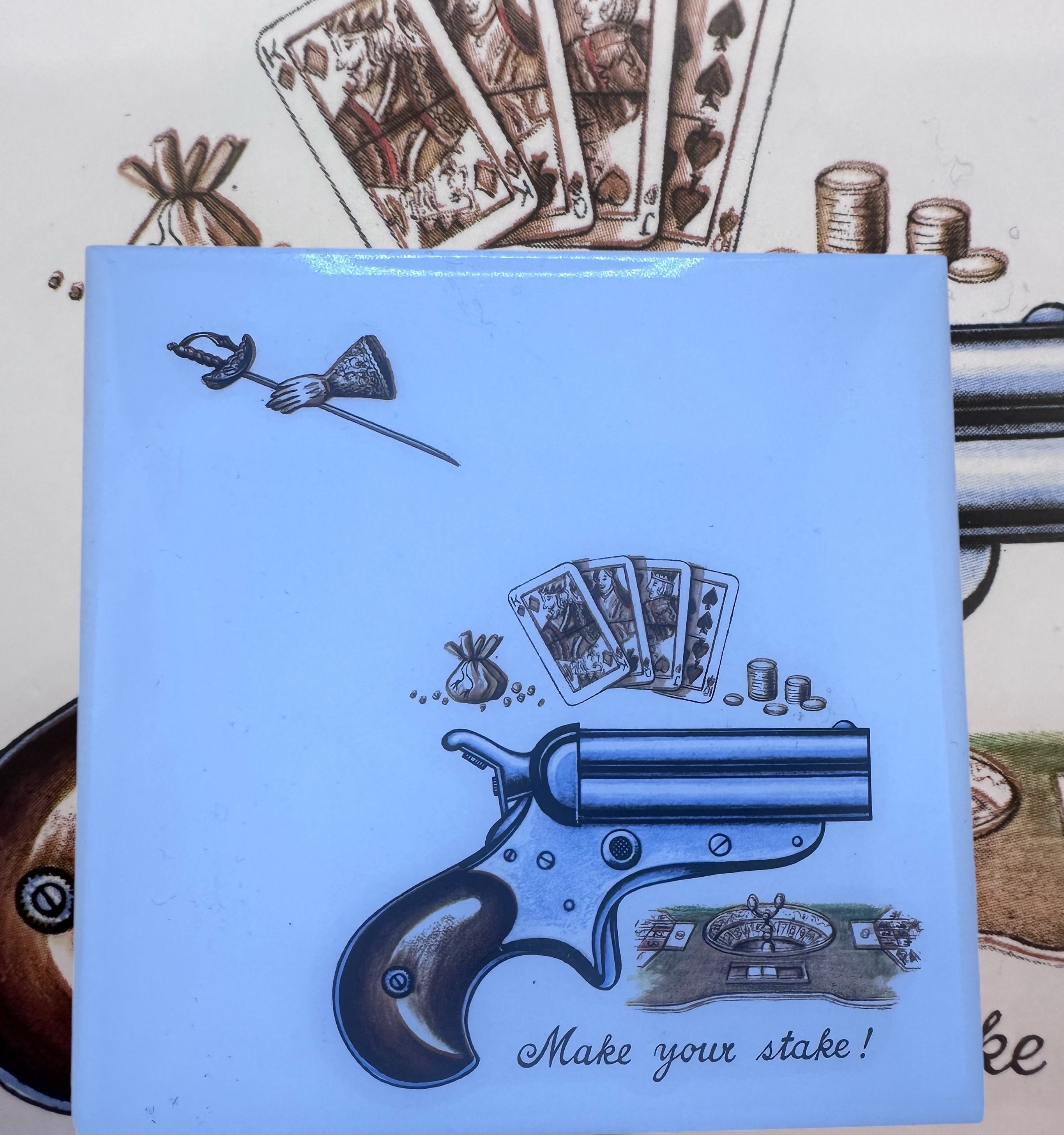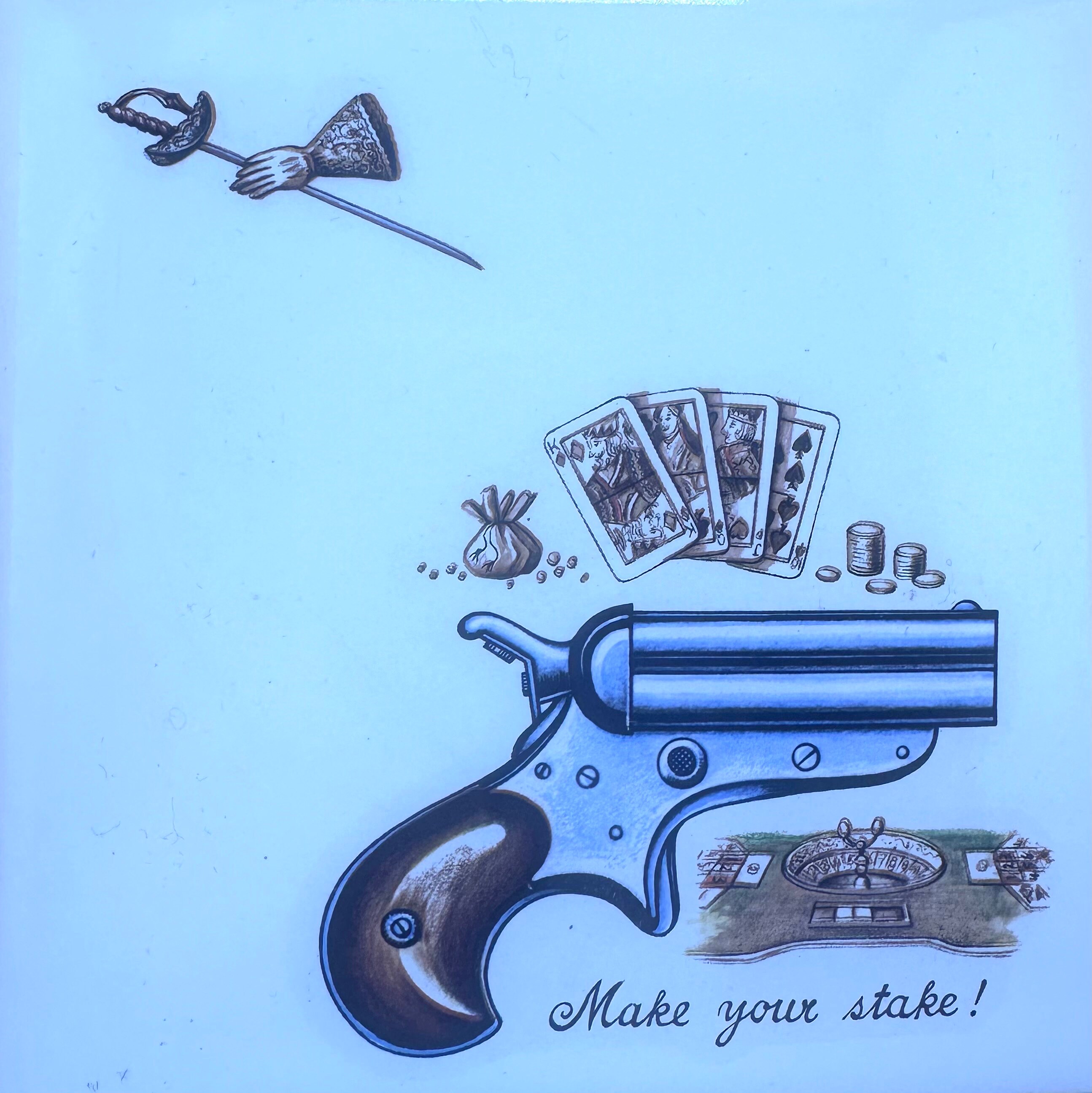 This is for one hand decorated 6" x 6" square ceramic wall tile. The art tile features a James Bond style poster of a Remington derringer along with a roulette wheel and a deck of cards. It says "Make Your Stake!", It is in excellent condition.