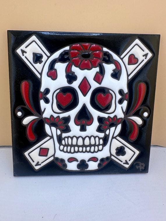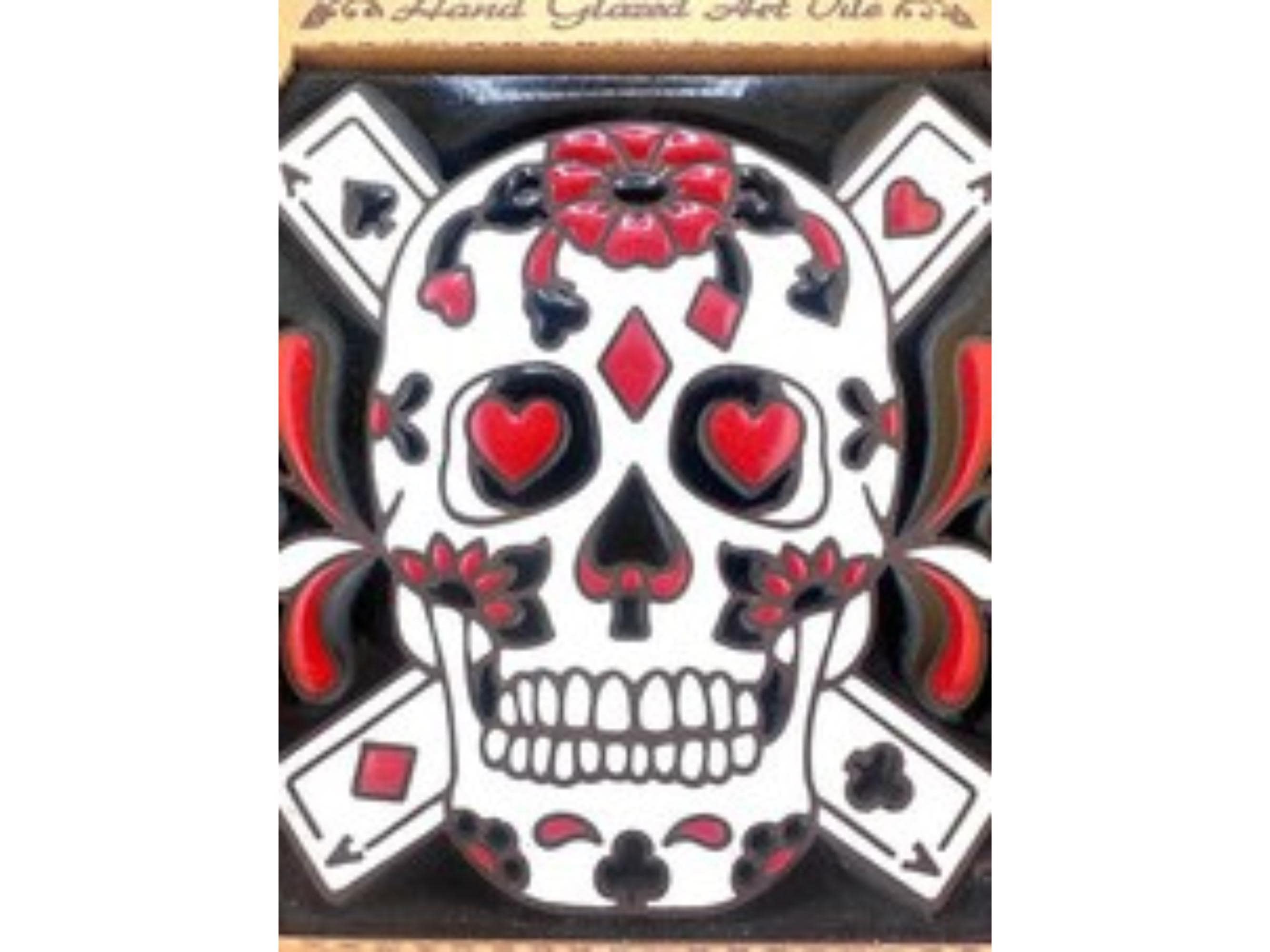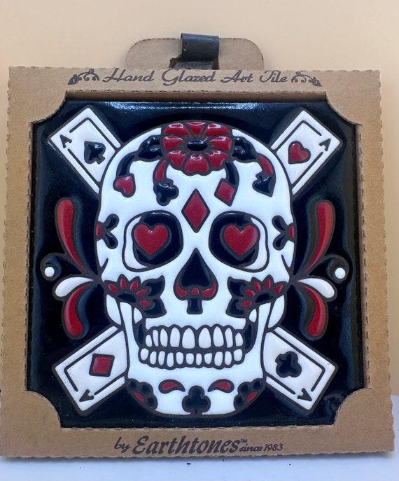 Ceramic art tile for Mexican Dia de los Muertos. This is a ceramic art tile 6" x 6" red, black and white skull in the original box. It was made by Earthtones. It is lead free and non-toxic. This decorative accent tile can be used indoors or outdoors.