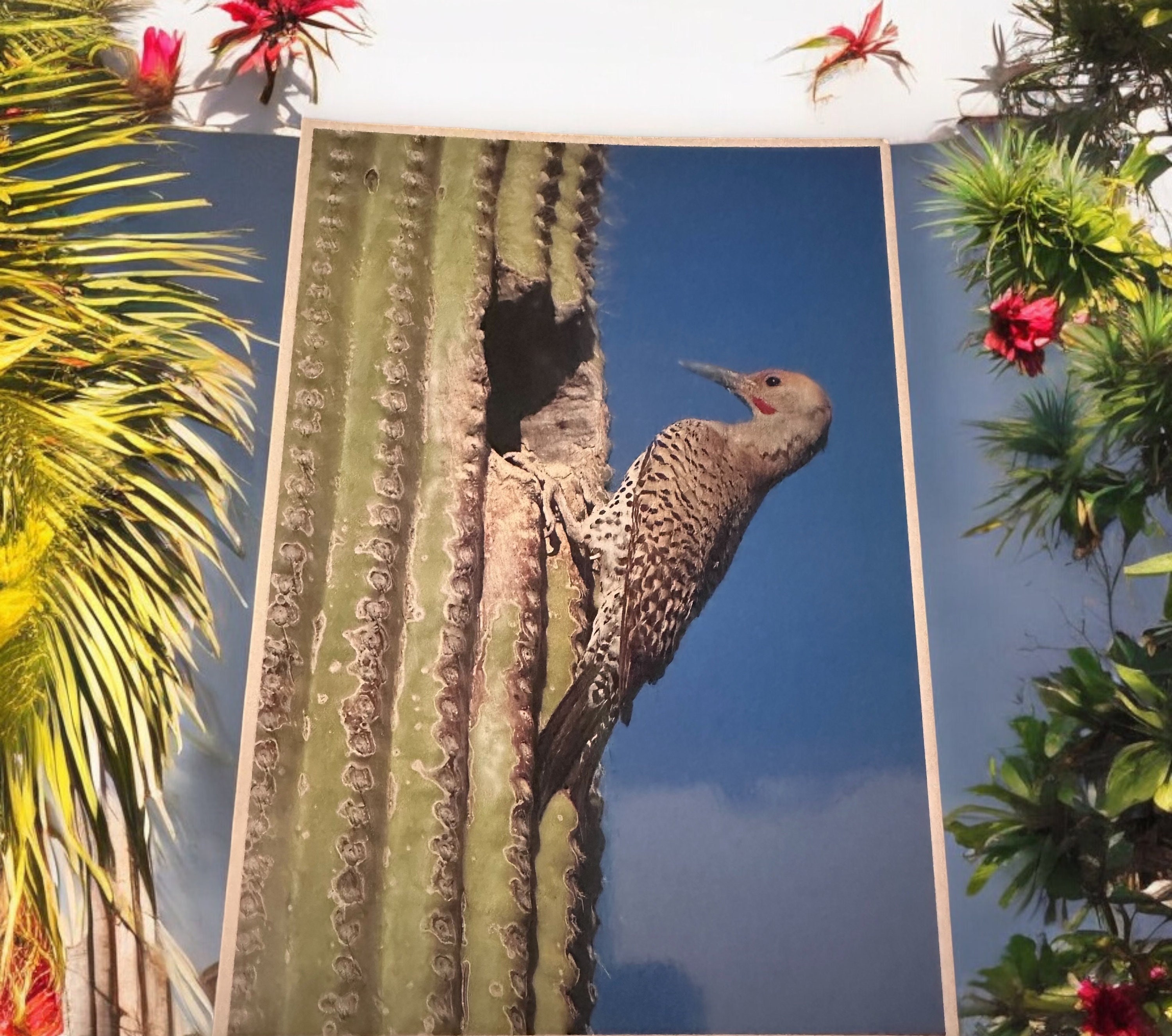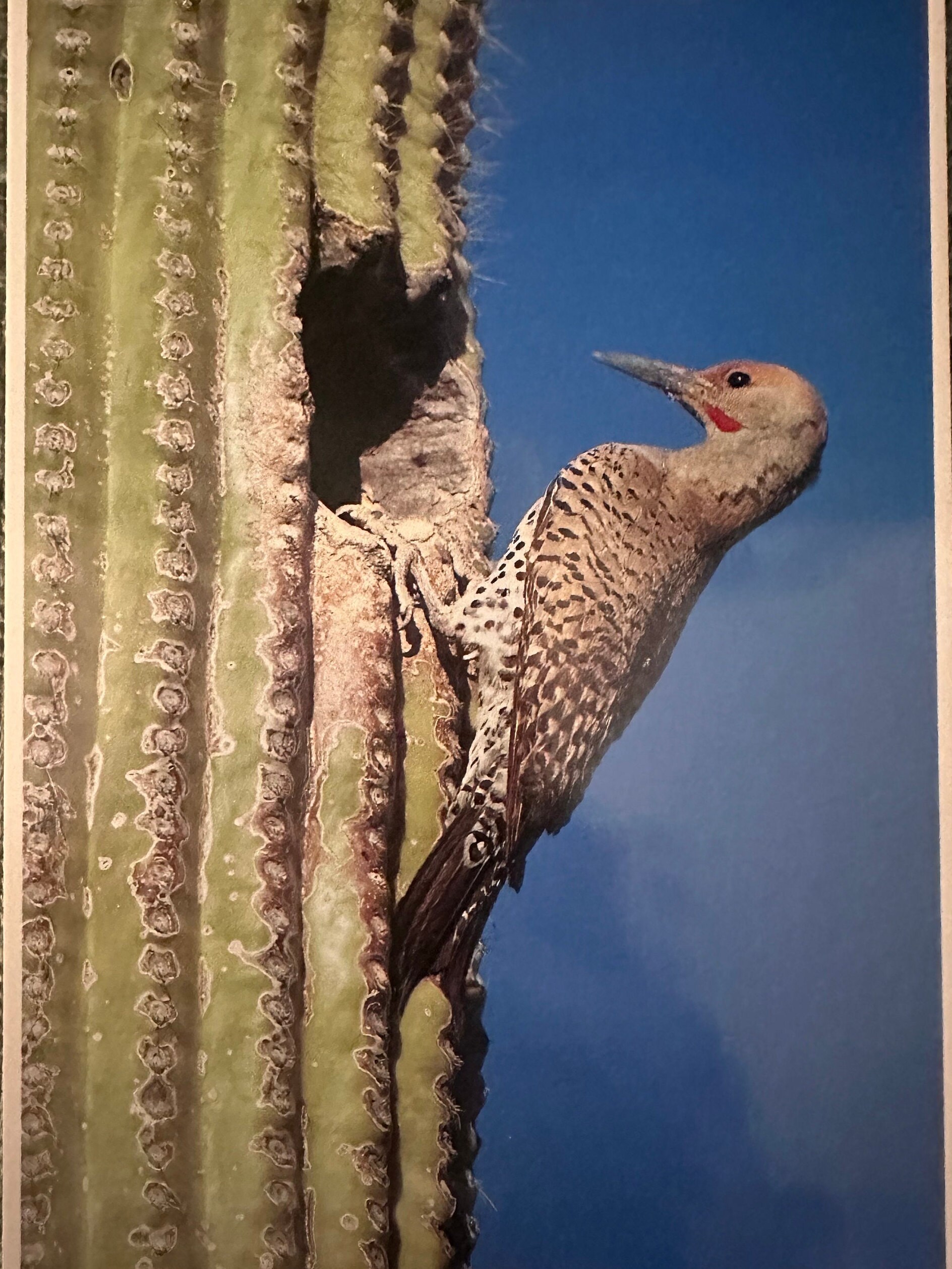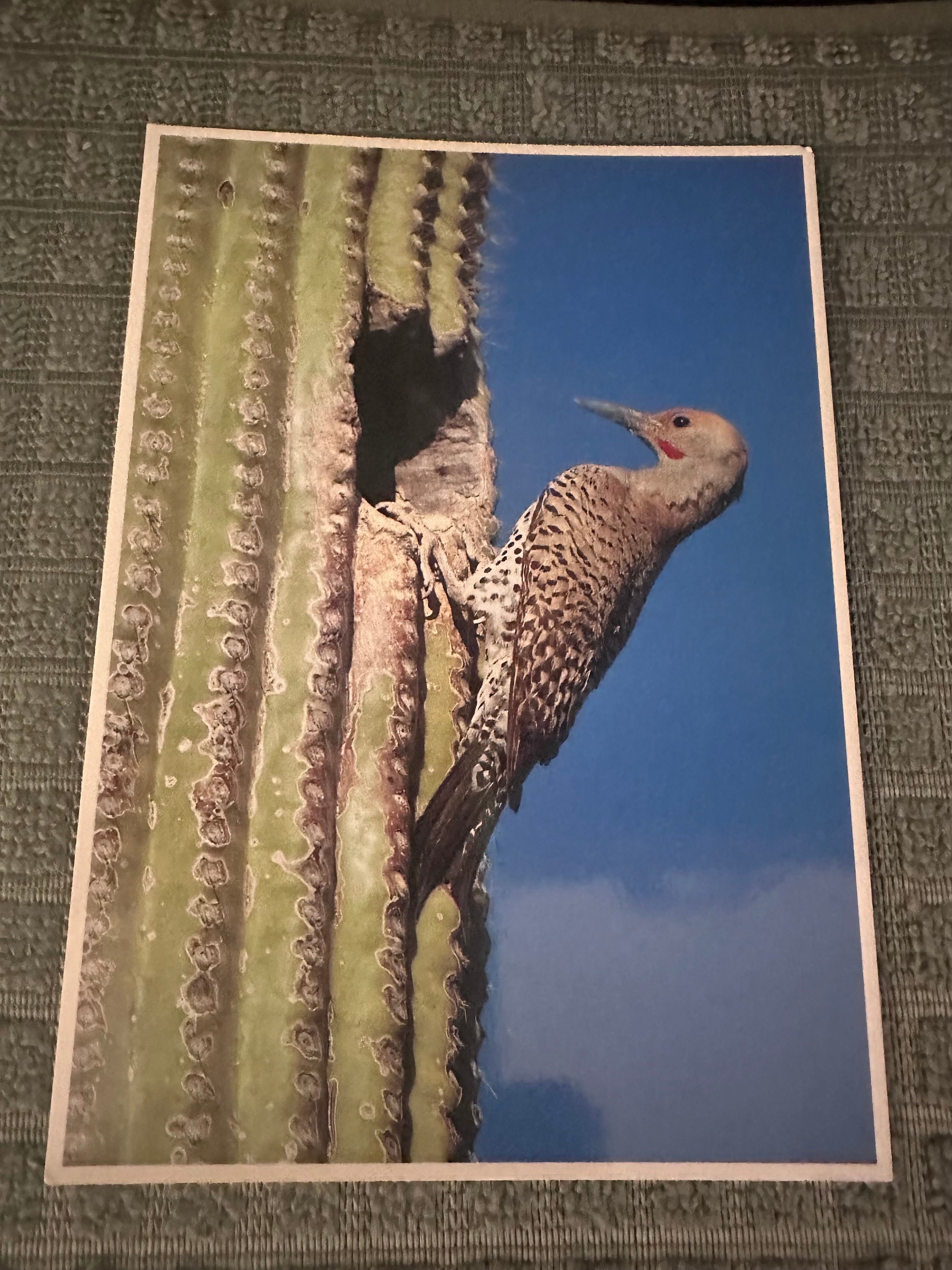 This is a vintage, like new, flicker bird postcard of the gilded flicker, also known as a common flicker. It is one of three varies of flickers. The gilded flicker has adapted to the desert environment and does not mix mix with its distant counsin: the red shafted and the yellow shafted found east of the Rockies.