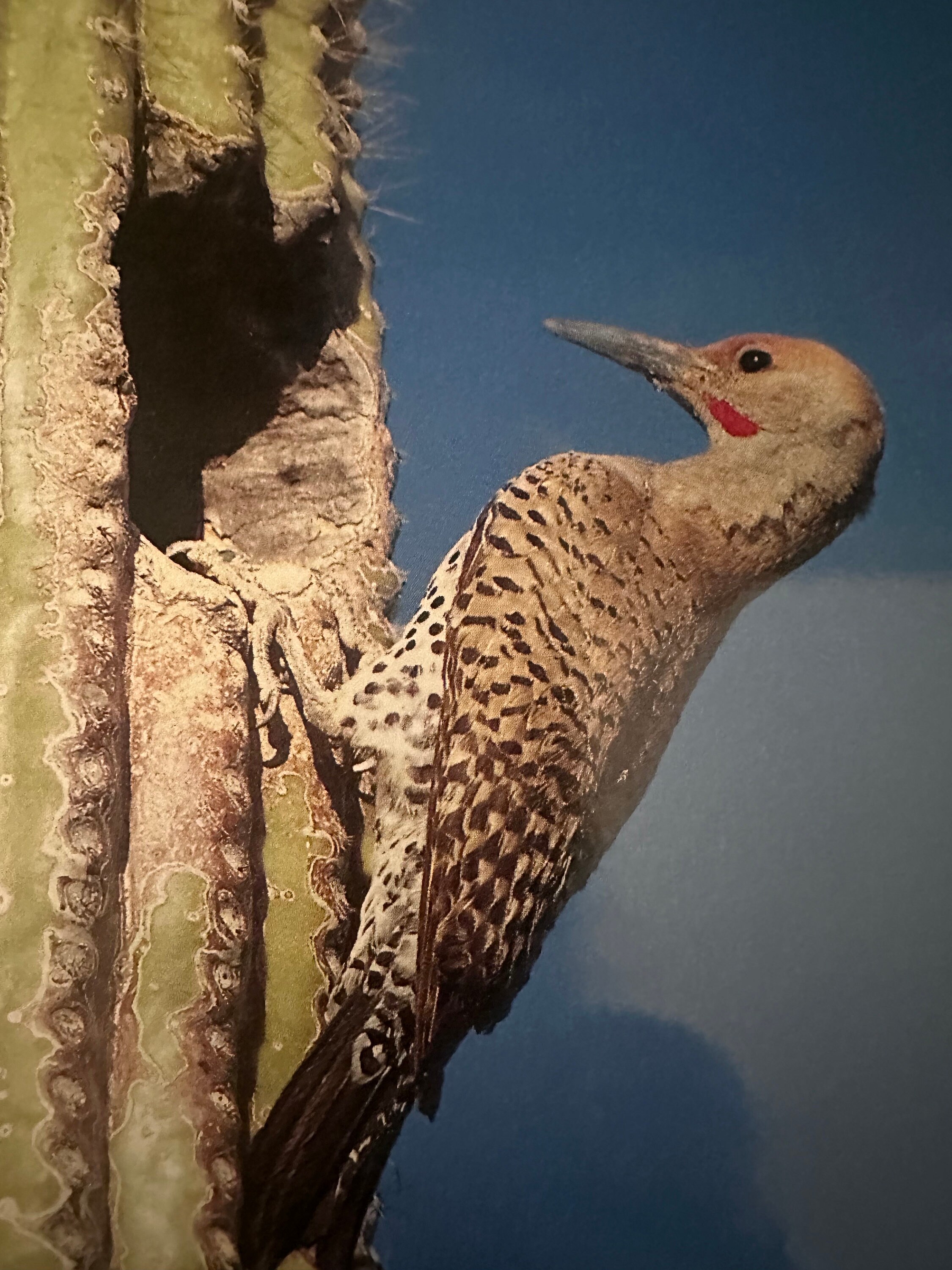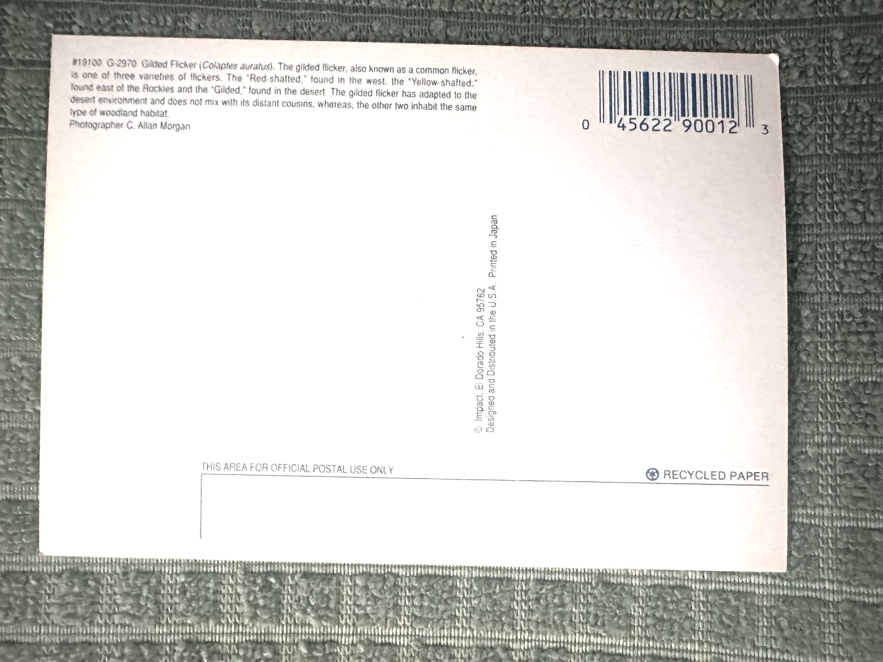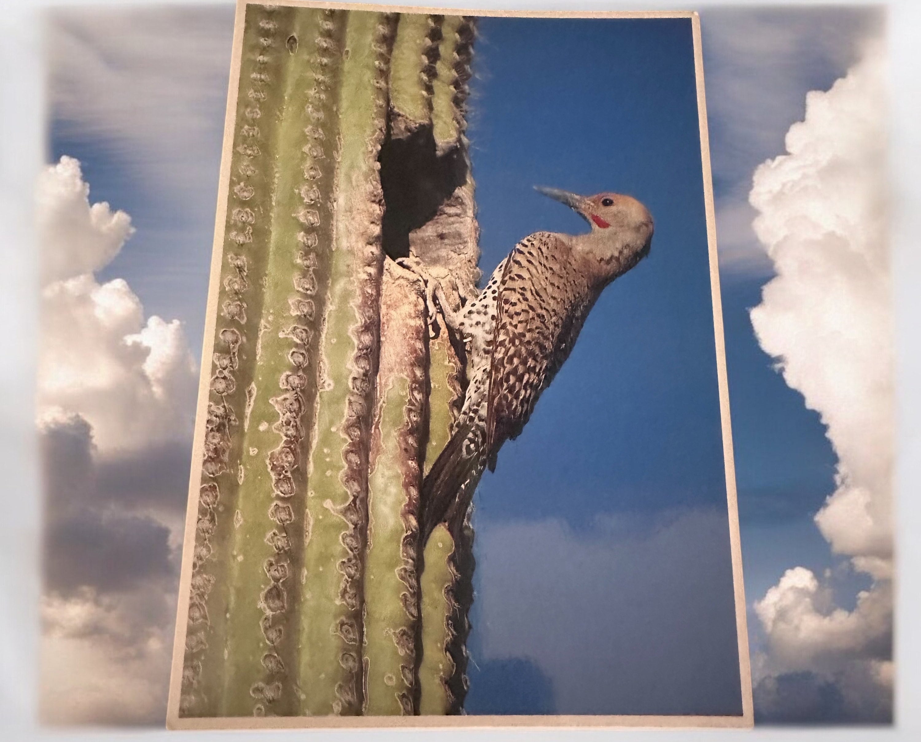 This is a vintage, like new, flicker bird postcard of the gilded flicker, also known as a common flicker. It is one of three varies of flickers. The gilded flicker has adapted to the desert environment and does not mix mix with its distant counsin: the red shafted and the yellow shafted found east of the Rockies.