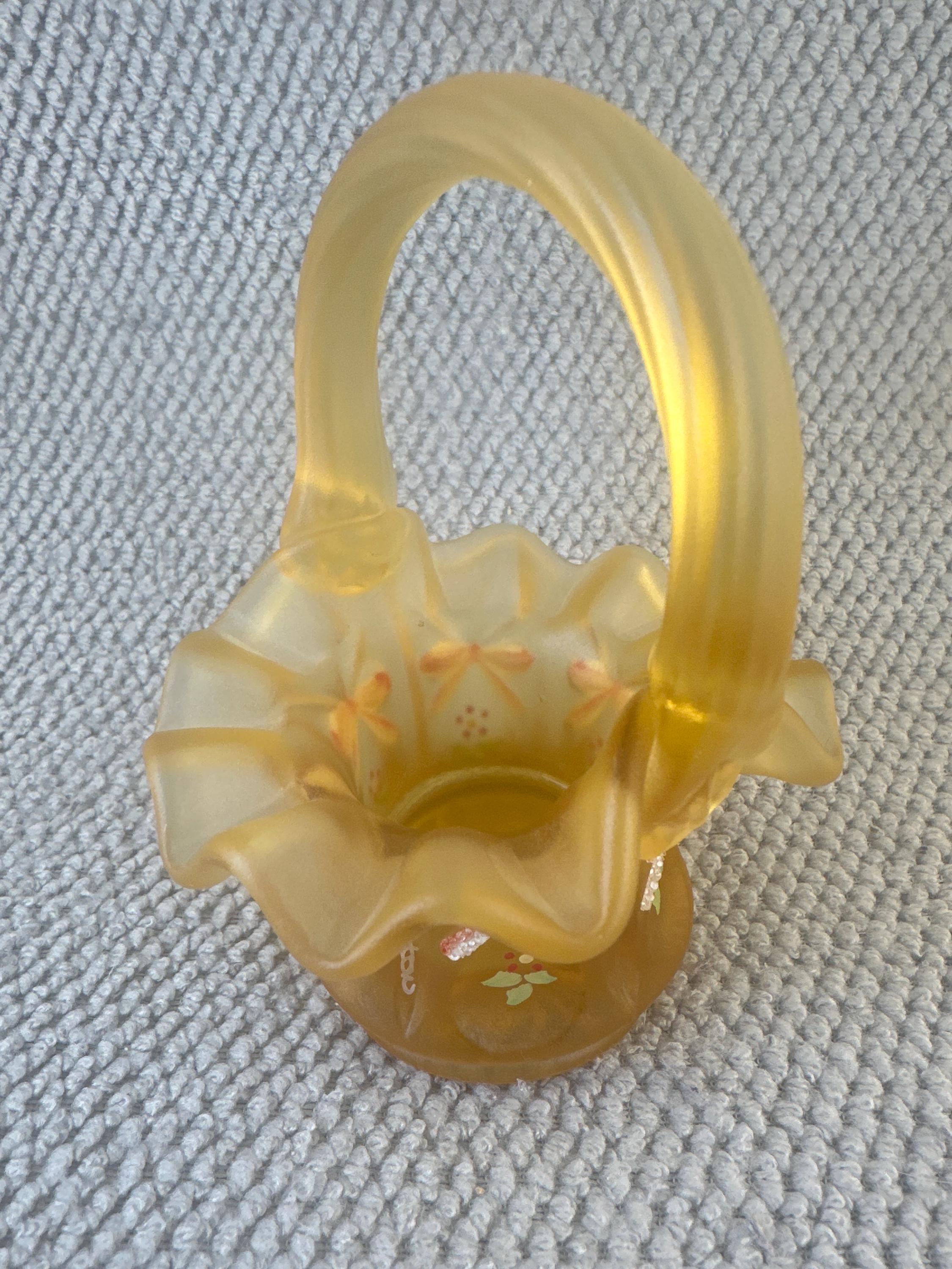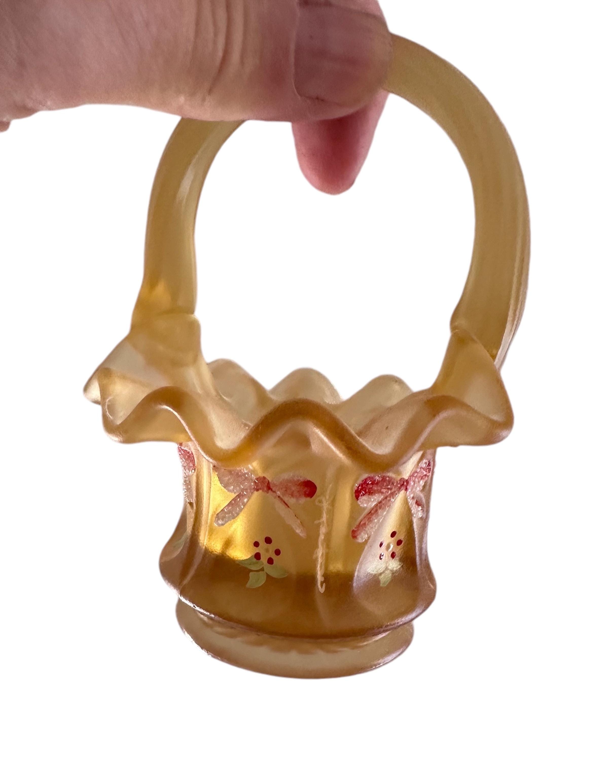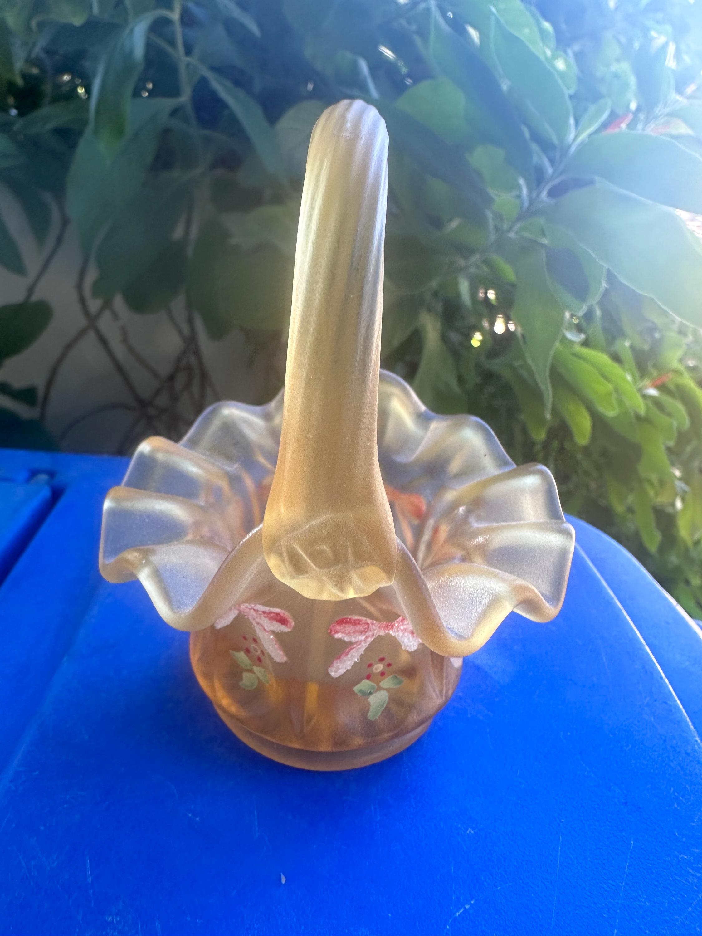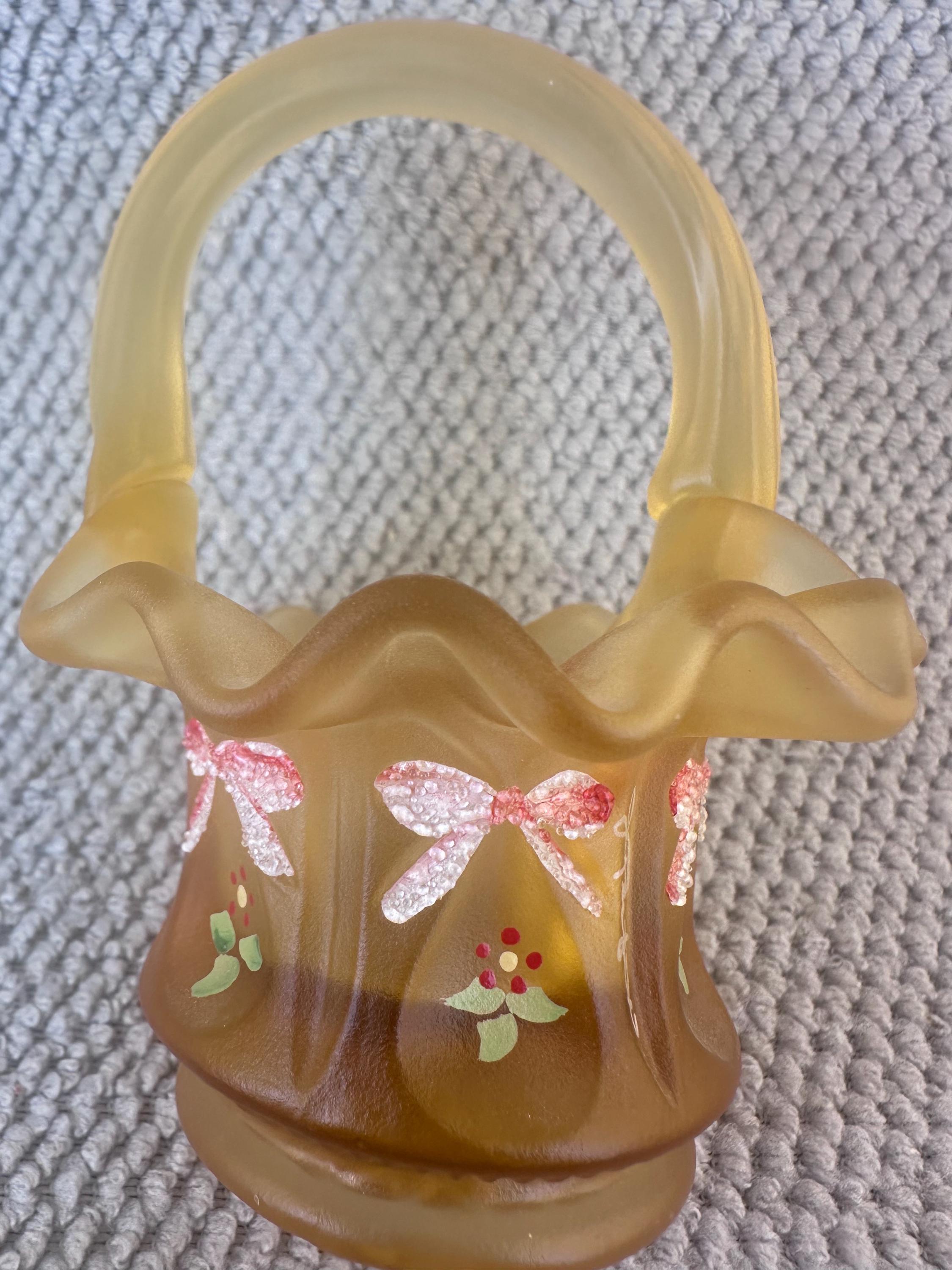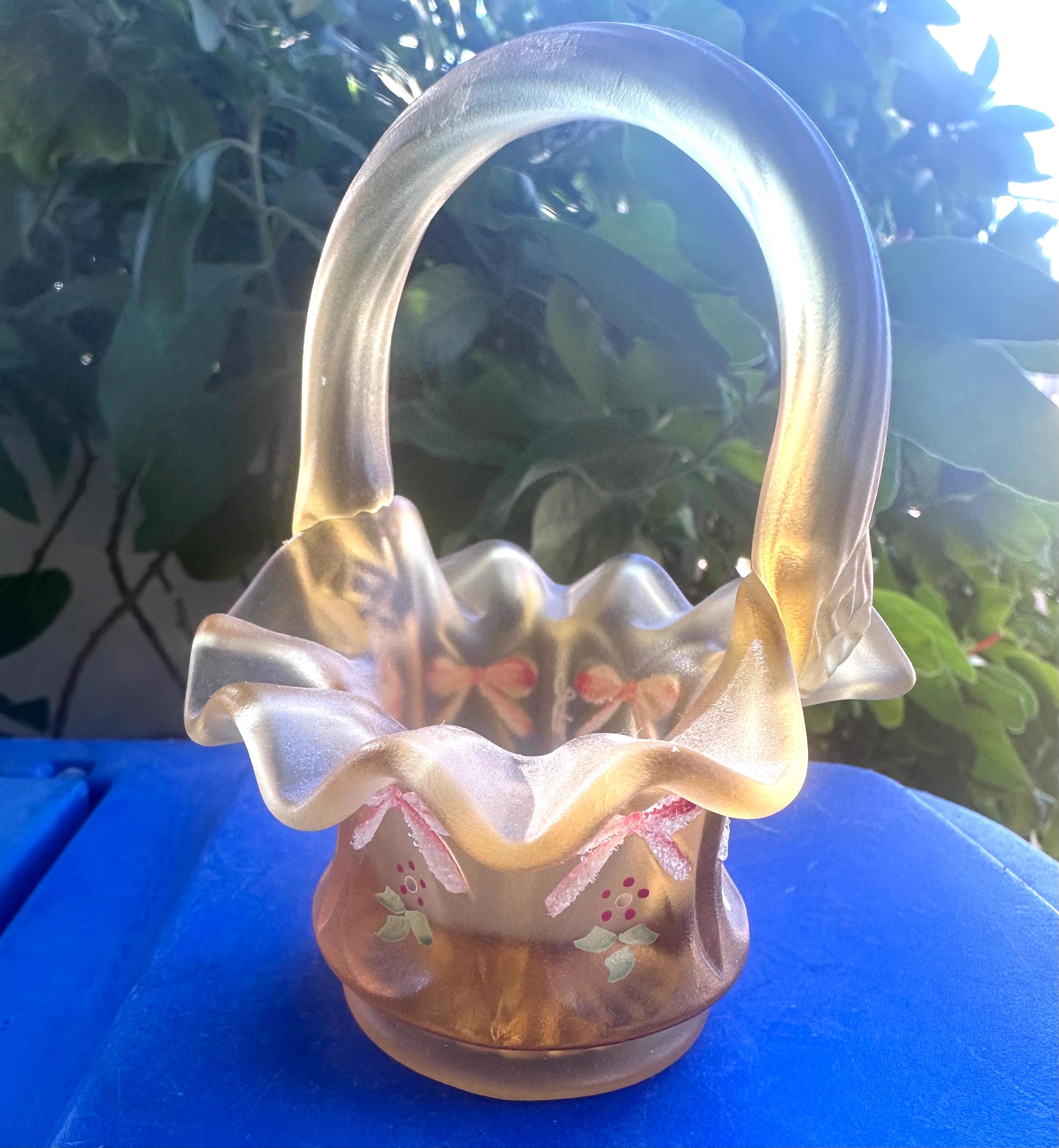 Add this rare Fenton satin glass mini basket to your collection today to enjoy a genuine vintage treasure. Limited availability means this piece won’t last long—shop with confidence knowing we prioritize careful packaging and attentive customer service to ensure your new heirloom arrives safely.This is a sweet ruffled edged gift basket that is hand painted with bows and flowers. It is marked with "F" on the bottom. It is a great gift for a Fenton Lover.