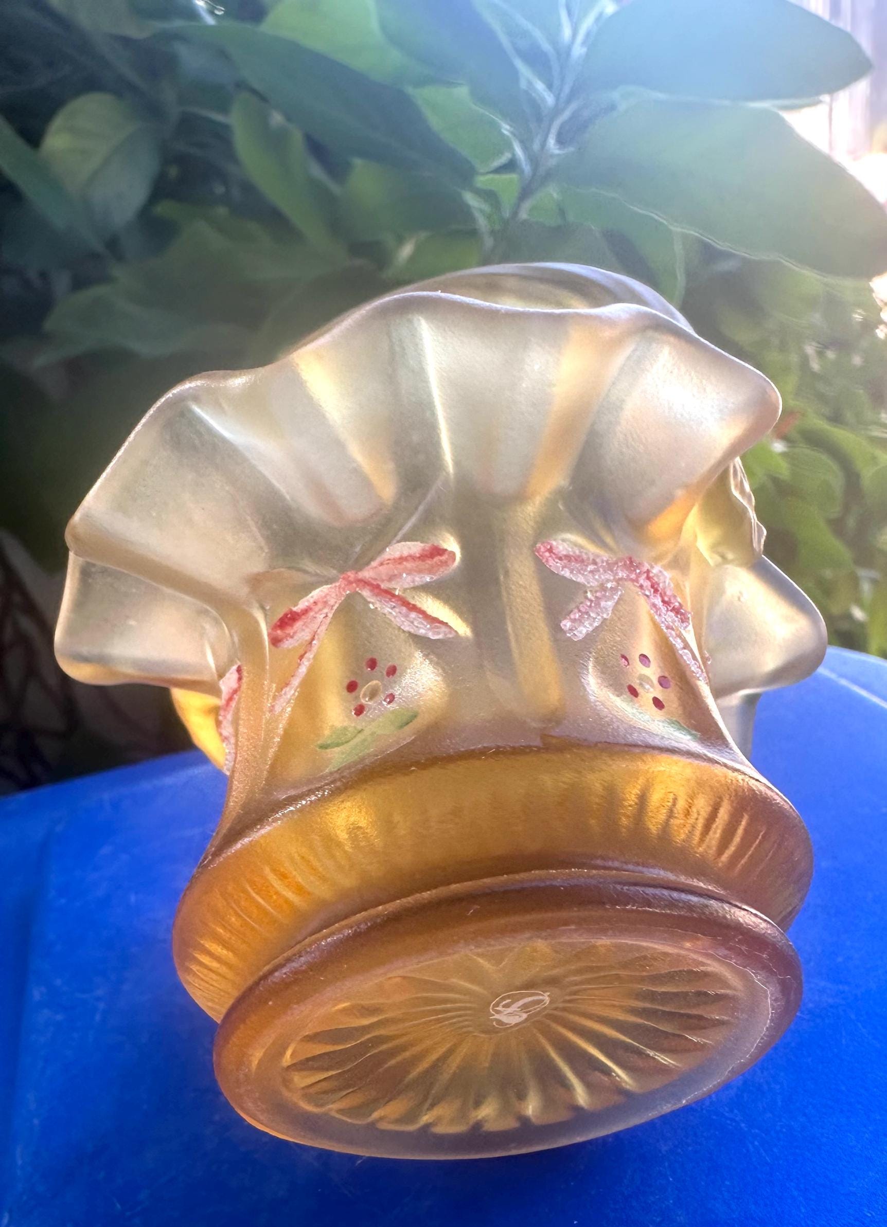 Crafted with meticulous attention to detail, this little mini basket measures approximately 4 inches wide and 3 inches tall, designed from high-quality satin glass with a ruffled edge that captures soft light subtly. Each hand-painted flower and bow adds character, making every basket truly one-of-a-kind. This artisan craftsmanship ensures a lasting collector's item that brings warmth and sophistication to any display.