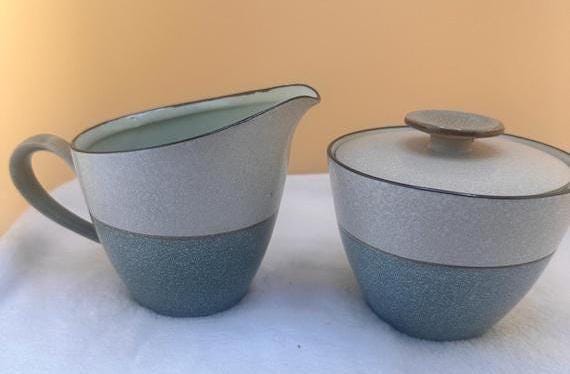 Ucago beige and green stoneware cream and sugar bowl from Japan. The Medallion pattern has a botanical leaf design in the center of the dish. The creamer measures 3 7/8" high and holds 10 fluid ounces. The sugar bowl measues 3 1/2" high.