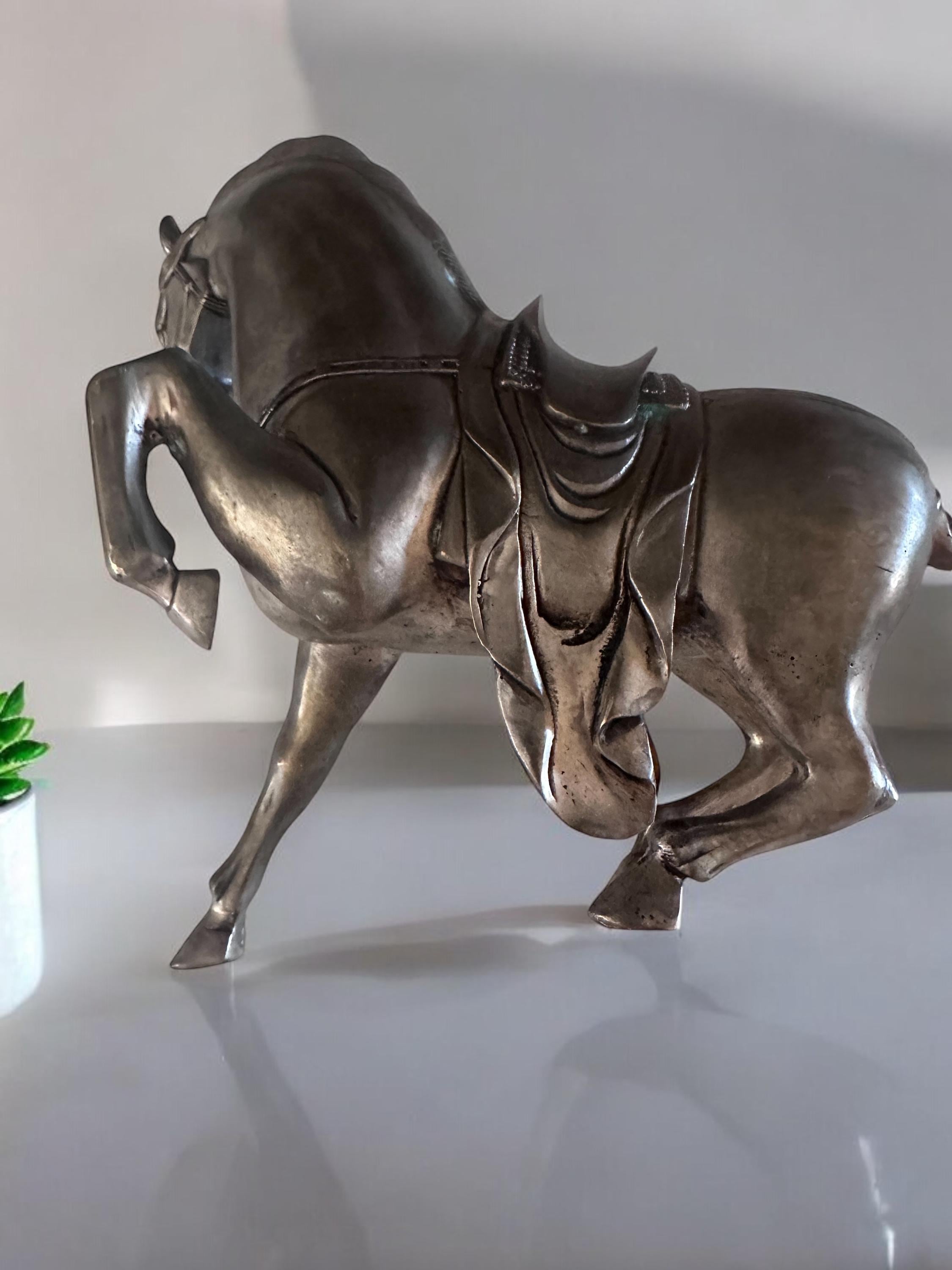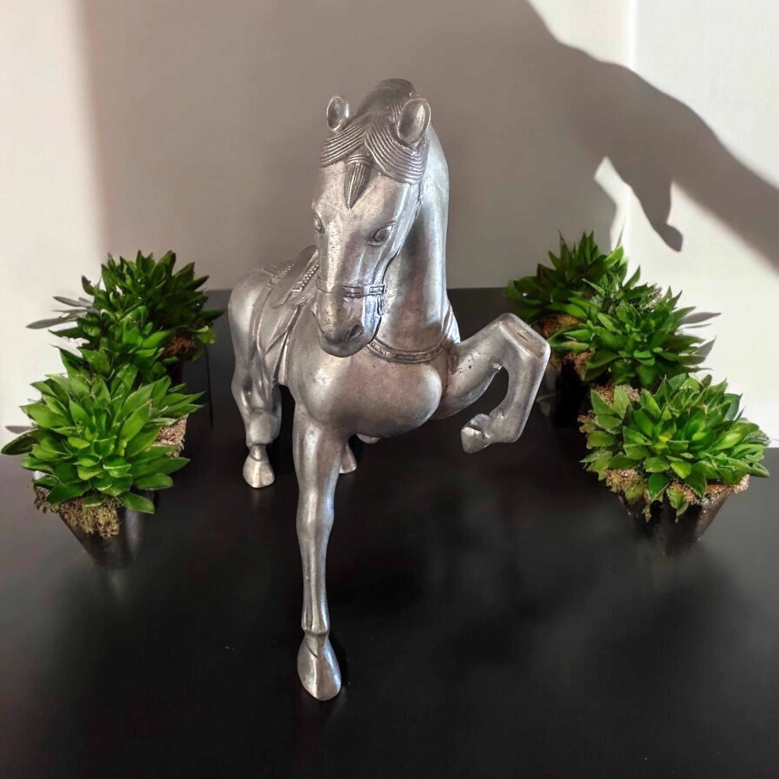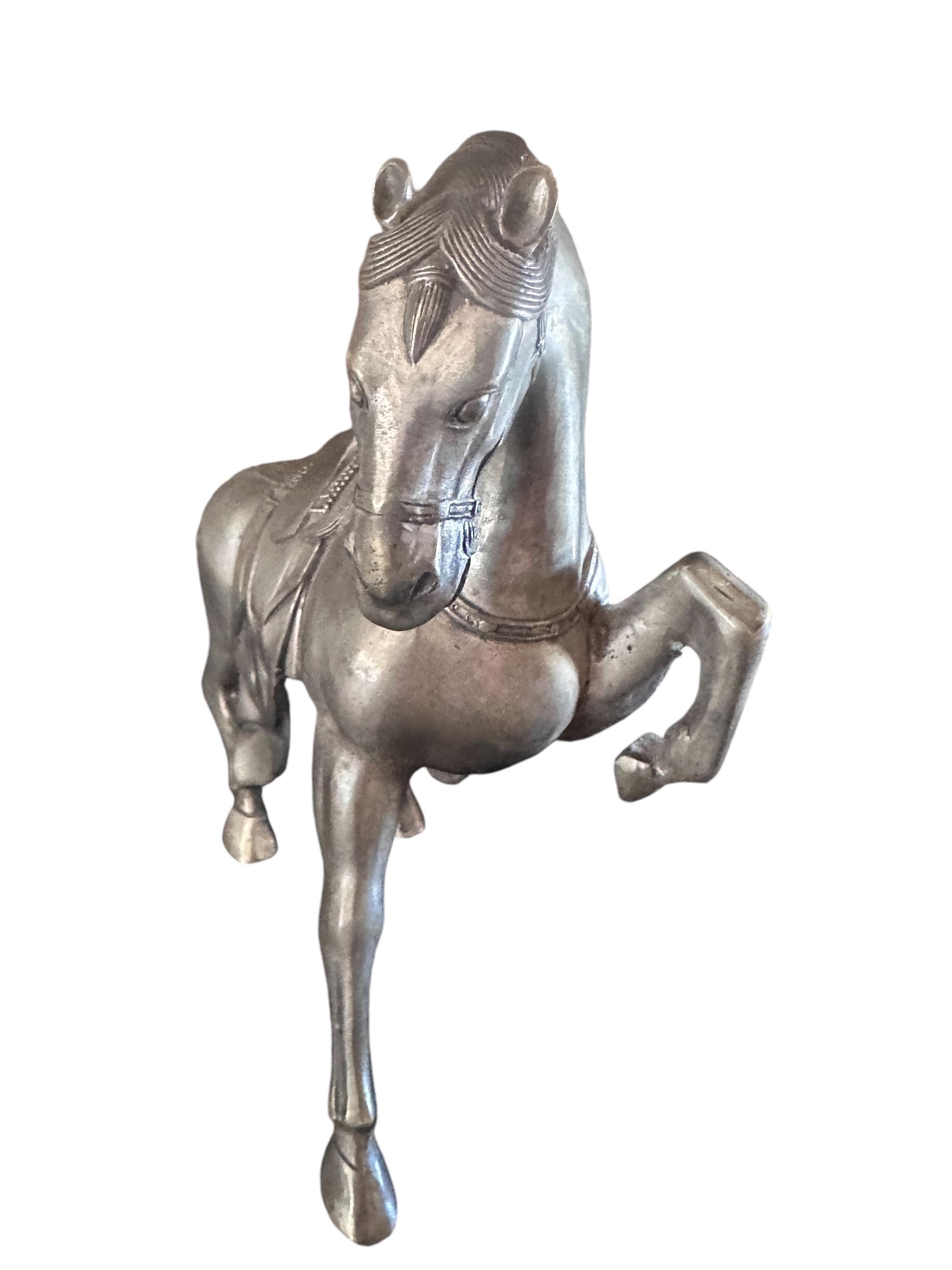 Celebrate the spirit of equine beauty with our stunning Silver Metal Horse Sculpture, a unique animal collectible that adds elegance to any home decor. Perfect as a horse gift for him, this exquisite piece not only showcases the majesty of stallions but also evokes a sense of connection to nature—add it to your collection today and let your passion for horses shine!Elevate your home decor with this exquisite silver colored metal horse sculpture, a rare vintage Fengshui piece that beautifully embodies grace and prosperity, making it a perfect collectible horse lover gift.
