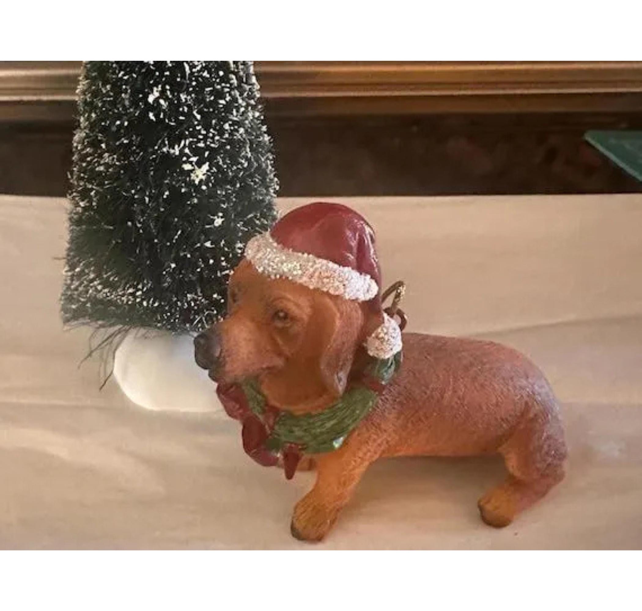 This is a Dachshund dog Christmas tree ornament. Complete with a Christmas hat and wreath, this resin made Dachshund dog would make a great stocking stuffer.