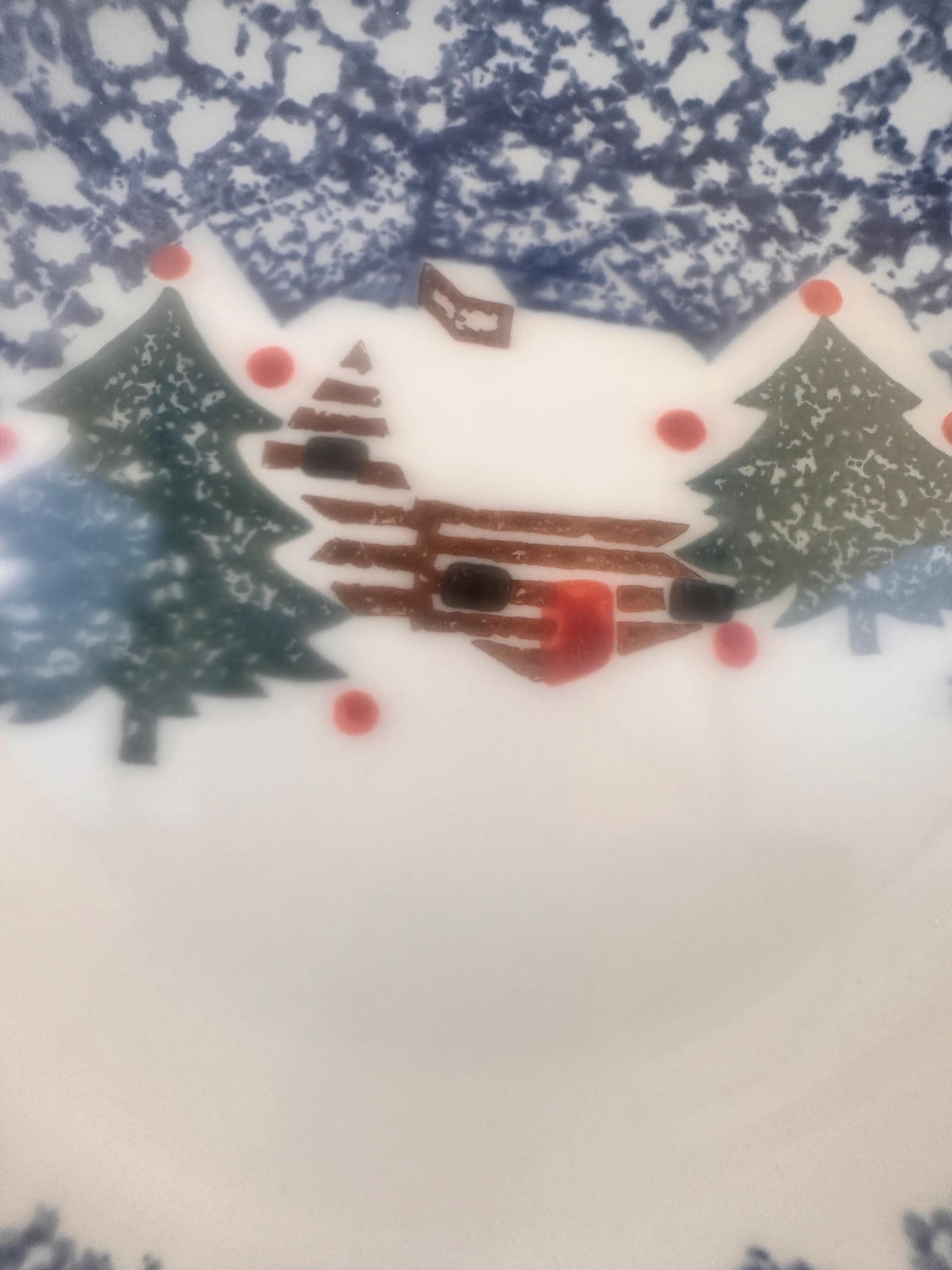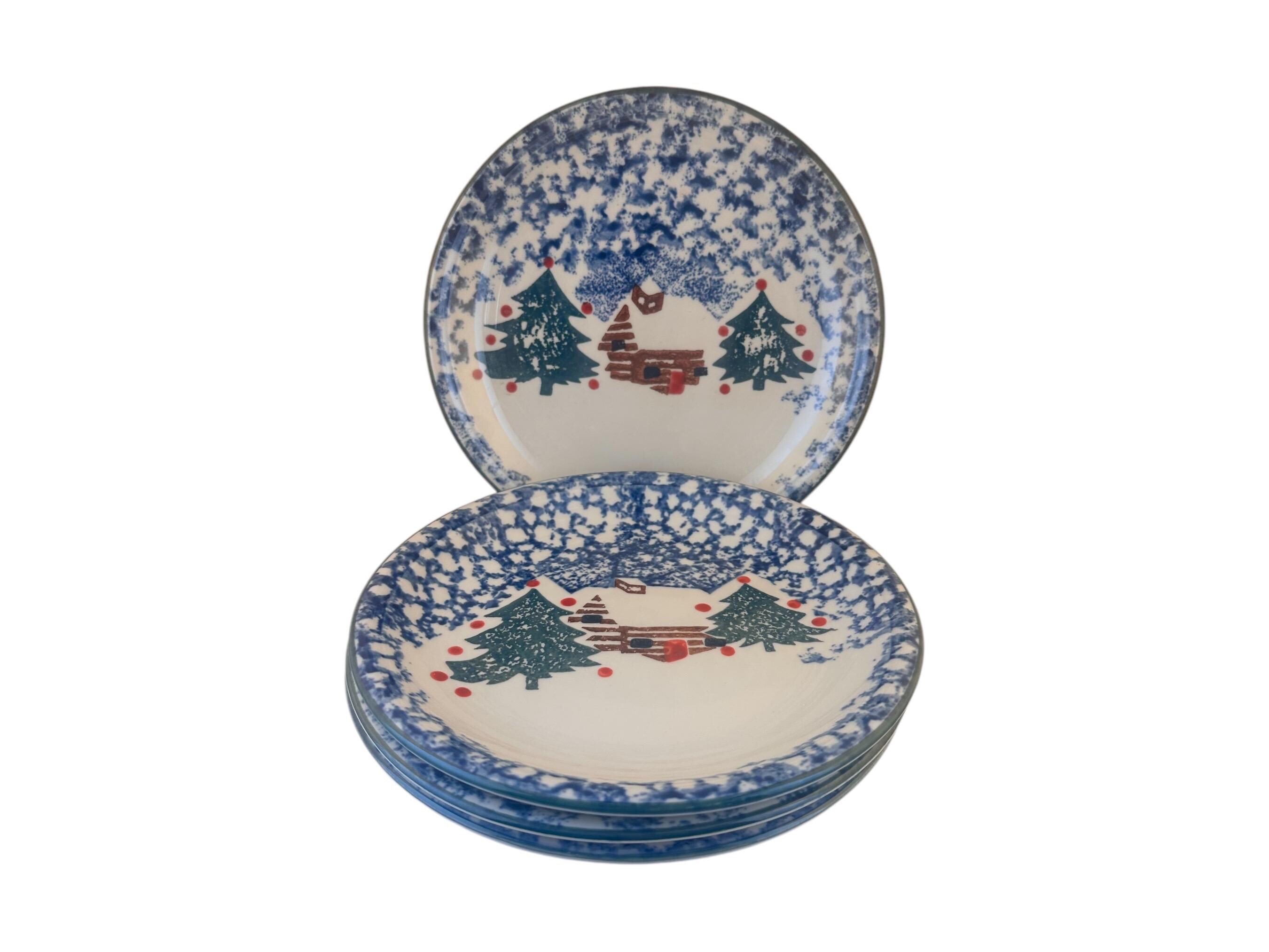 Tienshan Stoneware Folk Craft Cabin in the Snow Salad Plates Set | Rustic Cottagecore Spongeware Dinnerware | Shabby Chic Kitchen Decor
