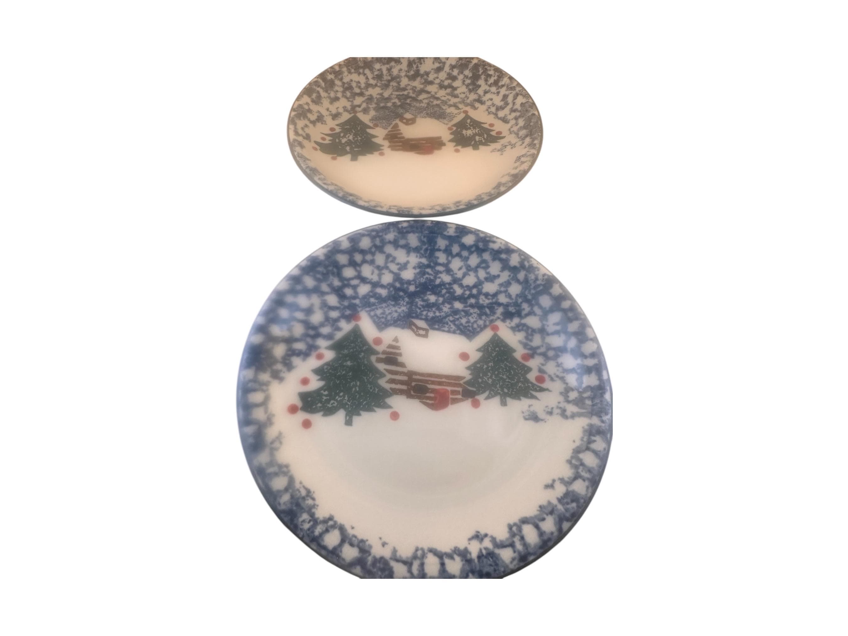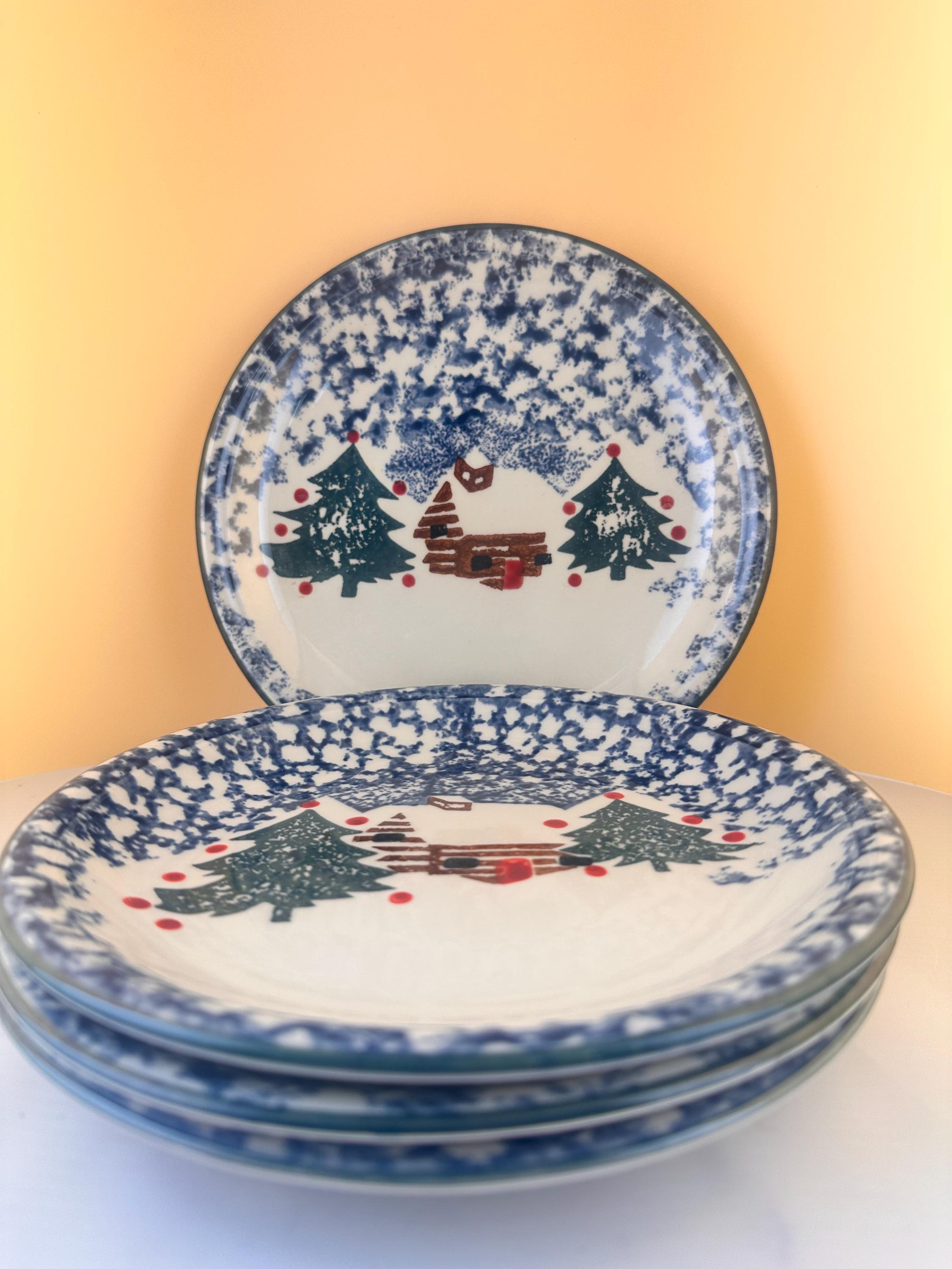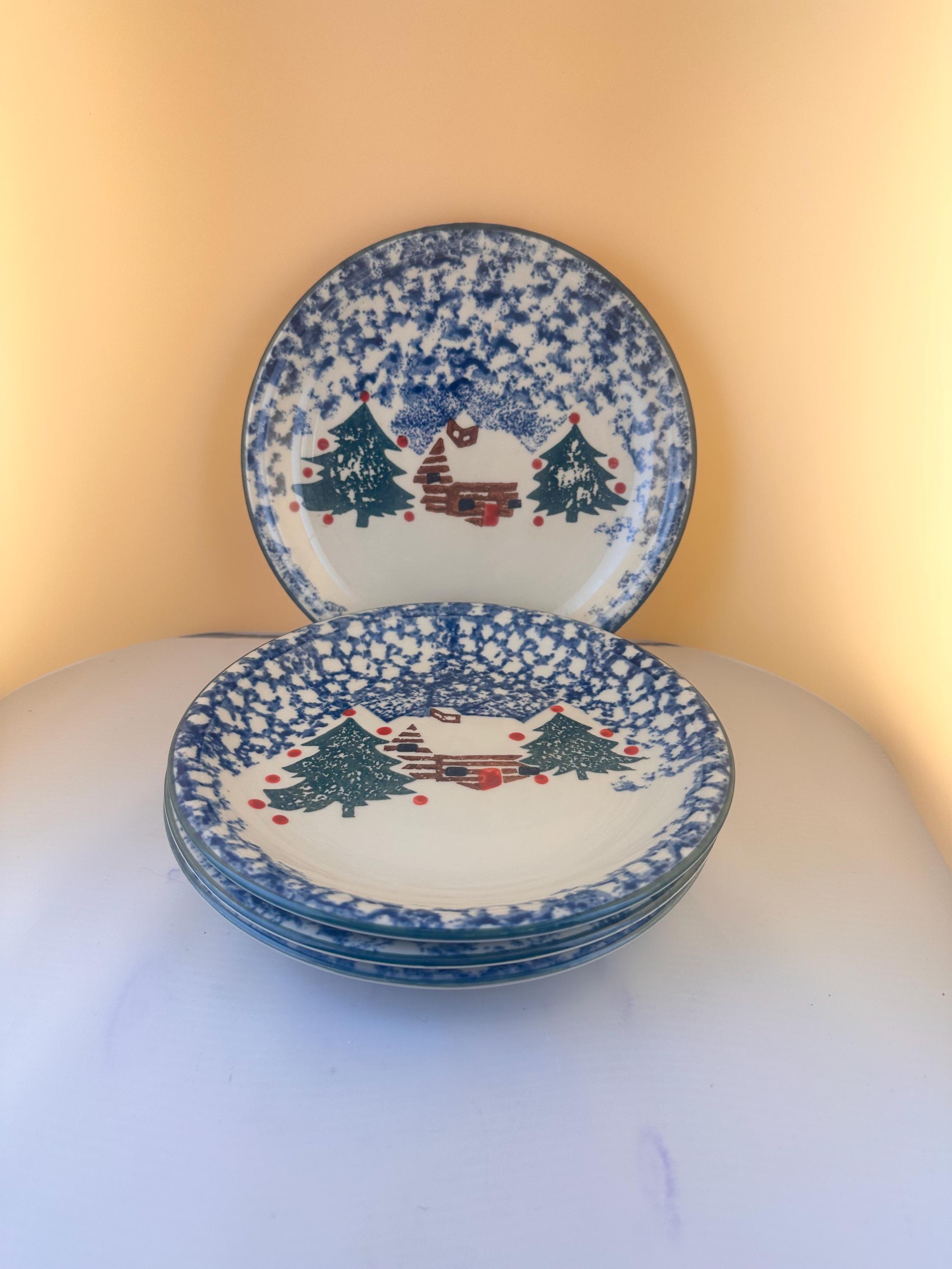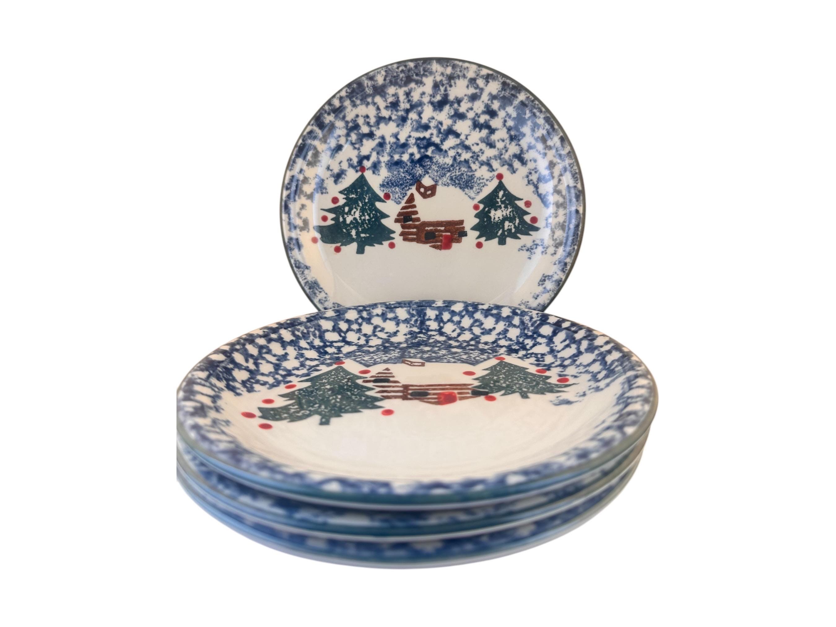 Bring warmth and charm to your dinner table with our Folk Craft Plates featuring a serene Cabin in the Snow design, perfect for adding a touch of rustic elegance to your meals. These beautifully crafted sponge ware plates not only enhance your culinary experience but also make an ideal gift for her—embrace the spirit of cozy gatherings and elevate your dining with these unique, handcrafted collectibles!Set of four vintage Folk Craft Cabin in the Snow salad plates in excellent condition. These plates are made by Tienshen.