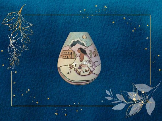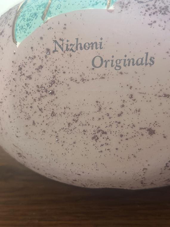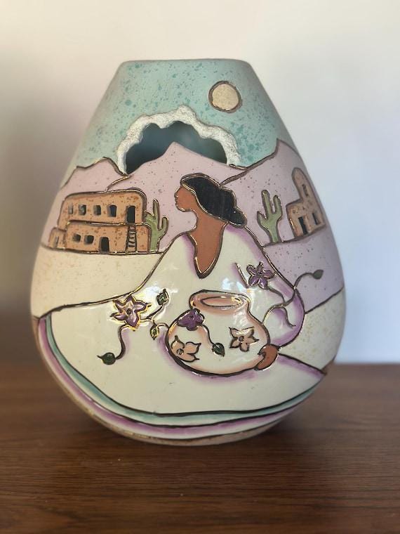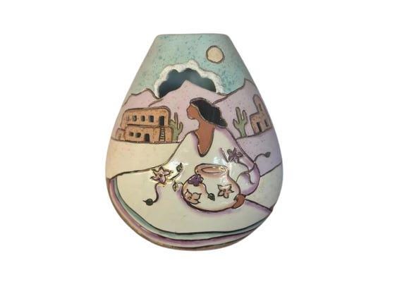 This is a Nizhoni Original Navajo Native American bride wedding pot. It is decorated in pastel colors and adorned in 24K gold paint. It measure 9.5" tall x 8" wide at the widest part. It is in excellent condition. Wonderful wedding gift.