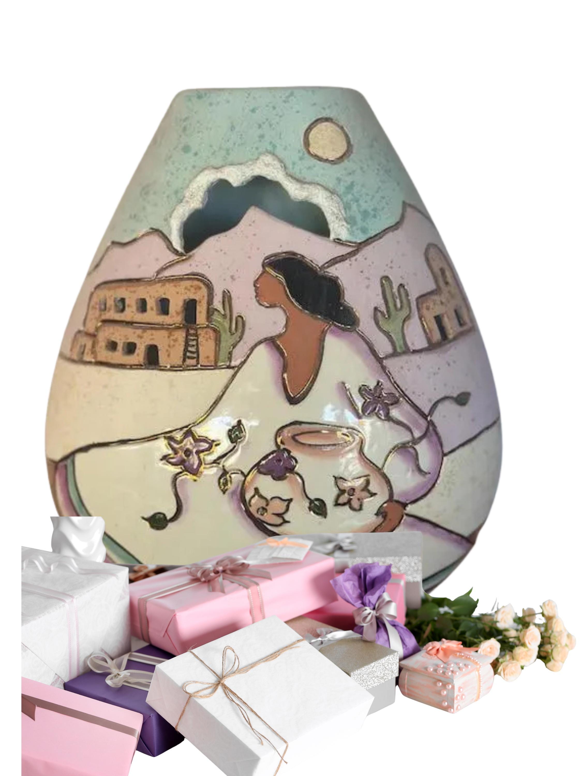 Transform your space with this striking Southwestern studio art pottery vase, a Nizhoni original that beautifully showcases intricate Native American craftsmanship and the luxurious touch of 22K gold. Perfect as a thoughtful gift for her, this unique piece not only adds warmth to your home but also serves as a meaningful connection to rich cultural heritage—don't miss the chance to own this stunning artwork!