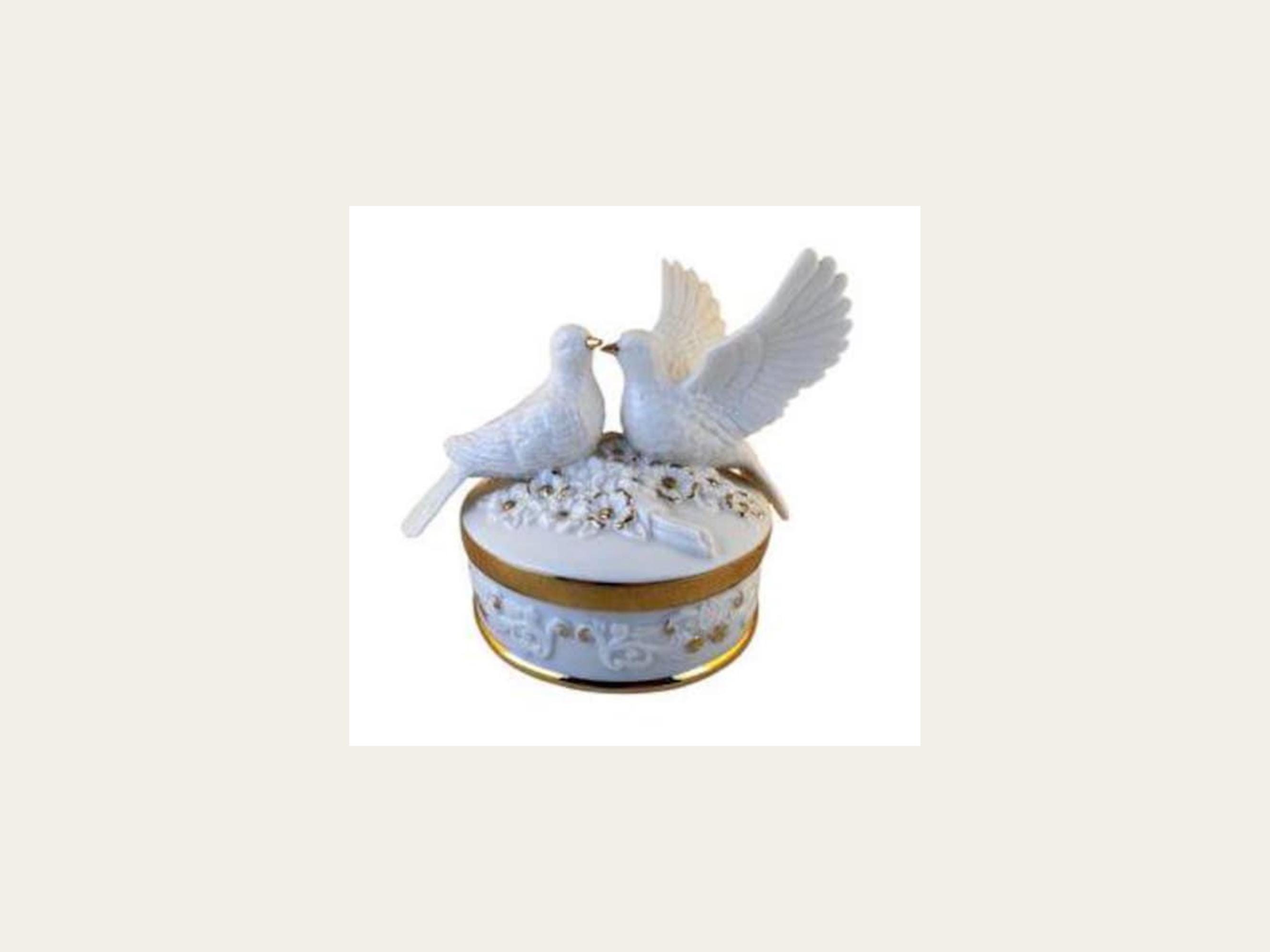 Music Box, Create a whimsical atmosphere in your home with our enchanting white porcelain gold-encrusted turtle doves music box, a perfect blend of artistry and nostalgia that plays a sweet melody. Plays "Everything is Beautiful" tune.