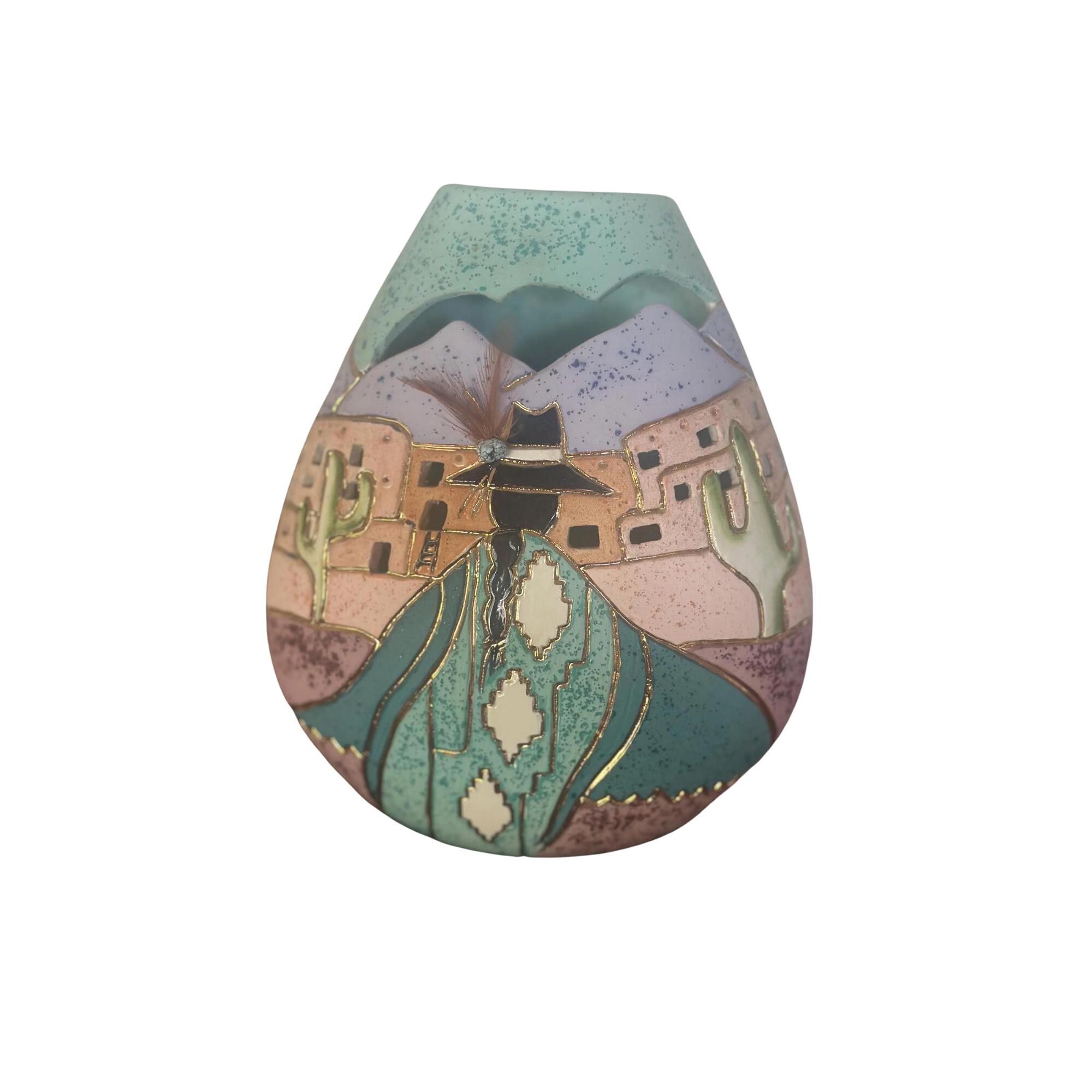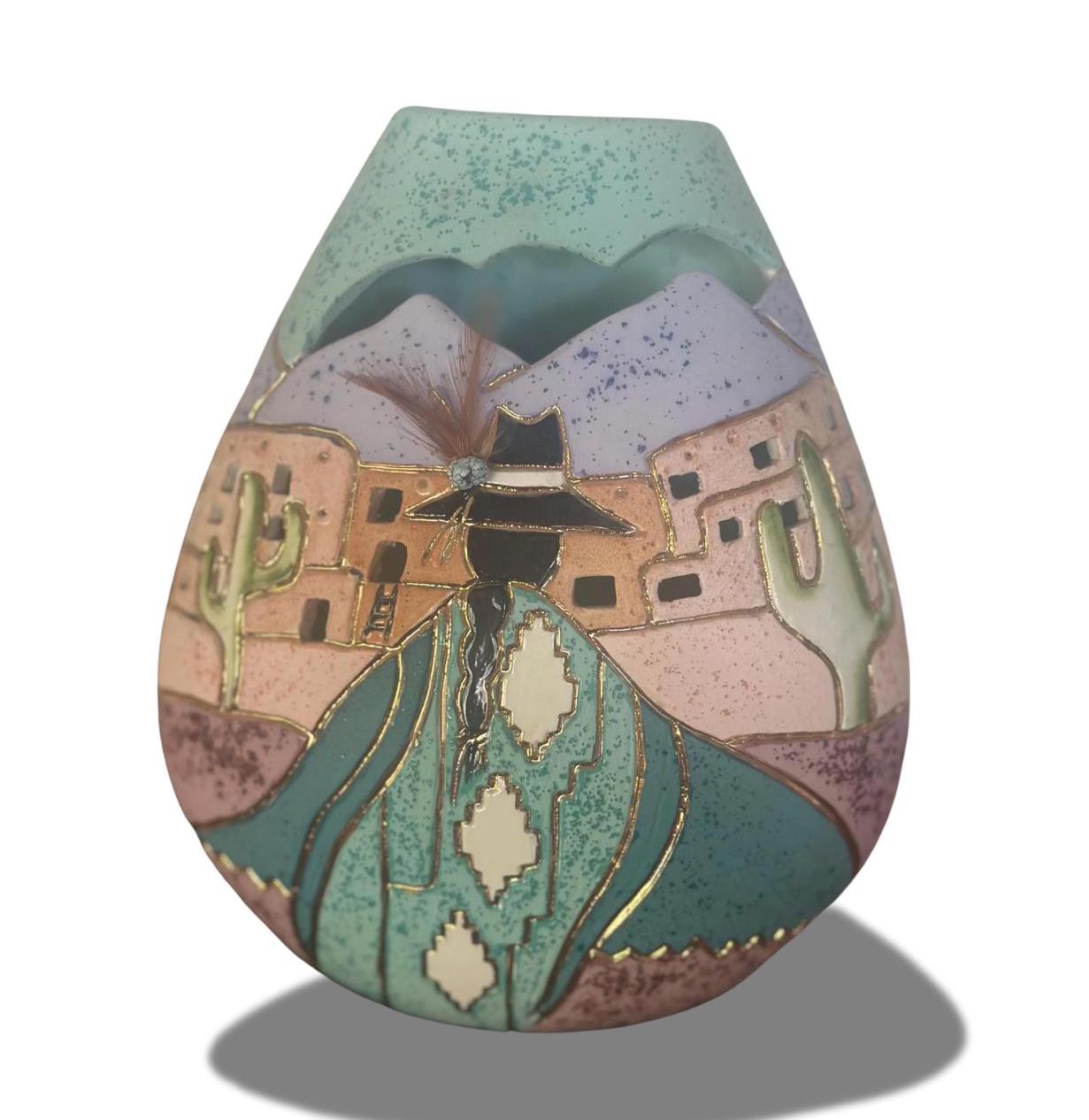 This is a Nizhoni Original Navajo Native American groom wedding pot is decorated in pastel colors and adorned in 24K gold paint. It measures 9.5" tall x 8" wide at the widest part. It is in excellent condition.