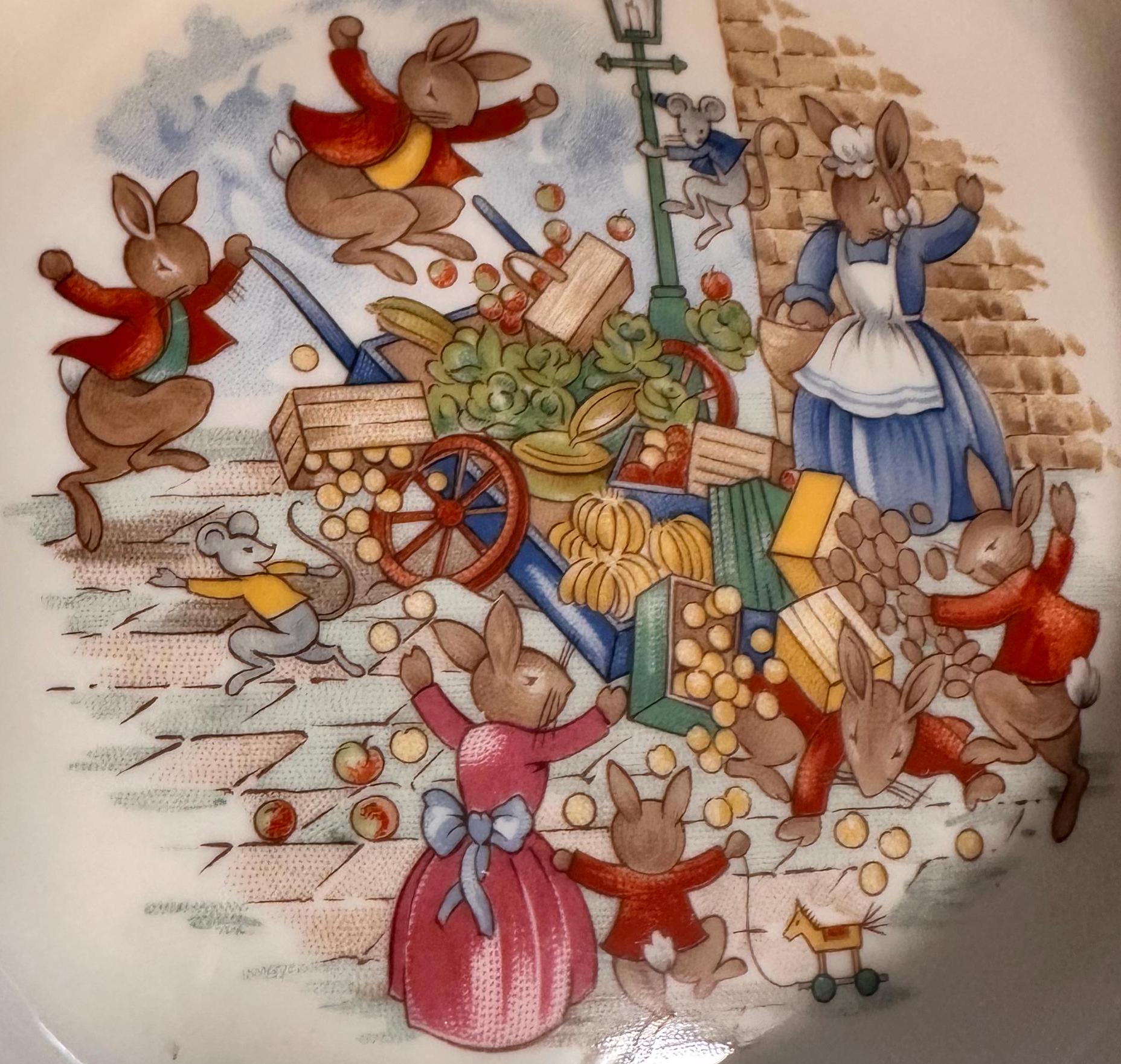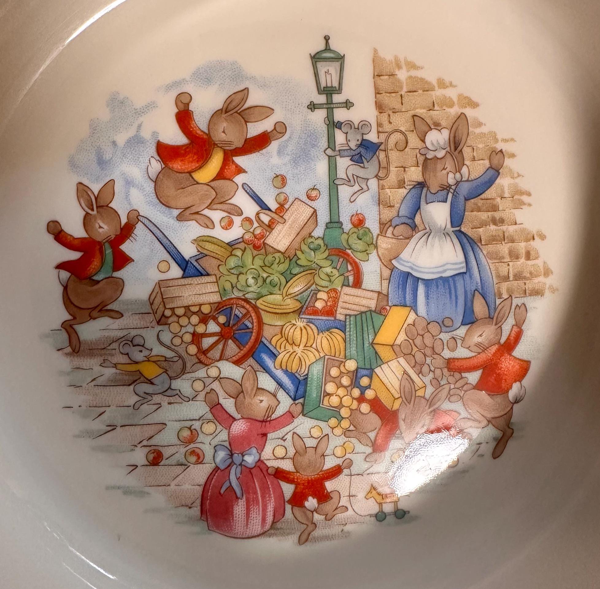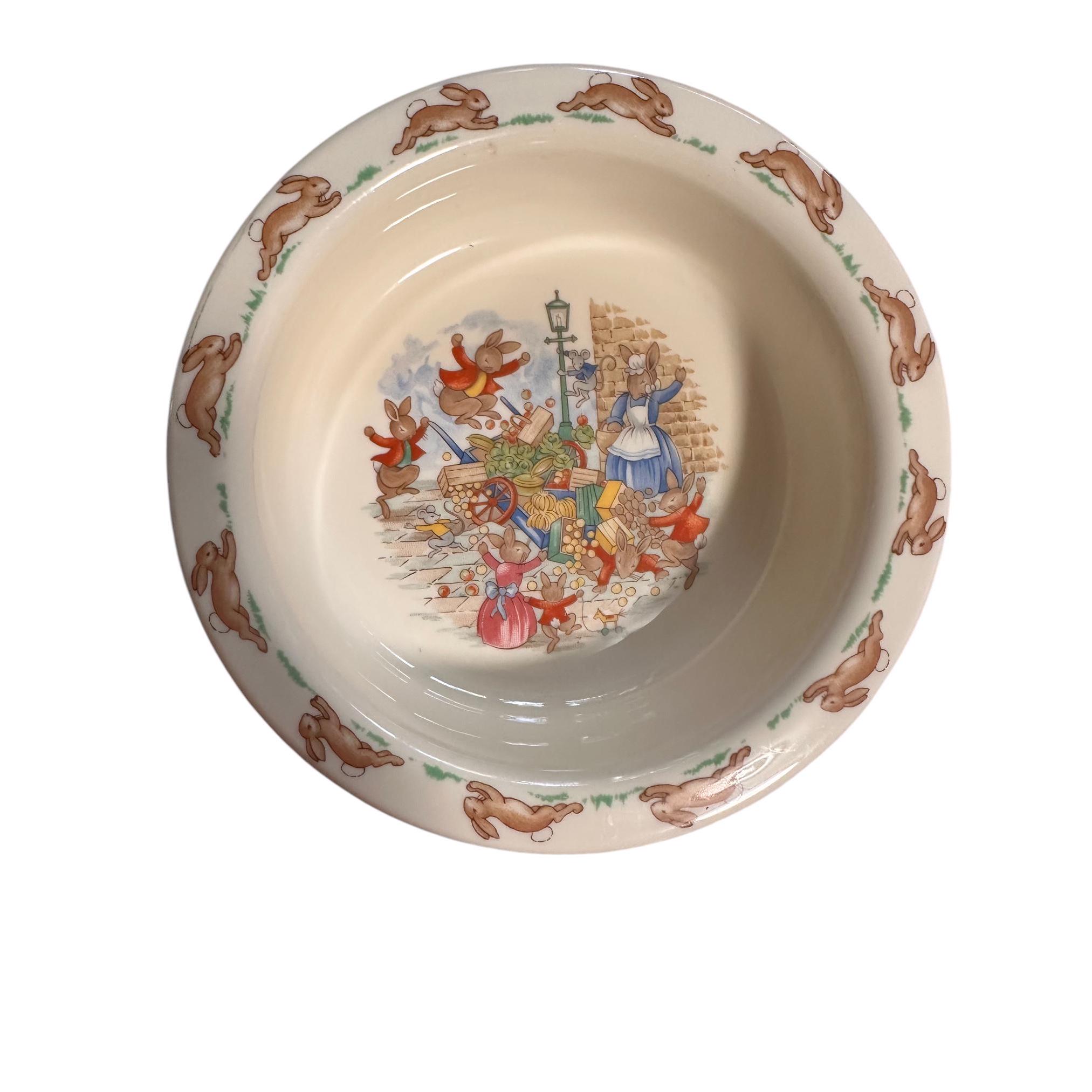 This is a beautiful vintage Bunnykins bunny cereal bowl by Royal Doulton. The bone china cereal bowl is for a child. It is in very good condition. The bowl was made in England. It measures 6.25" in diameter. It is a rimmed bowl with bunny rabbits on the rim. It measures 1.5" deep.