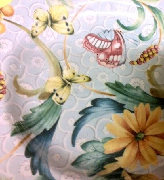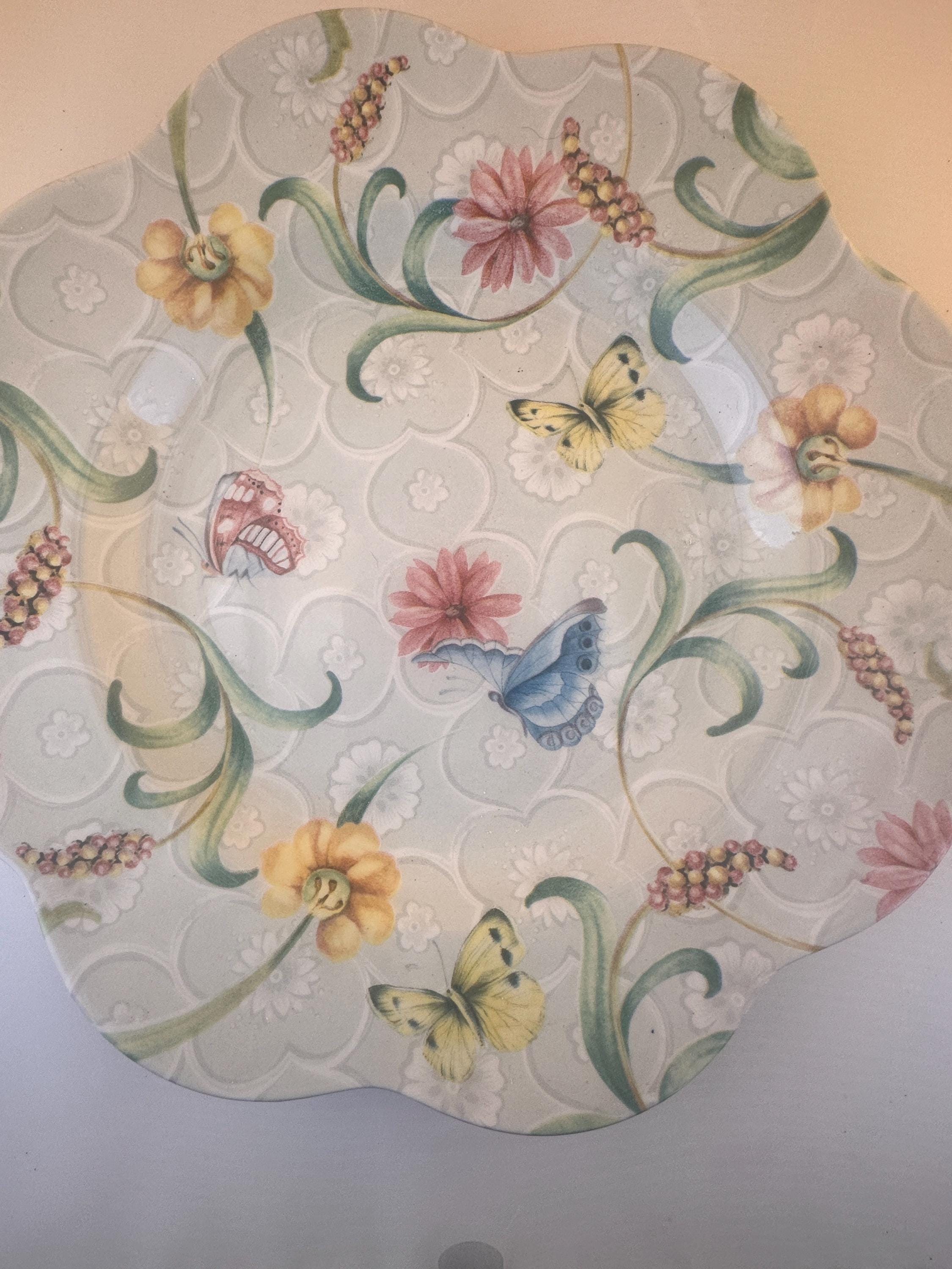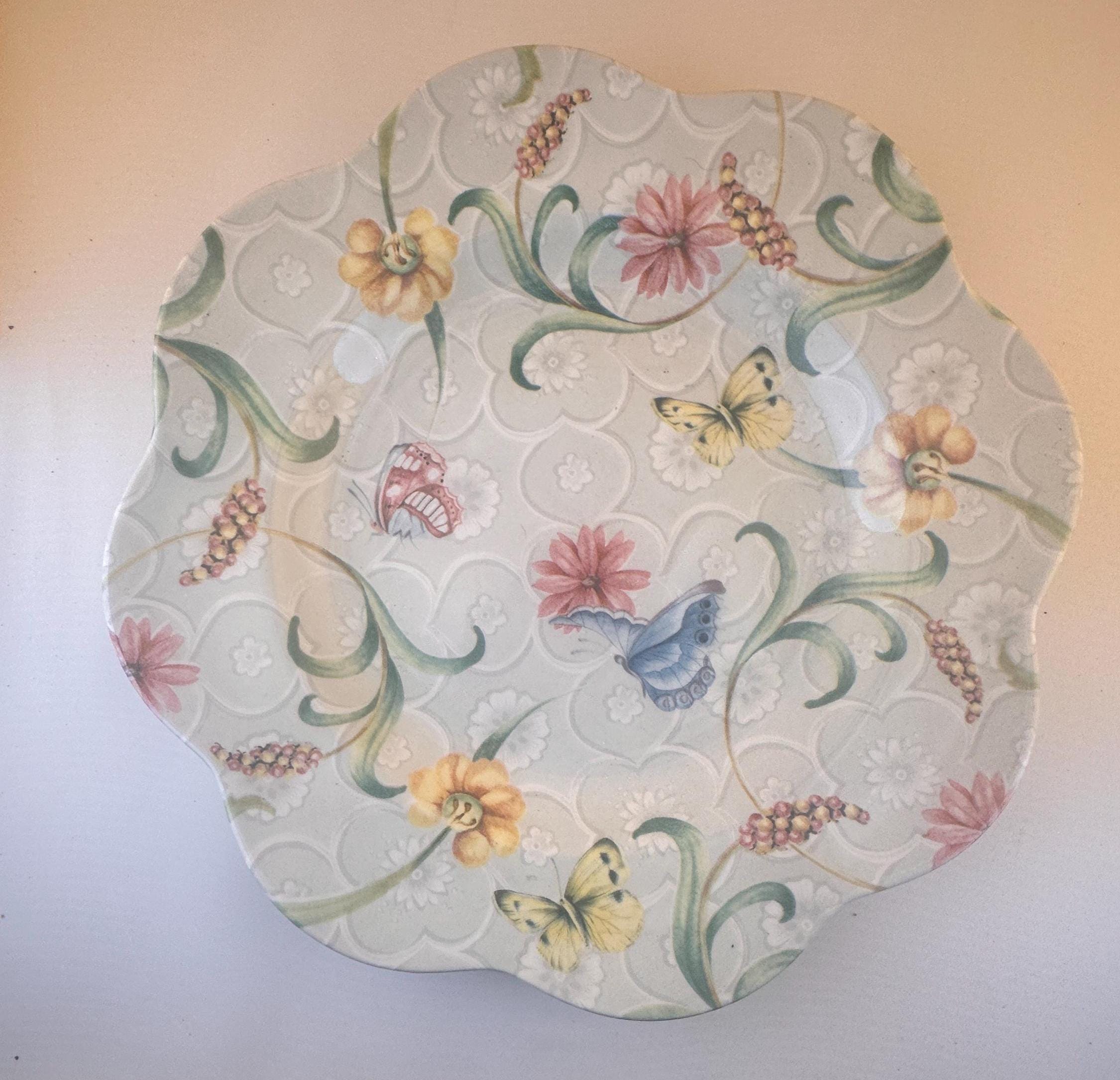 Pair of 2 Exotic Garden by Spode China multi-colored lunch plates in the French country style is now available at Tucson Tiques Collectibles. Adorned with daisies and butterflies with a scalloped rim. Dimensions: approximately 9 3/8 inch diameter. Excellent condition. Great gift for Christmas