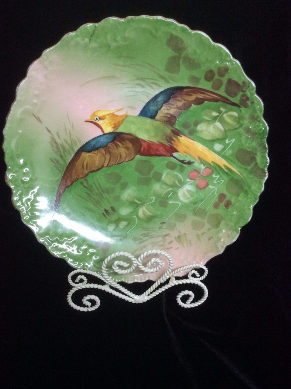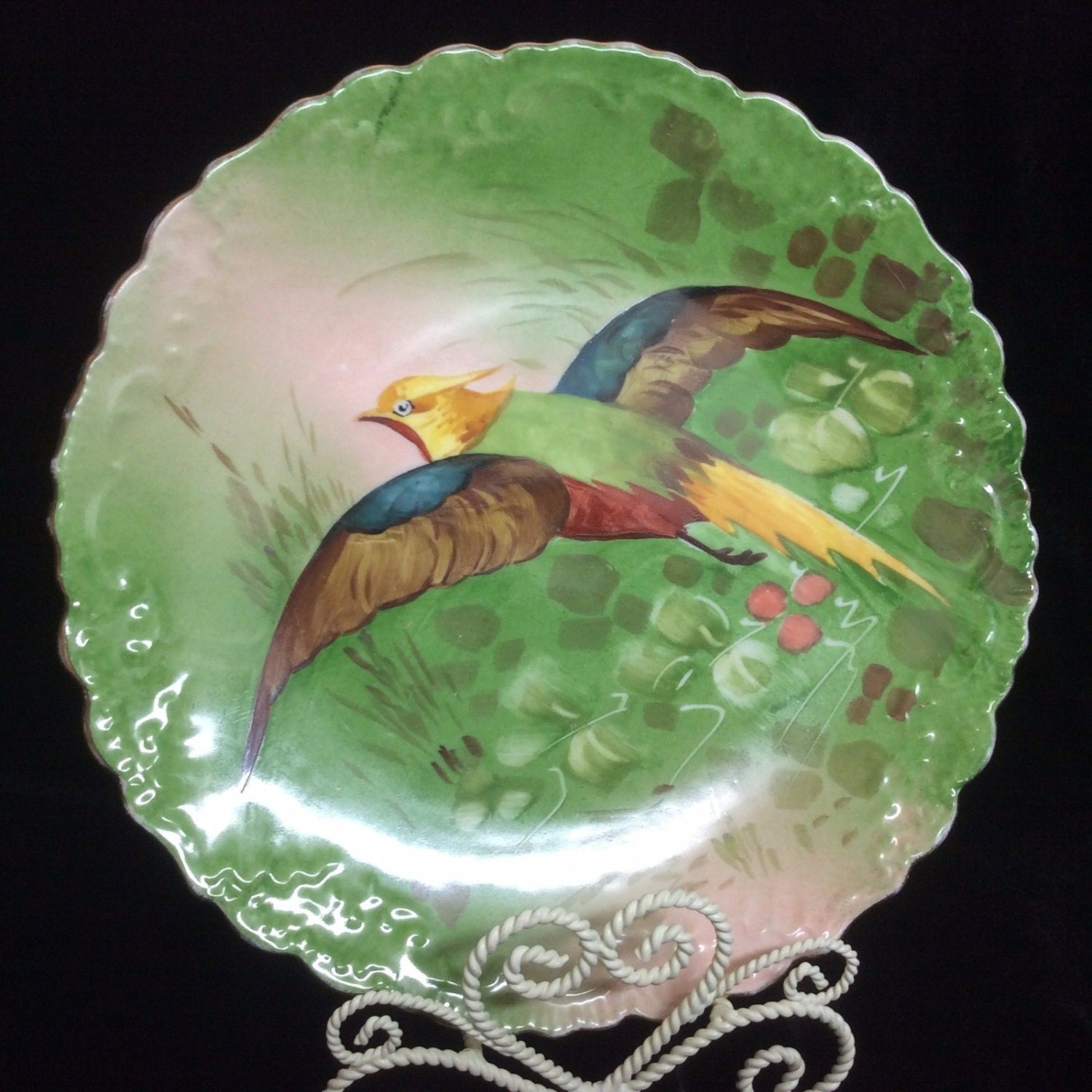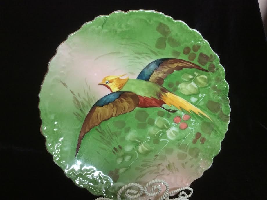 Antique Limoges Blakeman & Henderson charger. Hand painted multi colors. Great gift for a bird lover. This porcelain plate has a gorgeous Game Bird, Golden Pheasant on it. It was made in France. It measures approximately 10" in diameter. The bird plate has scalloped edges and is in excellent condition. Why not make it a gift for her or a gift for mom?