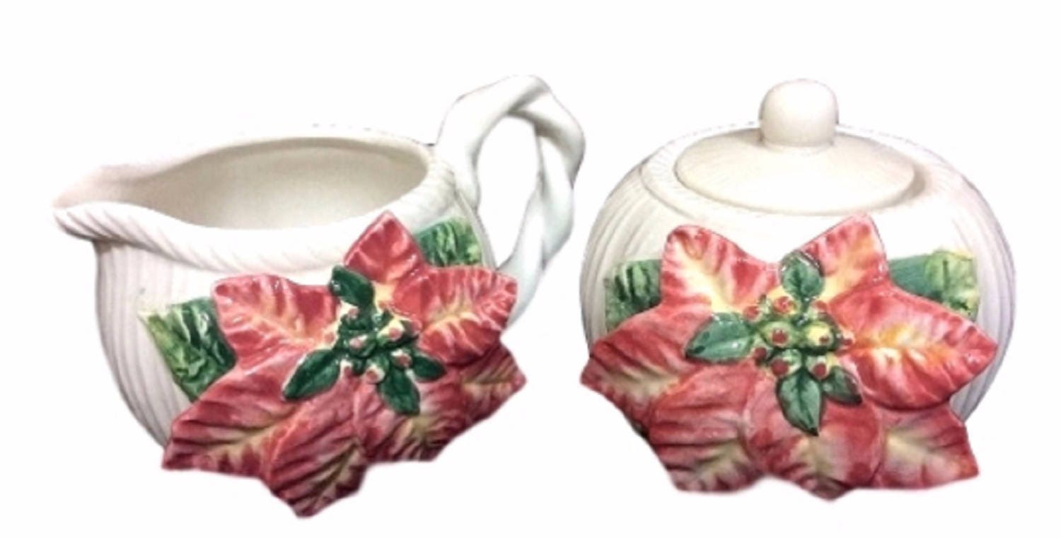 This fancy Fitz and Floyd ceramic cream and sugar set. It is ivory colored with a pink poinsettia Christmas and green holly. All ready to adorn your Christmas dining table. Made in 1991.