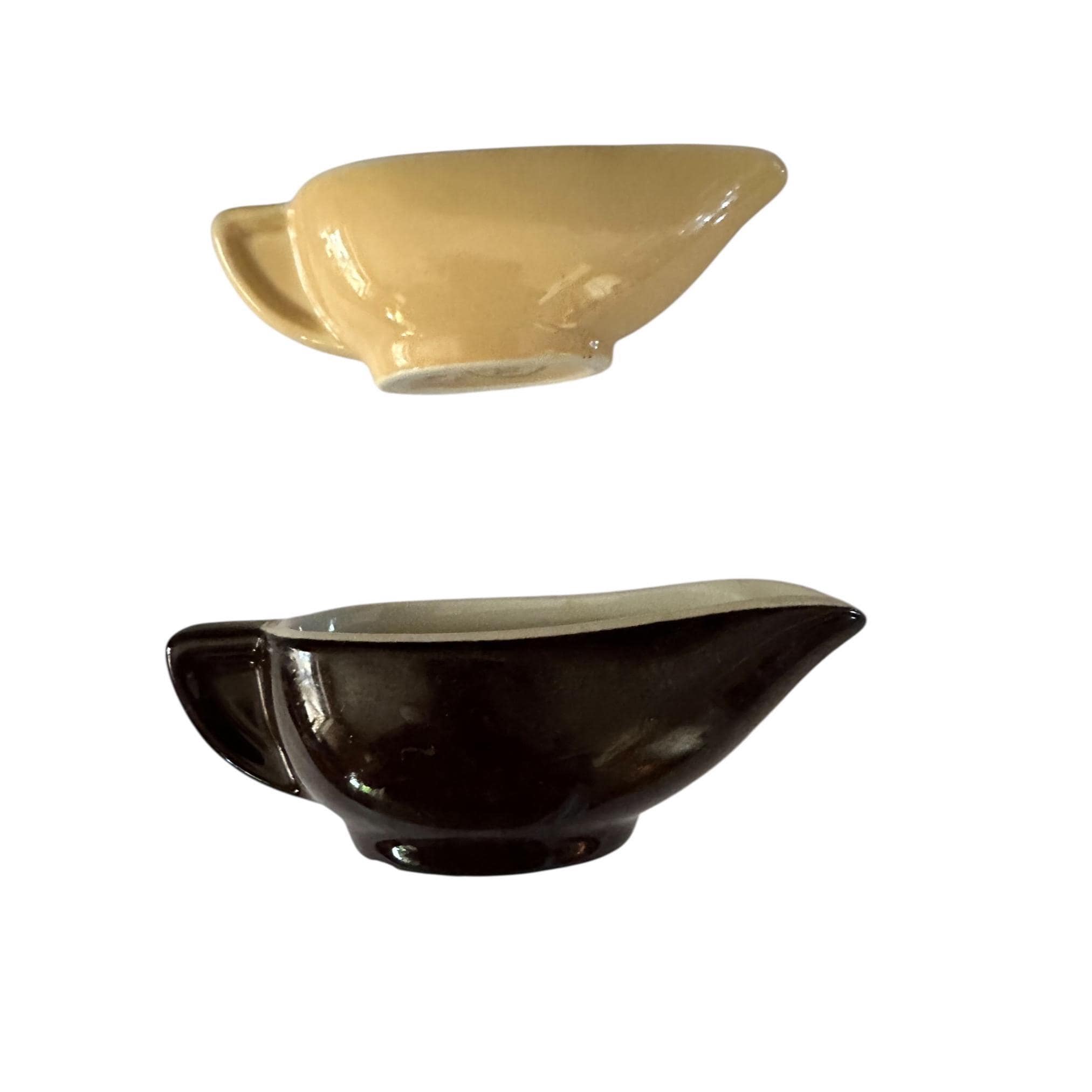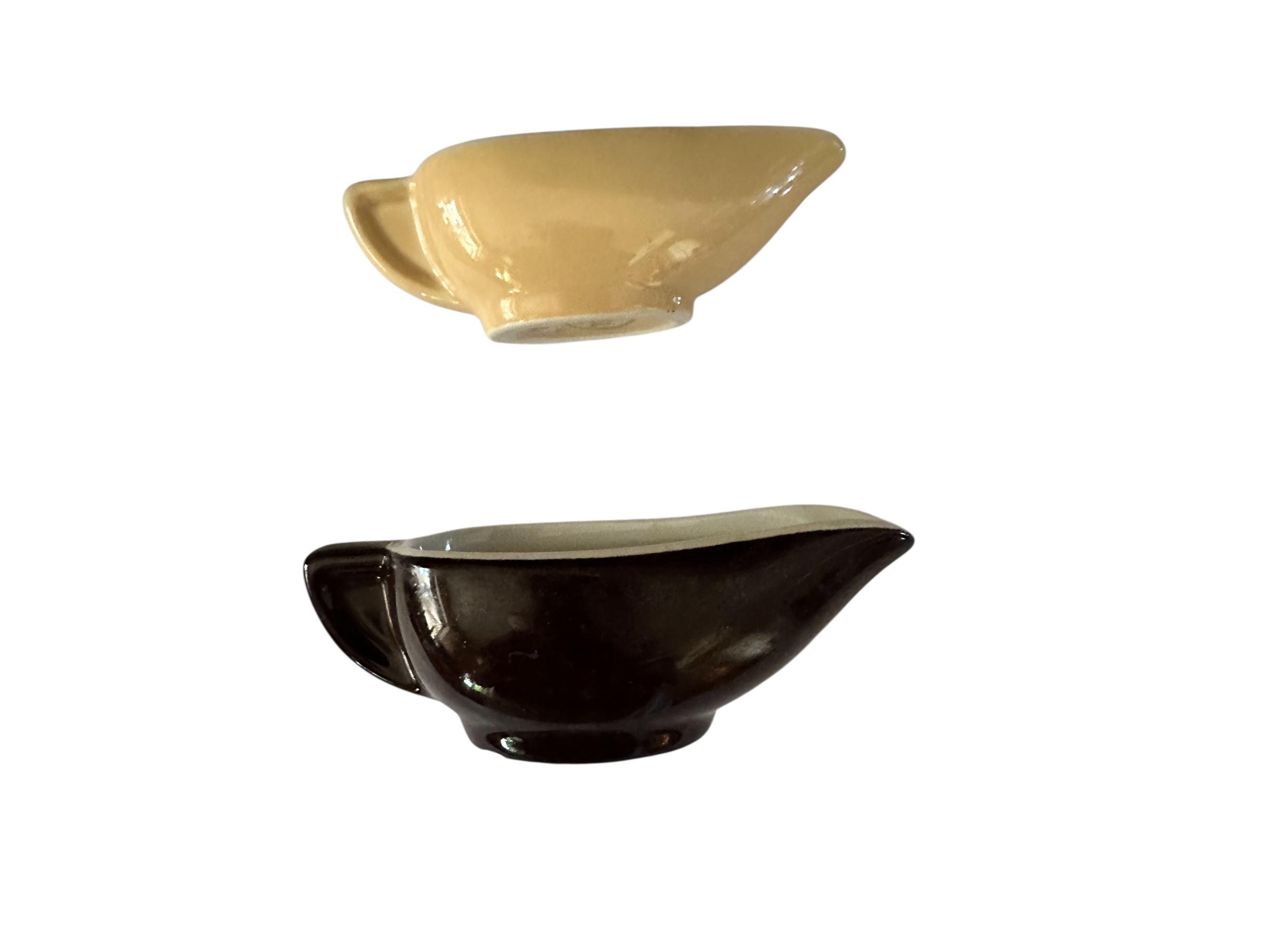 Perfect for retro kitchen decor, these ceramic creamers are in excellent condition, free of chips, cracks, or crazing, and measure approximately 5.5 inches in length. Model number 144 makes them a sought-after addition to any vintage kitchen or collectible kitchen collection. Whether you're a passionate collector or looking for unique decorative creamers, these vintage creamers add an authentic touch of history and style.