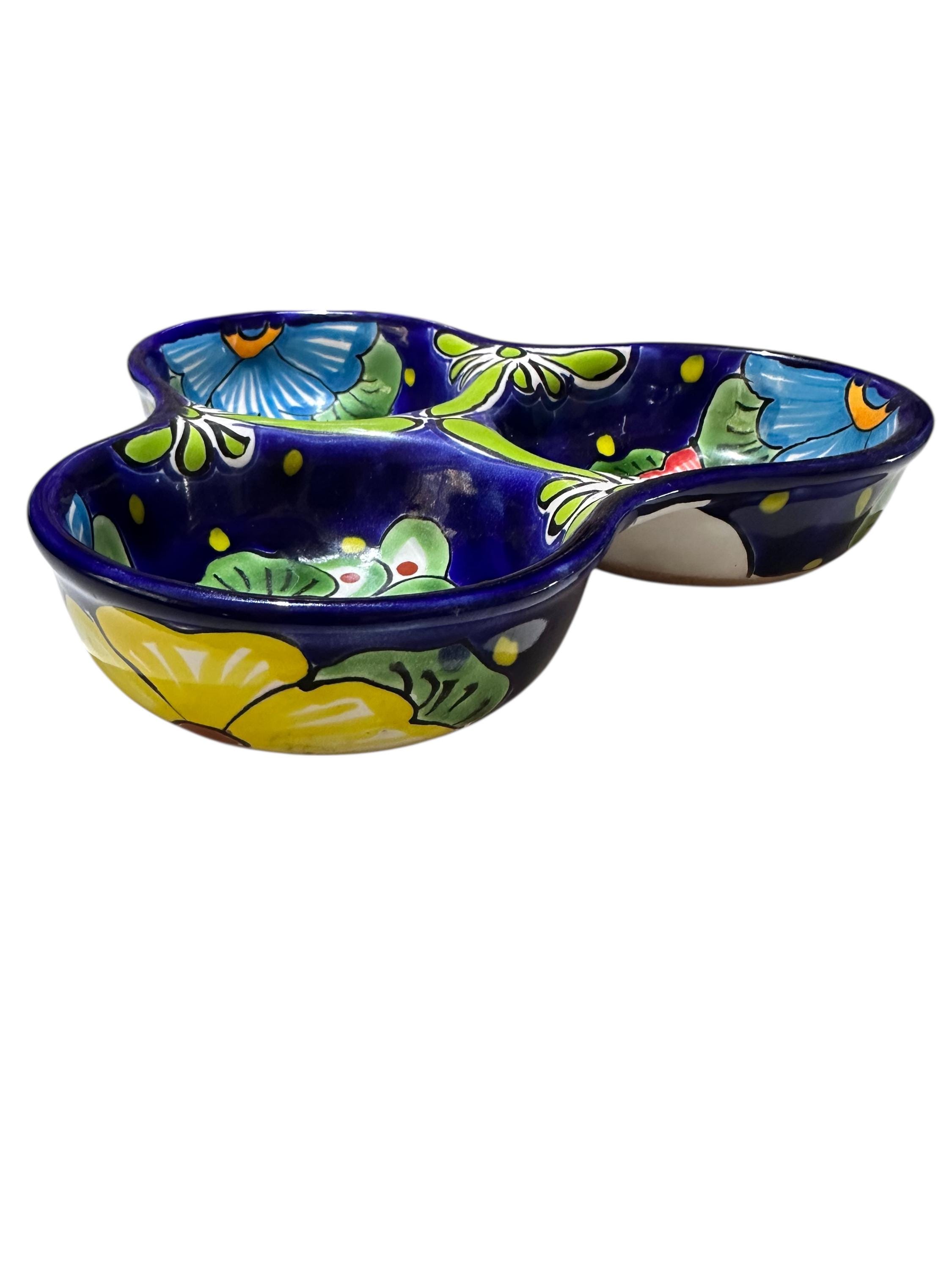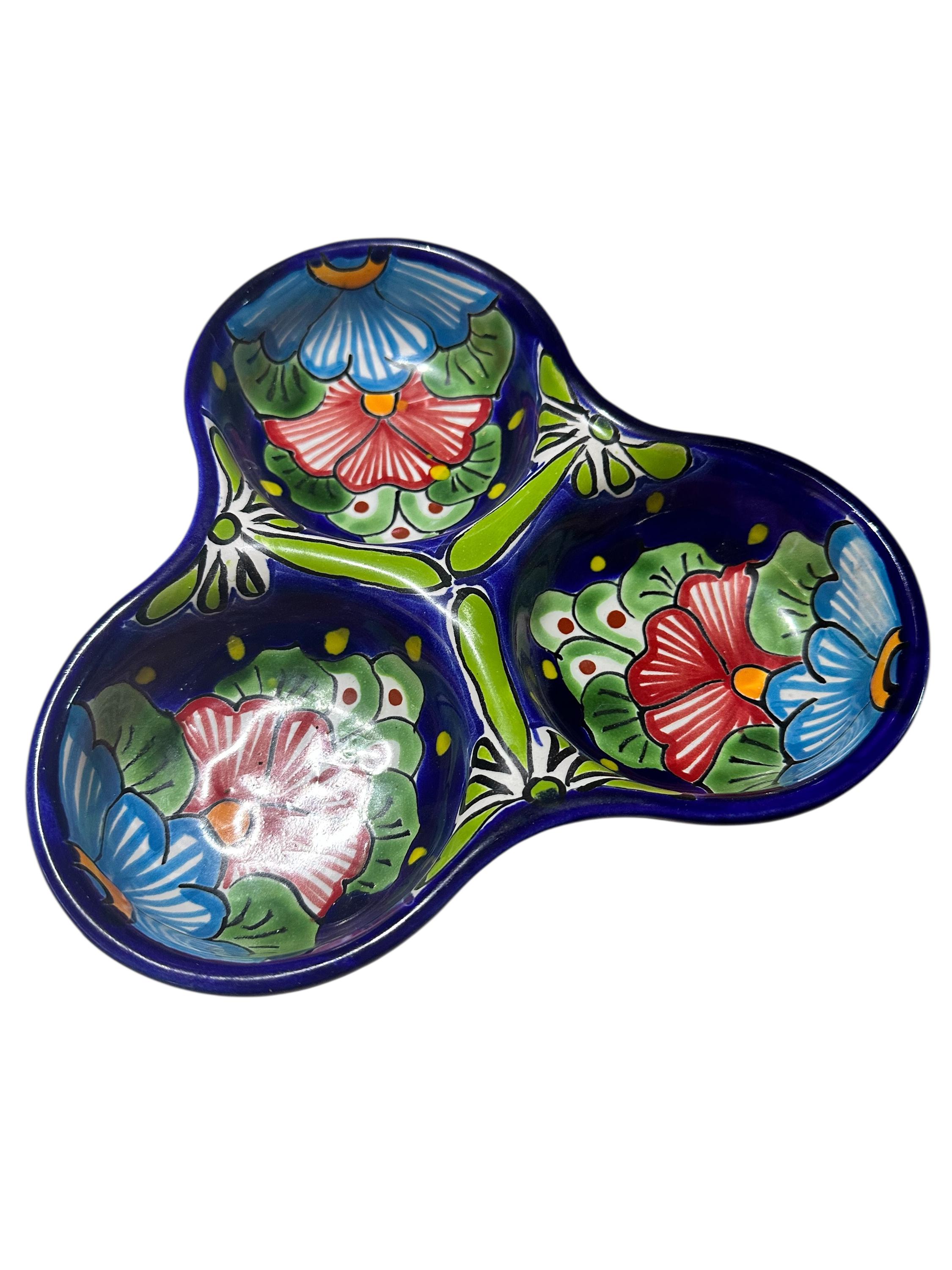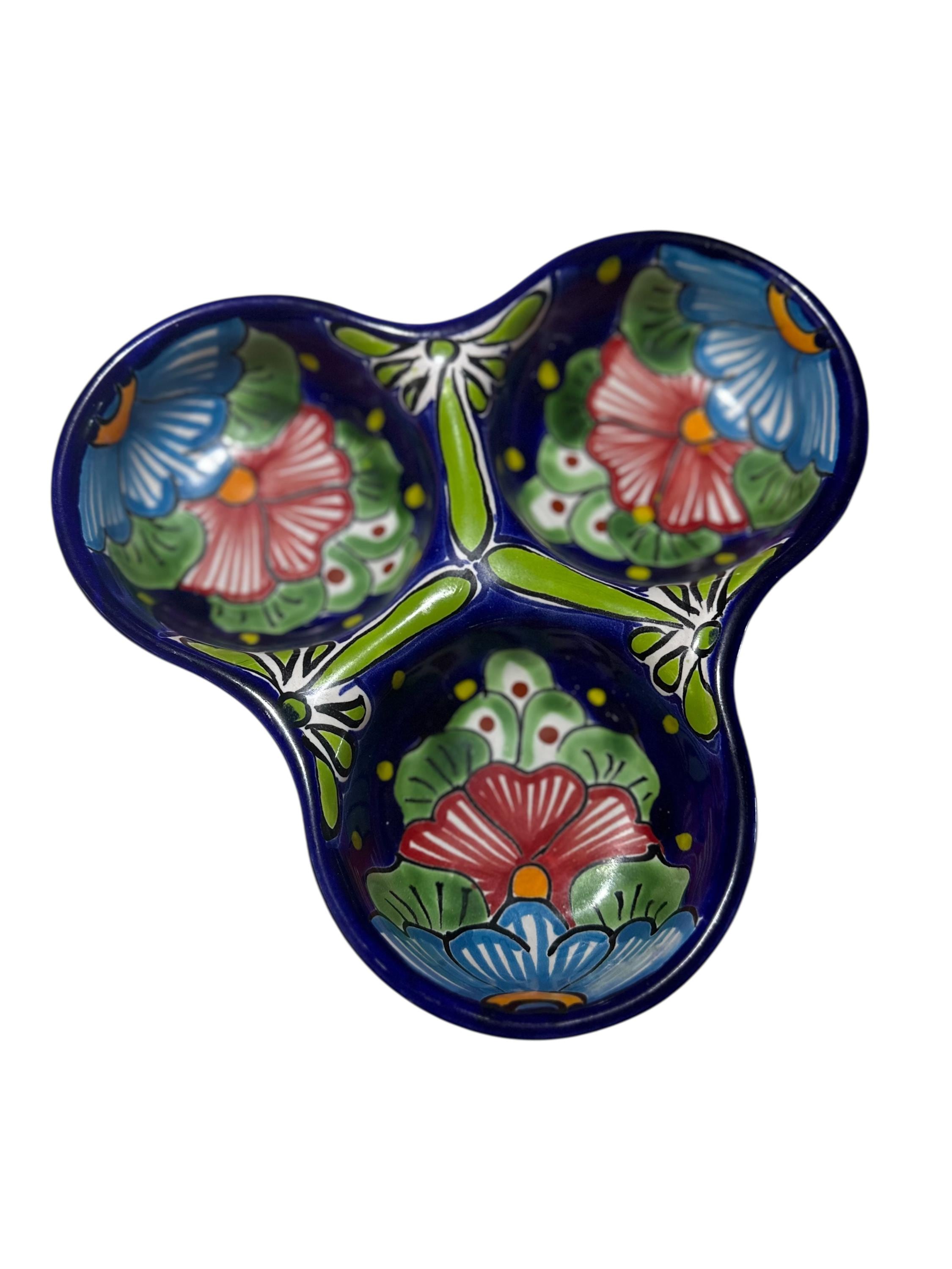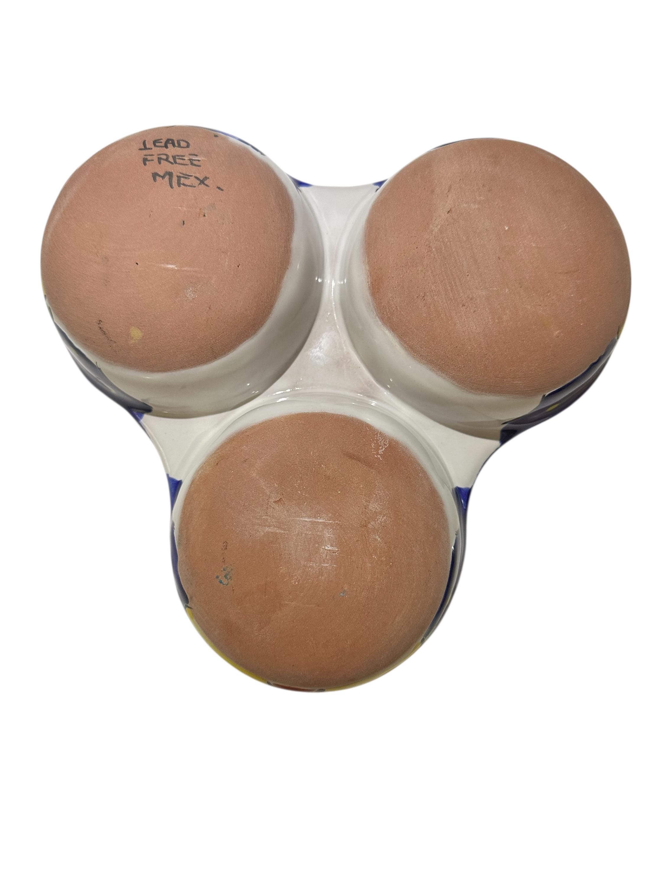 Elevate your entertaining experience with this exquisite lead-free Talavera folk art pottery 3 compartment tray, featuring vibrant hand-painted patterns that reflect the rich heritage of Mexican craftsmanship. This colorful snack or appetizer server not only captivates with its intricate design but also offers a distinguished presentation that stands apart in any gathering.