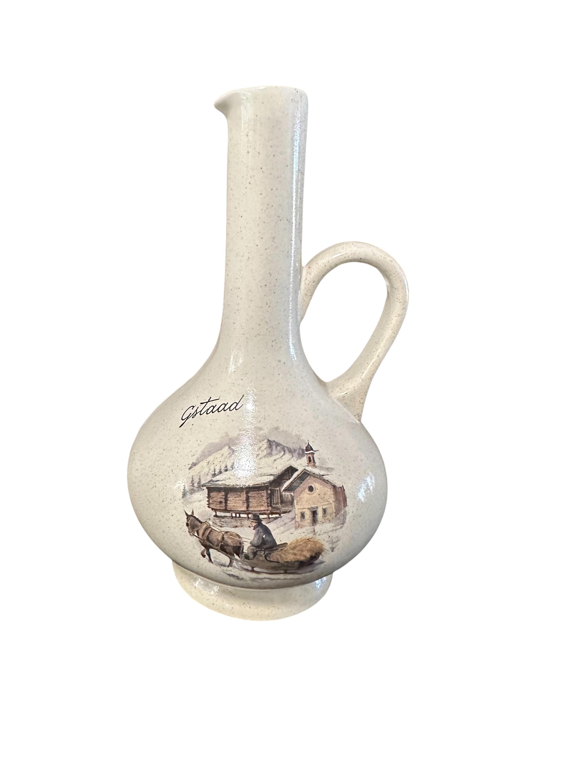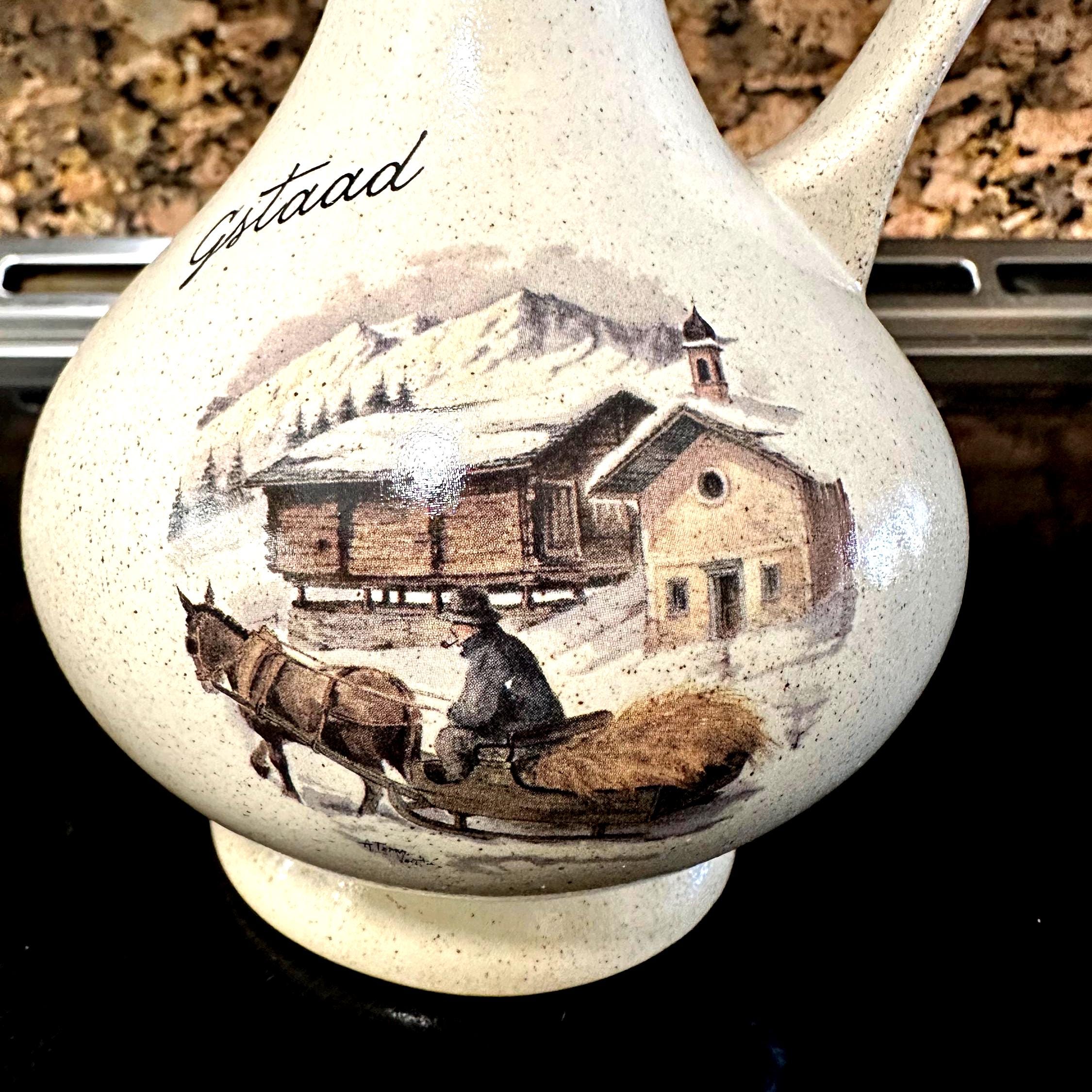 Gstaad Switzerland Decorative Stoneware Pitcher Mule Drawn Cart and Farmer in Snowy Cabin Scene