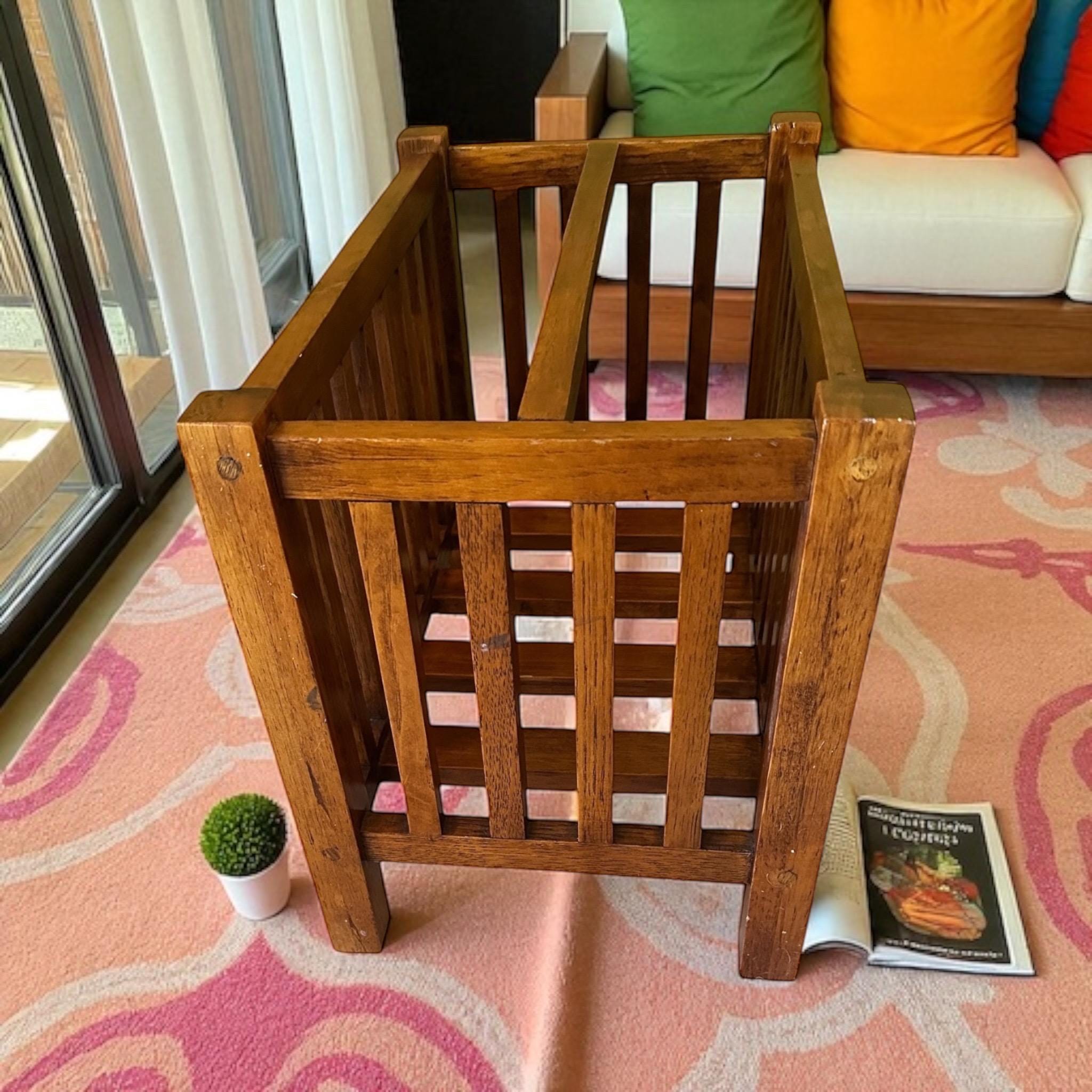 Elevate your living space with this rare, heirloom-quality Craftsman Mission magazine rack—a piece where artistry meets function. Handcrafted from solid wood, this mid-century magazine holder blends timeless design with the warmth of vintage craftsmanship.