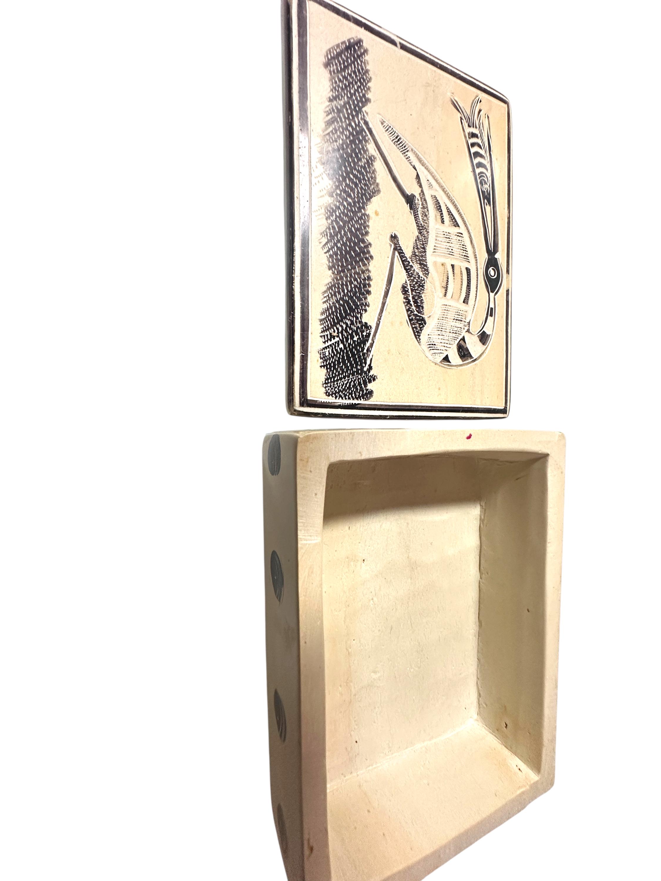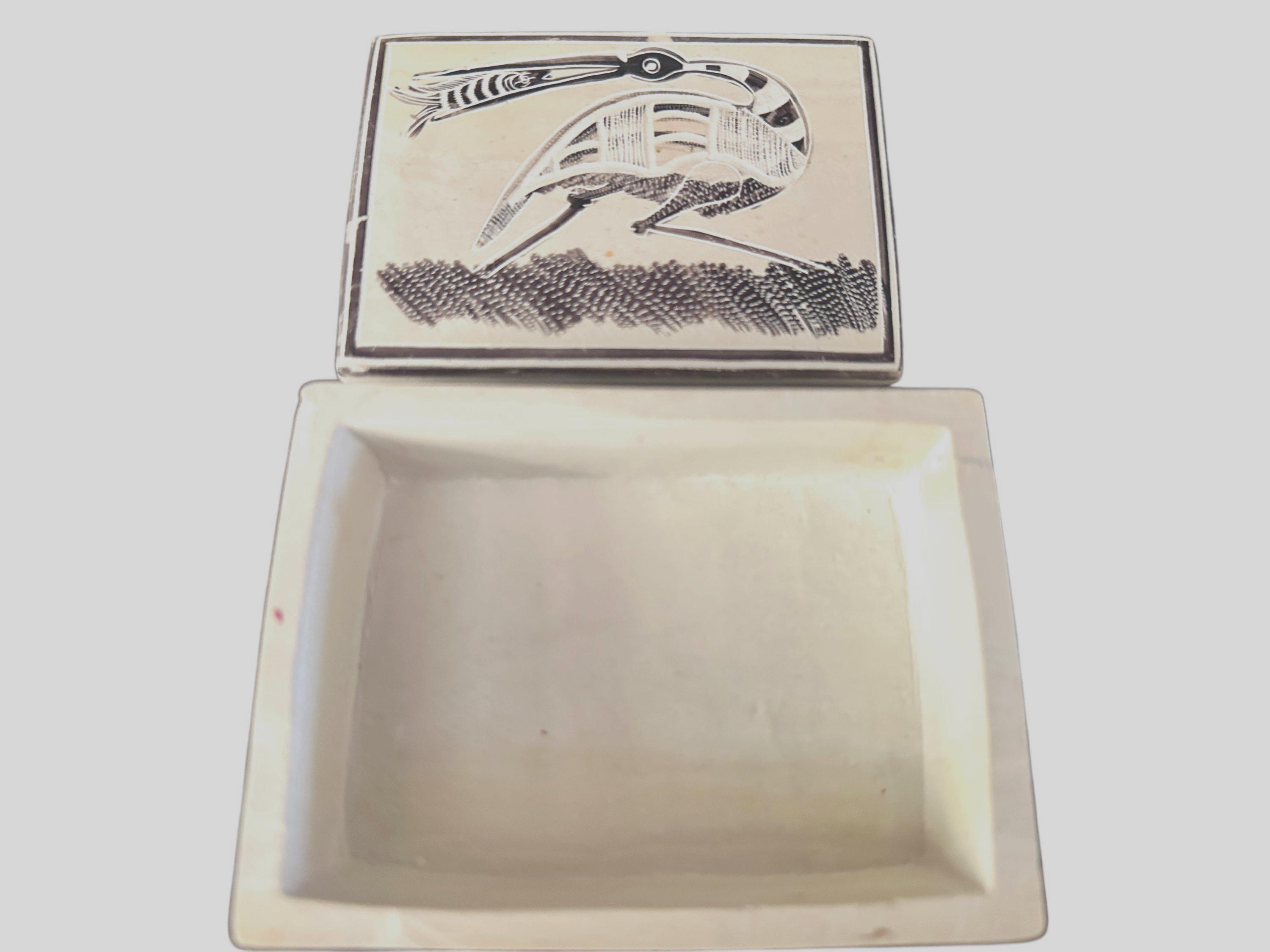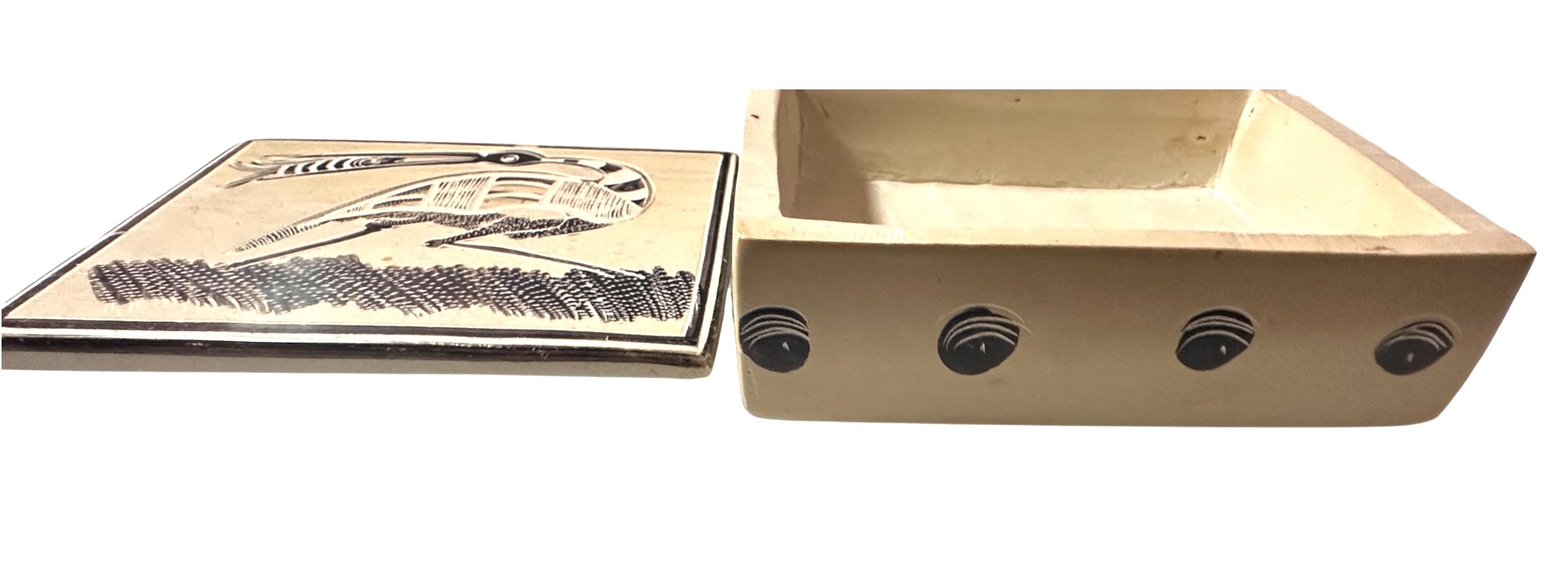Add a touch of rustic charm to your space with this vintage ceramic trinket box featuring a beautifull etched bird design on the lid. This unique handcrafted pottery box combines Southwest and folk art influences, making it an eye catching accent piece for any room.