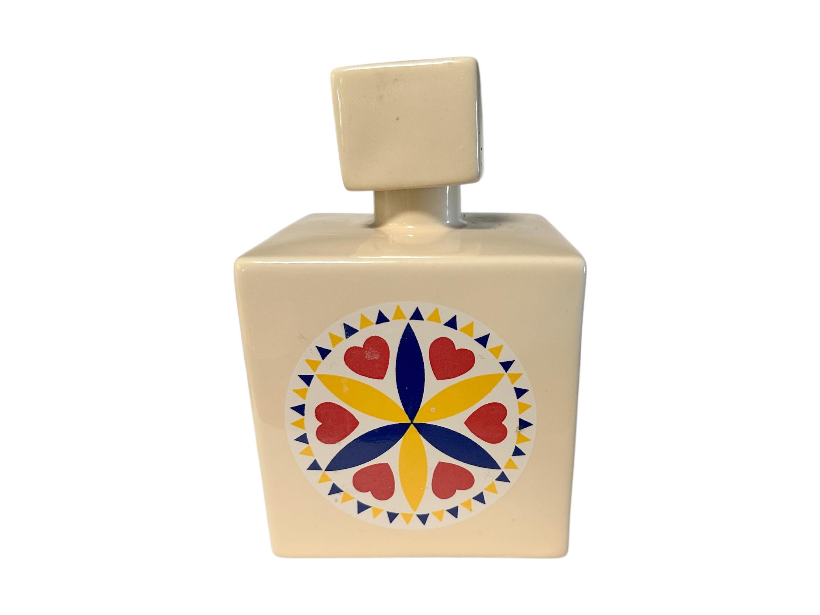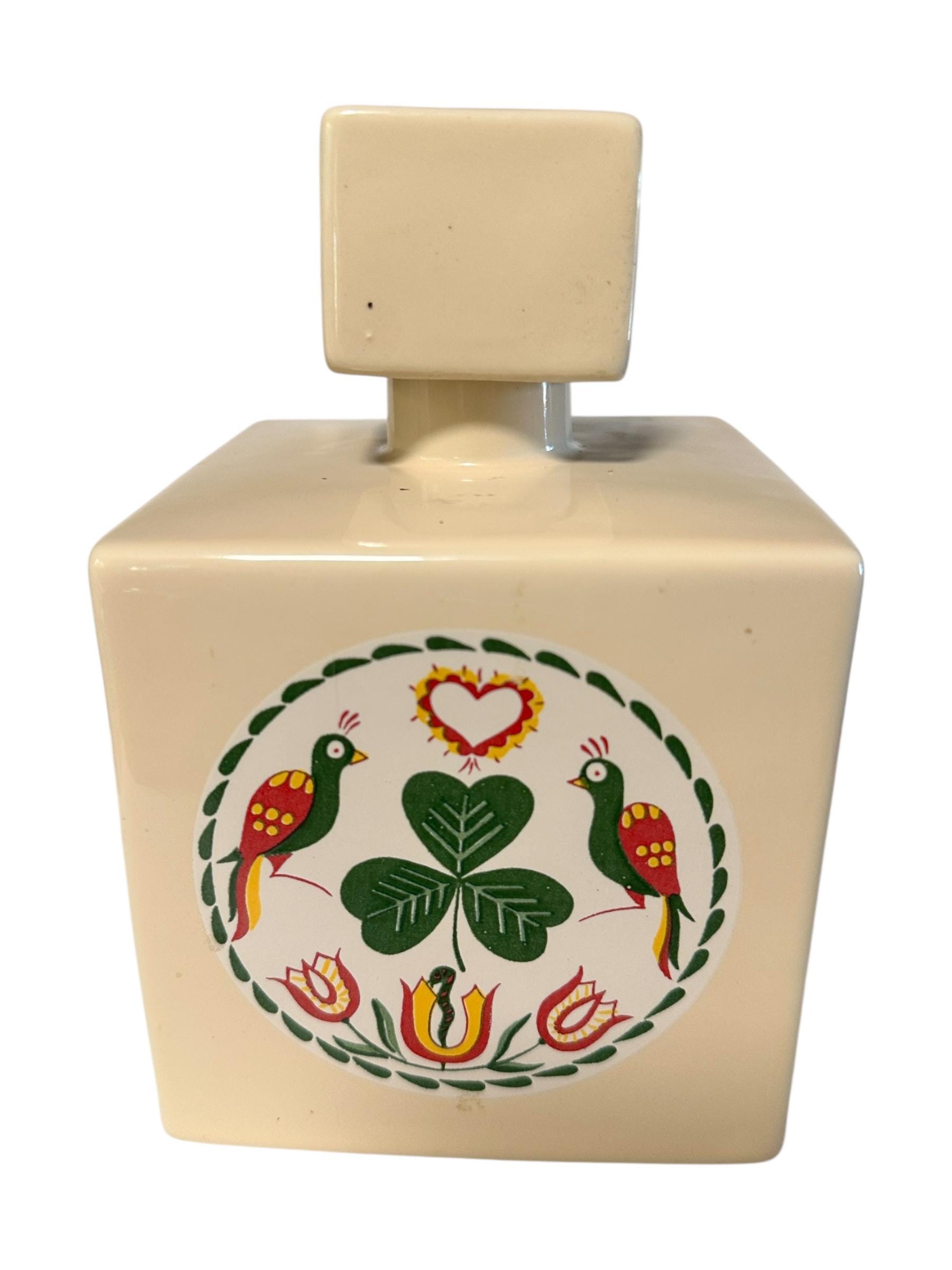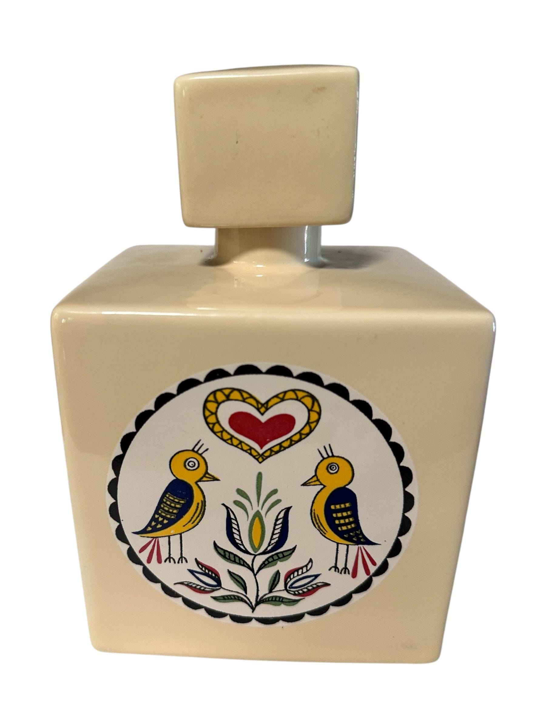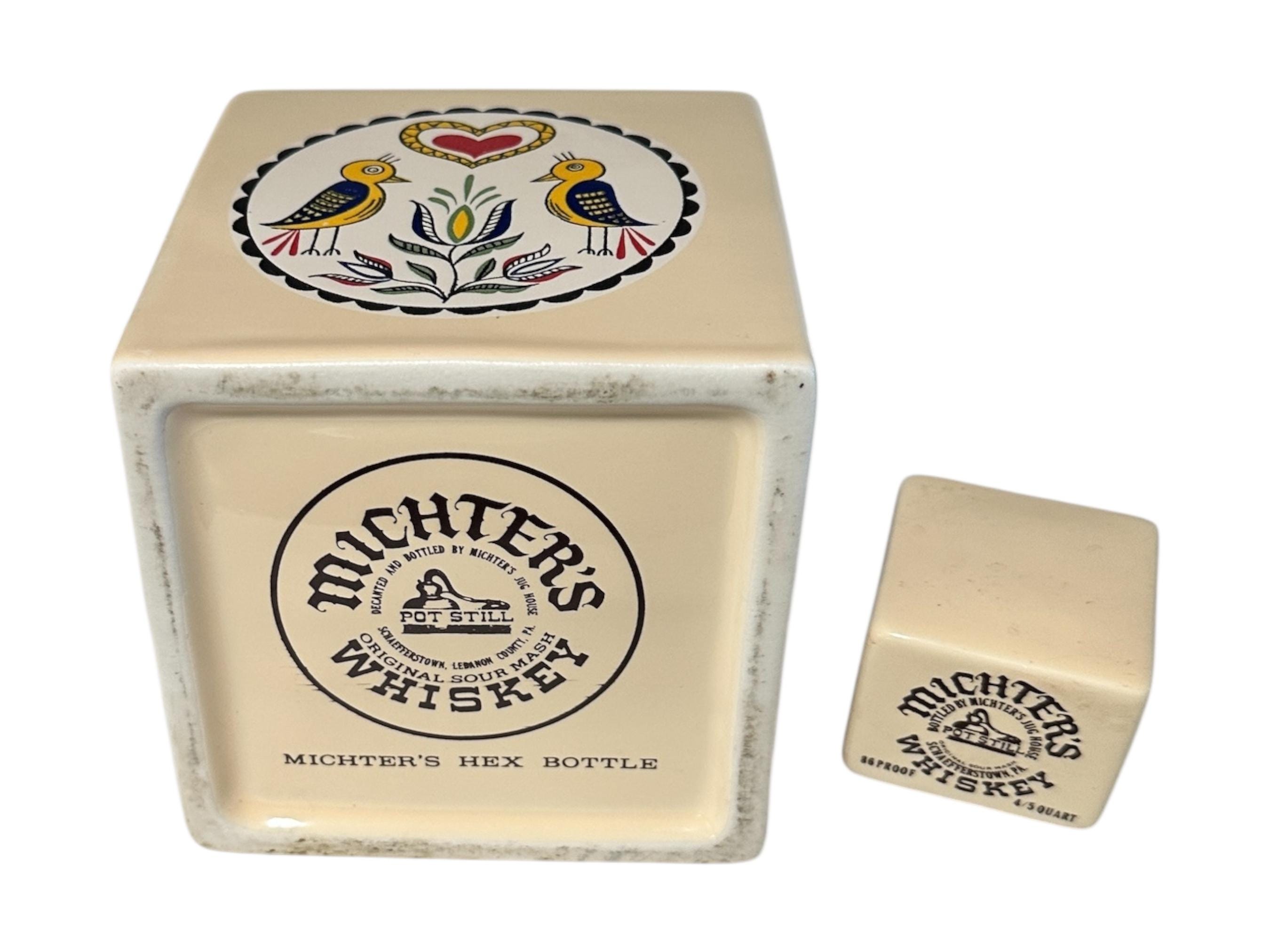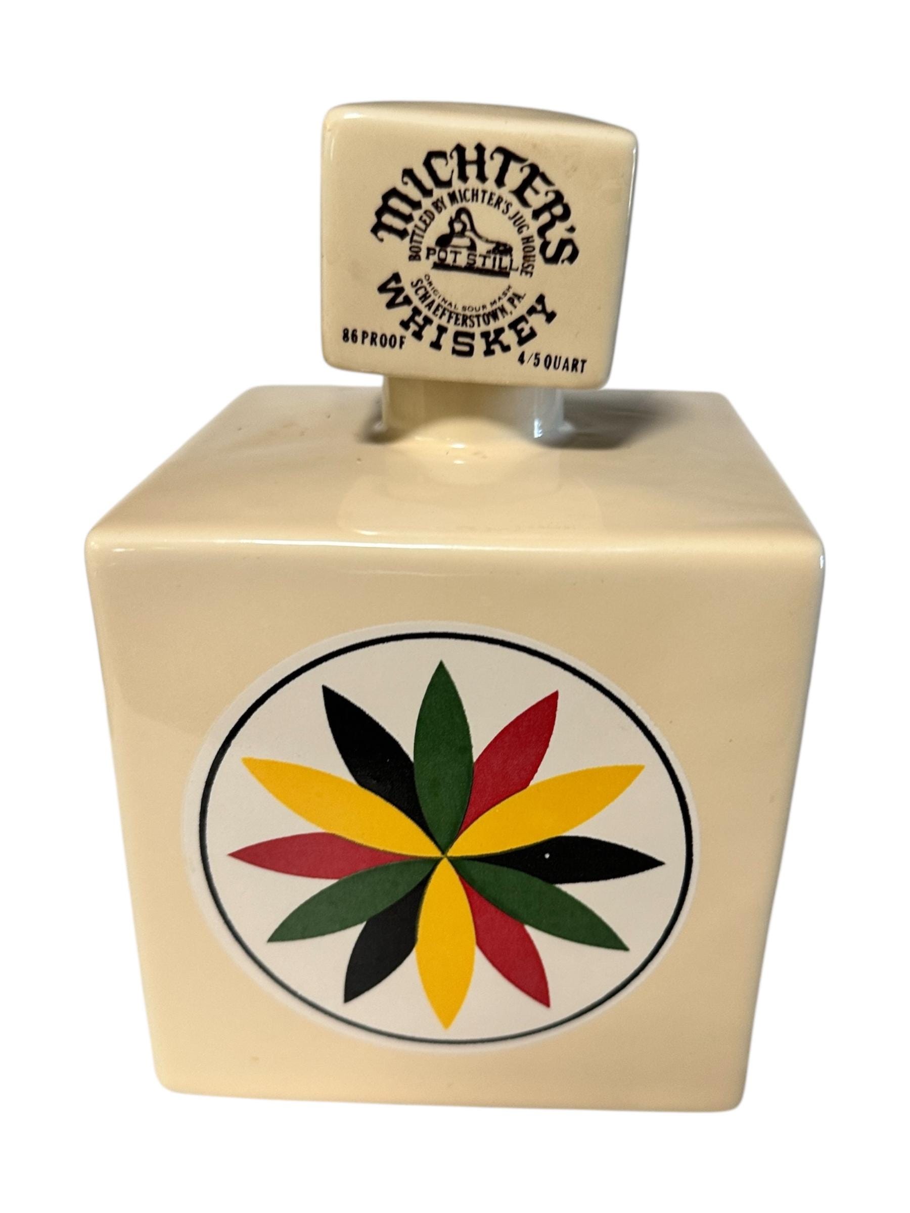 This is an empty Michter's Original Sour Mash Whiskey Decanter from Schaefferstown, Pennsylvania. It features Pennsylvania Dutch artwork (hex signs) It measures 6 3/8" high and 4 1/4" square. Each side of the bottle has a different hex sign It is a 4/5 quart bottle.