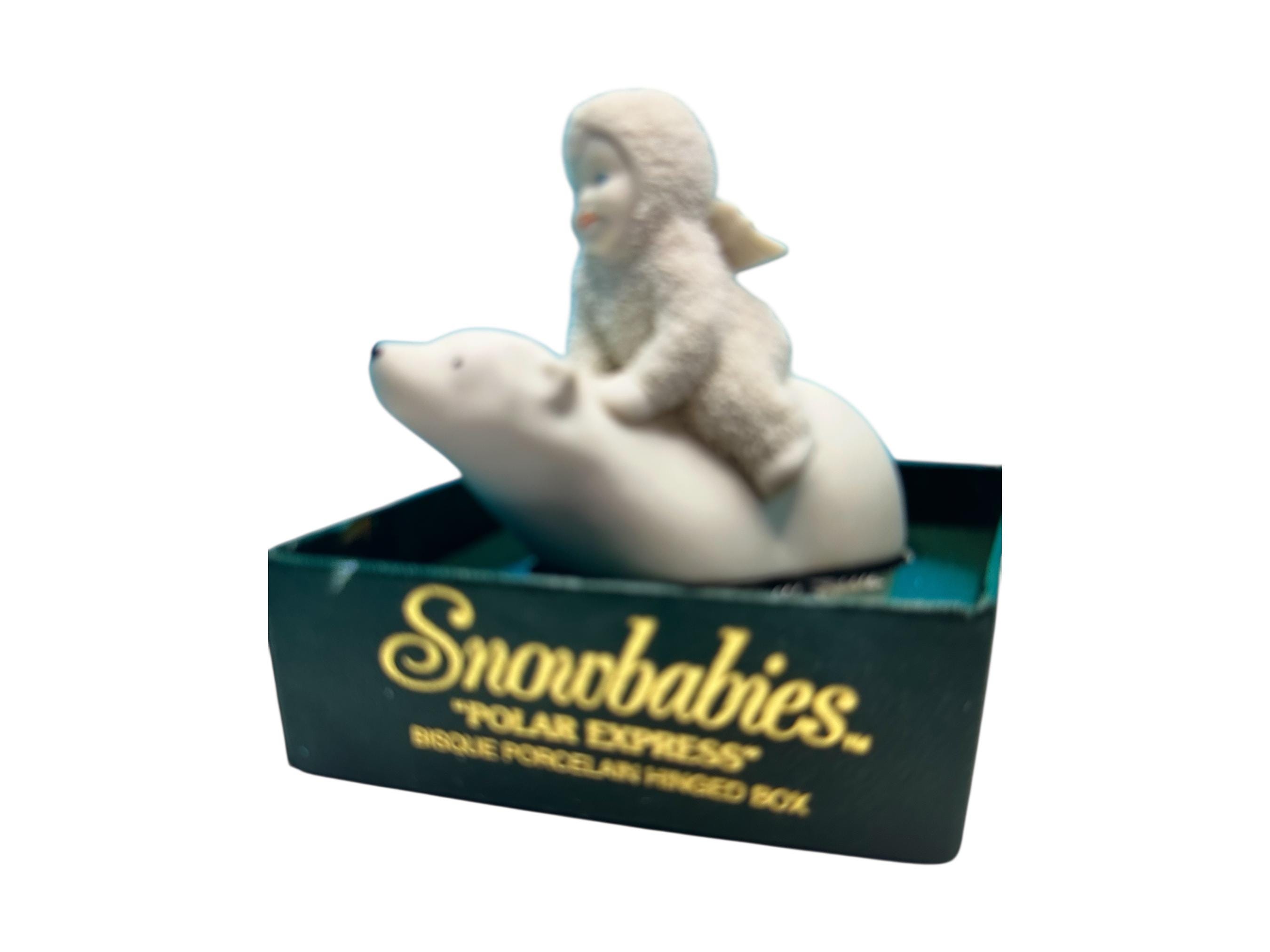 Discover the charm of this retired Department 56 Snowbabies Polar Express bisque porcelain hinged box, crafted in 1997. Featuring an adorable Snowbaby riding a polar bear, this collectible piece beautifully captures the magic of winter and holiday wonder. Made from high-quality bisque porcelain, it offers a delicate, detailed finish that highlights the whimsical design and craftsmanship.