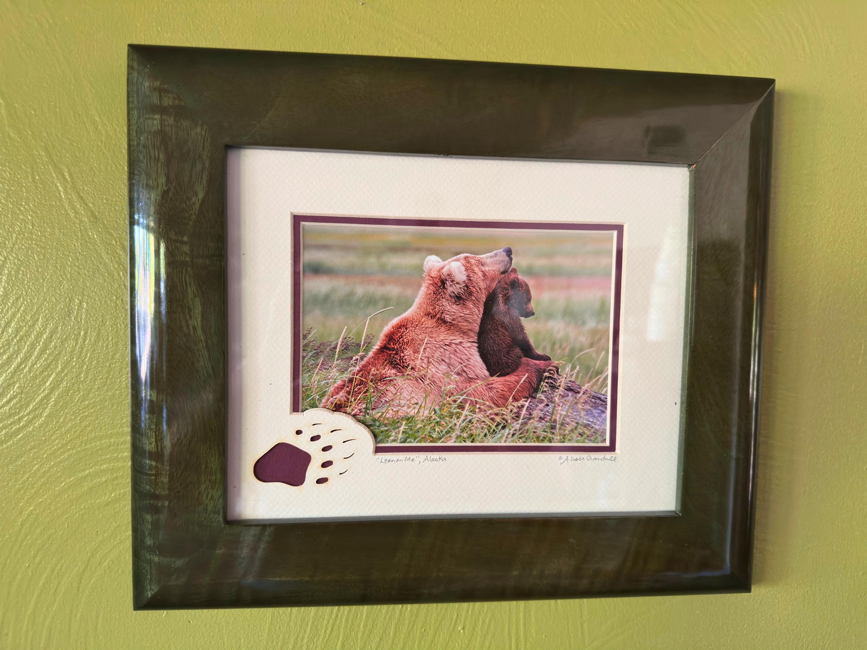 Capture the serene beauty of Alaska’s wilderness with this authentic brown bears photo featuring a majestic brown bear and cub. The print is titled "Lean on Me" by Alisa Crandall. Perfect for rustic home decor, this cabin wall art vividly brings nature indoors, offering a genuine connection to the wild unlike mass-produced prints.