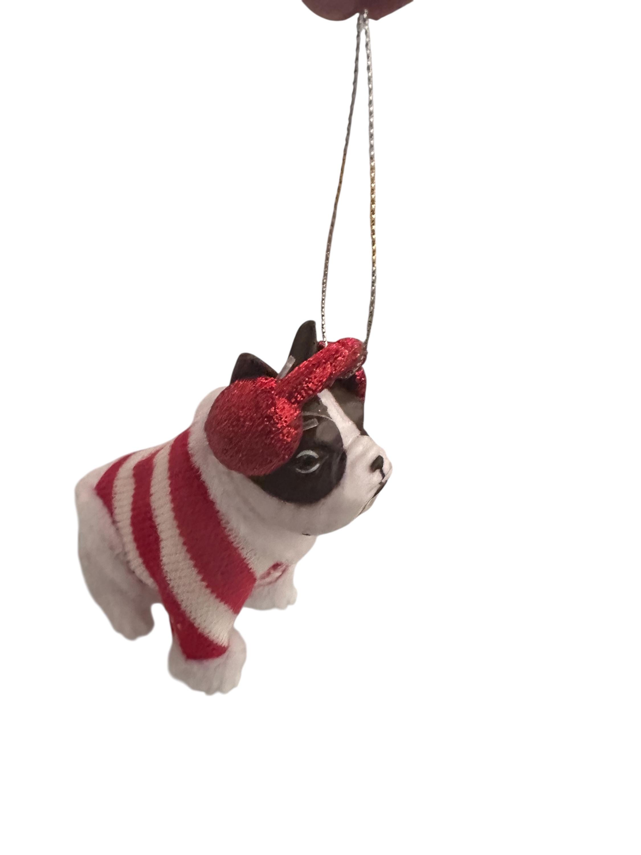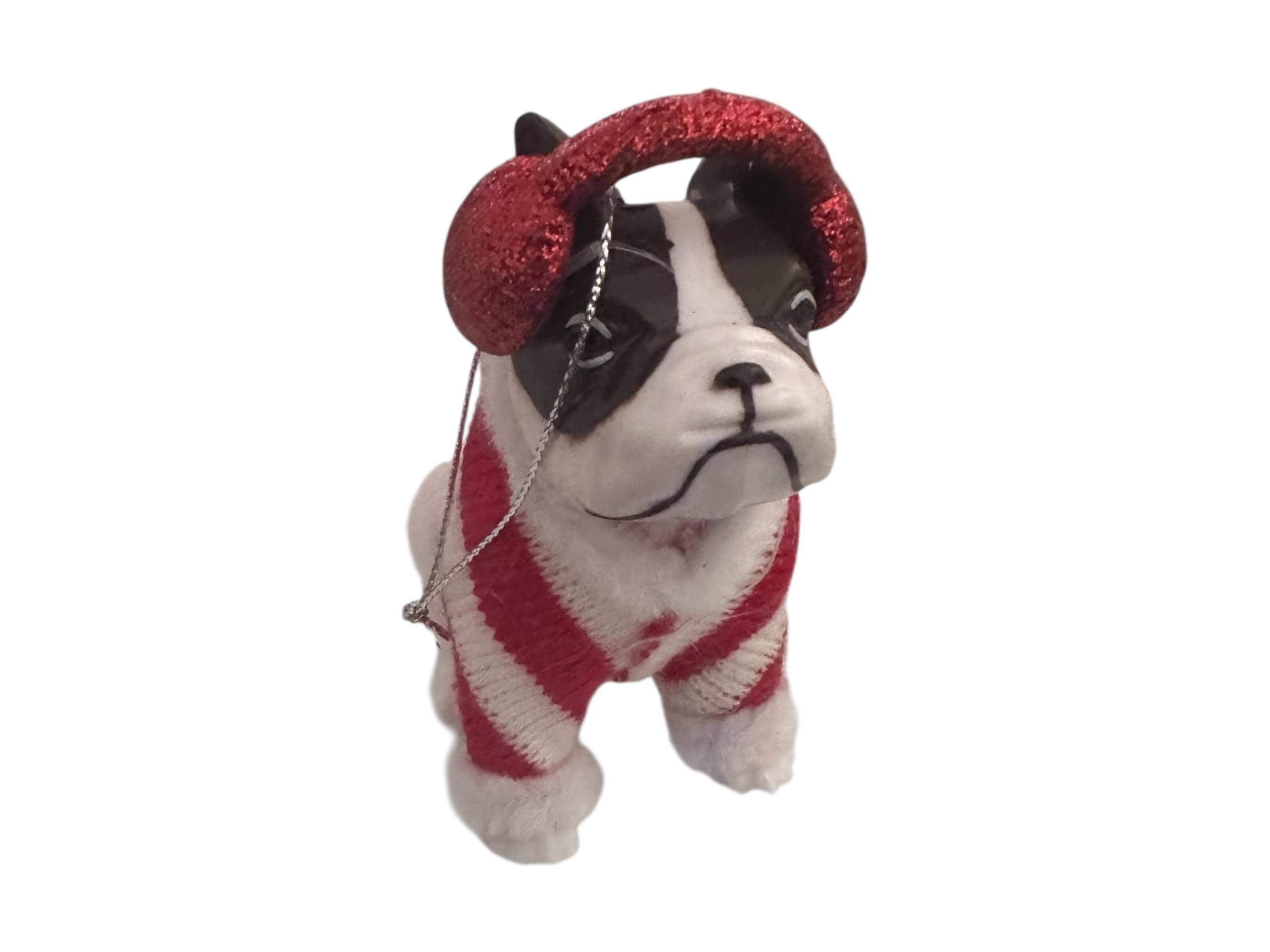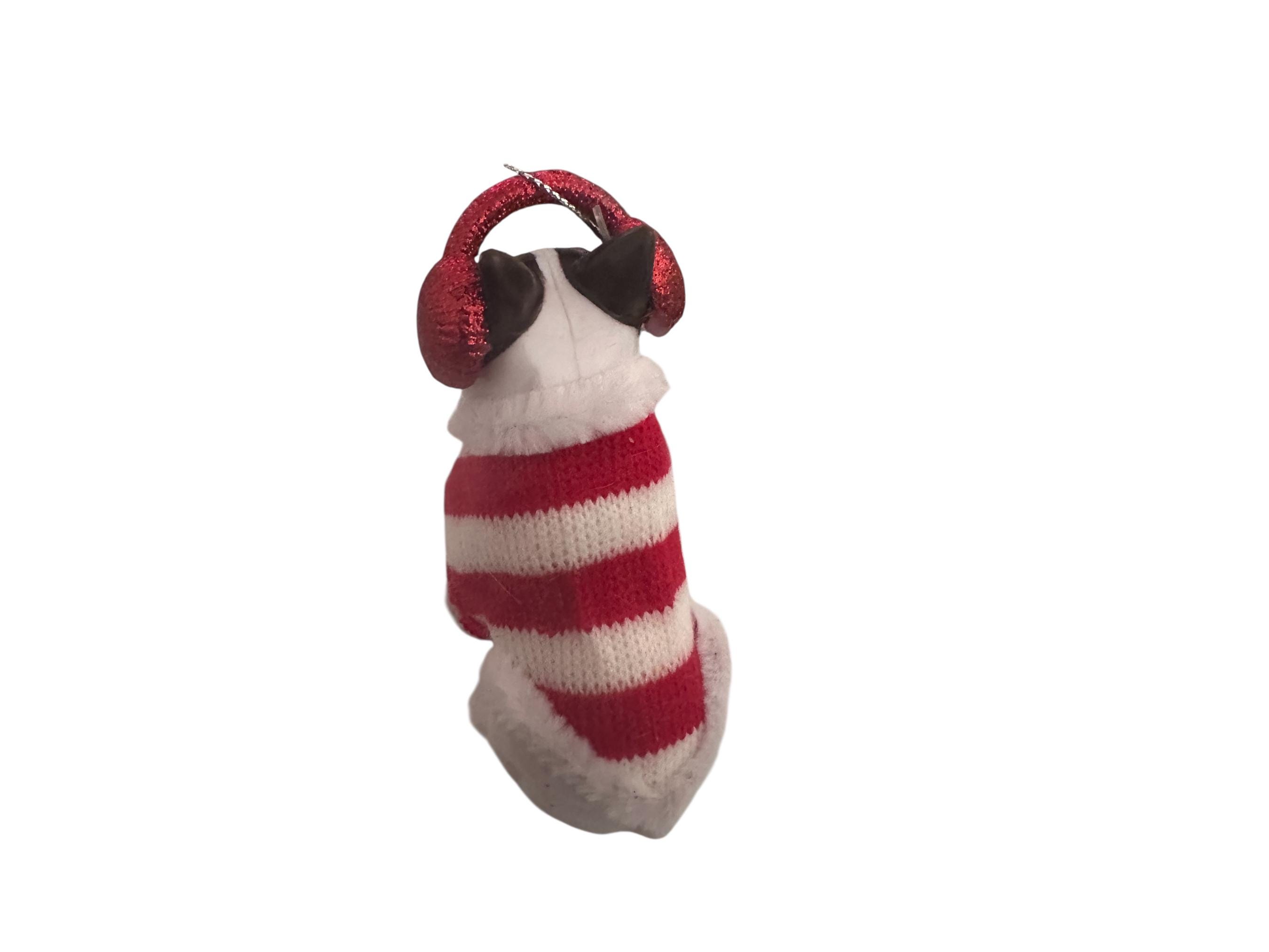 Add some holiday charm to your Christmas tree with this adorable bull dog ornament! Crafted from white plastic and measuring approximately 3.5 inches high and 2 inches wide, this whimsical dog decor features a cheerful bull dog wearing a festive red and white sweater. The ornament is detailed with a cute headset and a cozy, vintage-inspired design that makes it perfect for dog lovers and holiday enthusiasts alike.