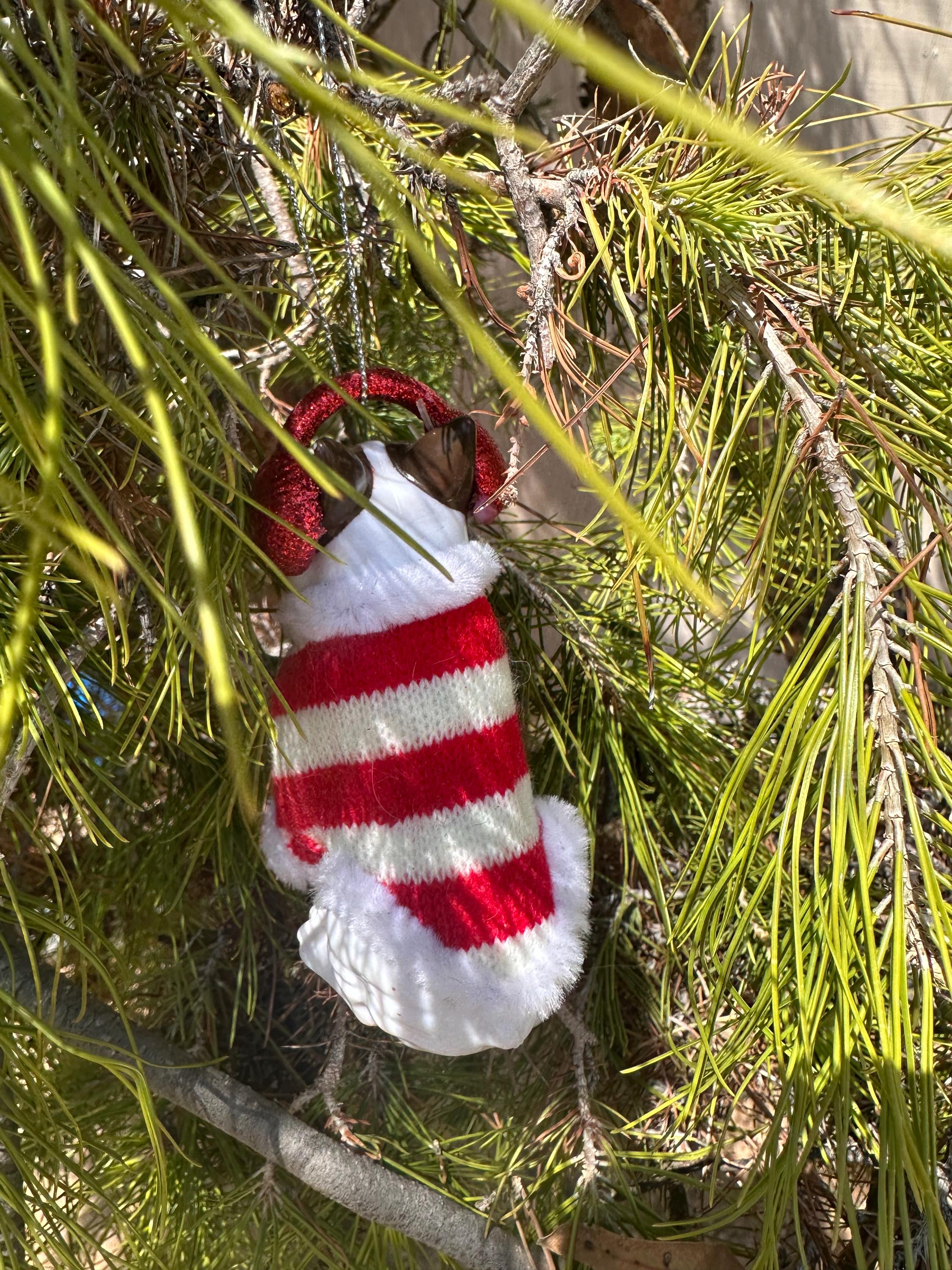 Celebrate the holidays with this whimsical dog ornament that combines festive fun with a touch of vintage charm. Perfect for gift-giving or adding a playful accent to your Christmas tree!