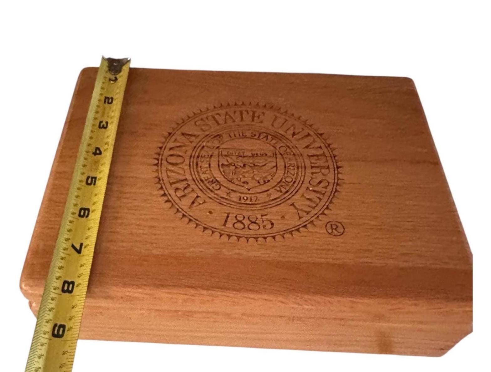 Celebrate your Arizona State University ASU pride with this vintage oak hinged desk box or jewelry box, a perfect keepsake gift for graduates or students. Featuring the iconic seal of Arizona, this elegant piece is crafted from durable oak and lined with soft velvet, offering a stylish and practical storage solution for keepsakes, jewelry, or small personal items. Its classic design and rich wood finish make it a timeless addition to any desk or vanity.