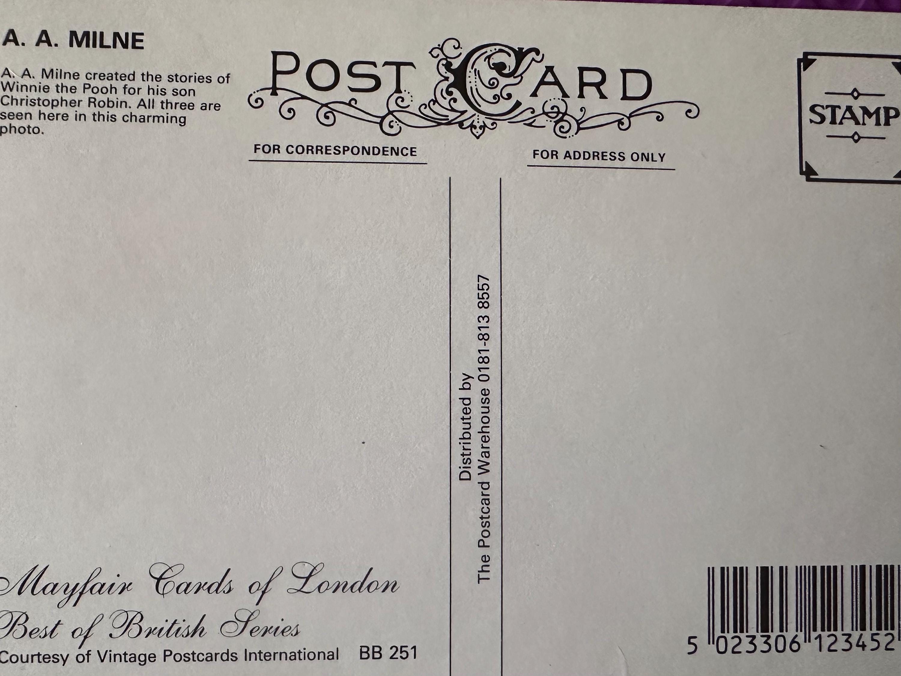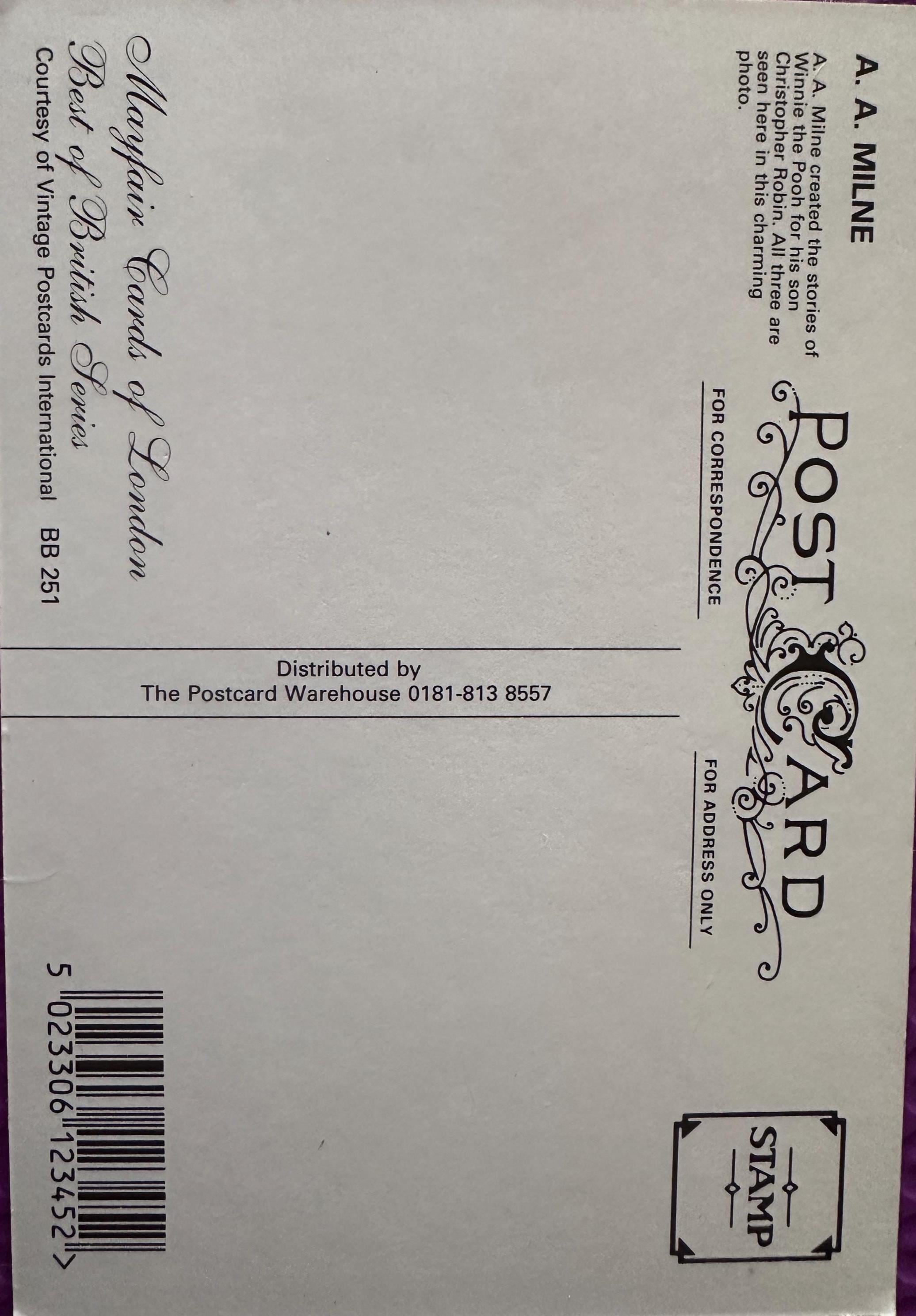 This vintage postcard is in excellent condition, making it a perfect collectible piece for fans of Winnie the Pooh, vintage ephemera, or British series memorabilia. Distributed by The Postcard Warehouse, it is part of the esteemed Mayfair Cares of London series, known for its charming and high-quality postcards.