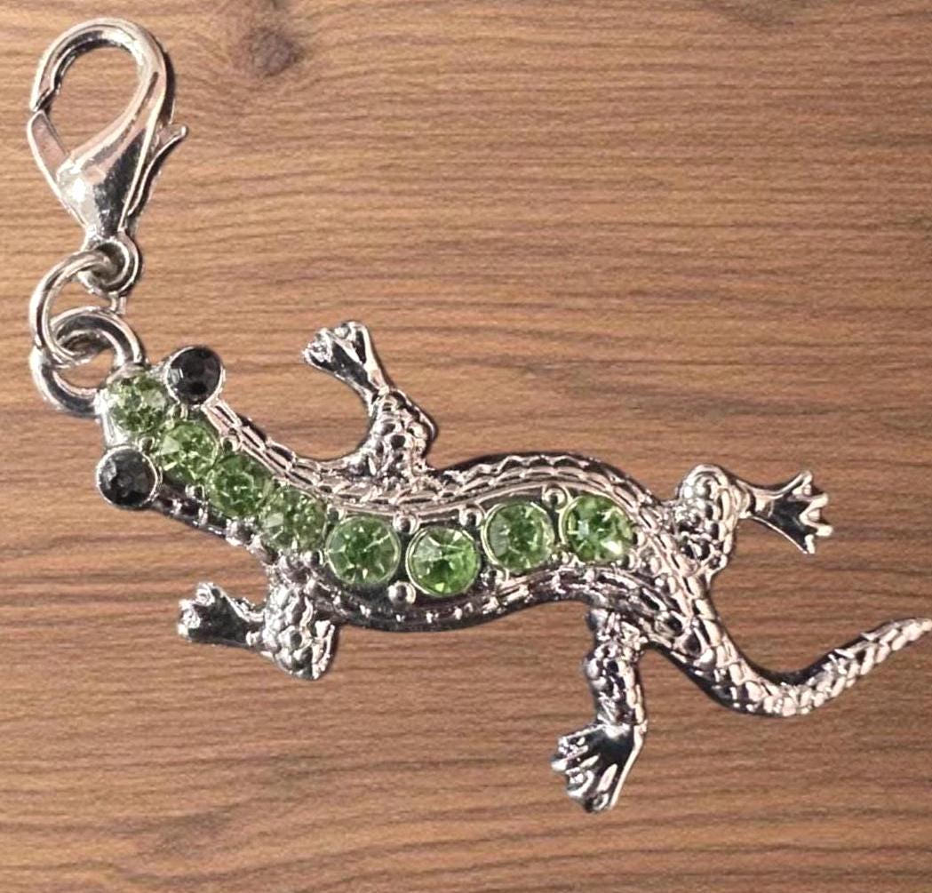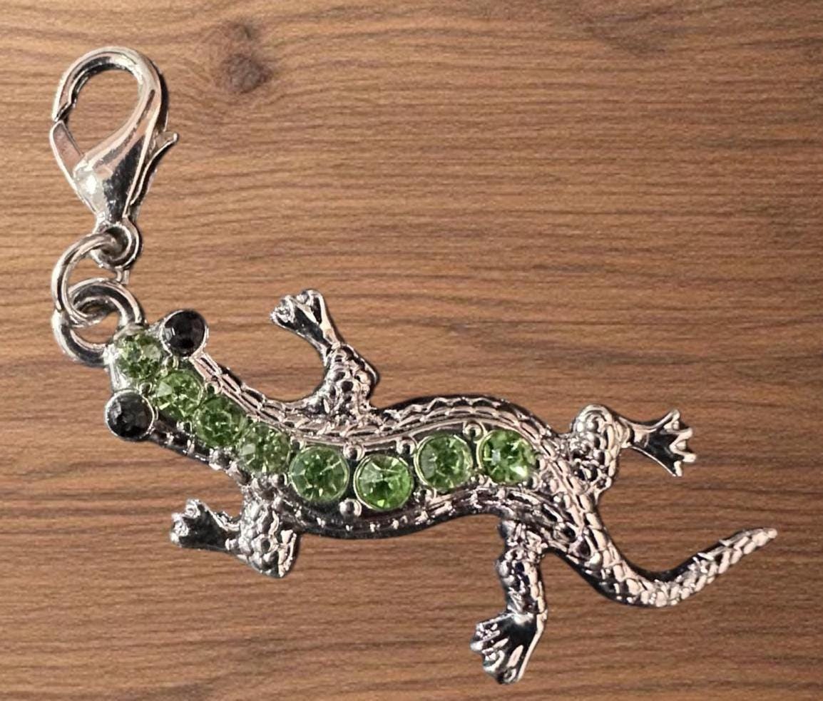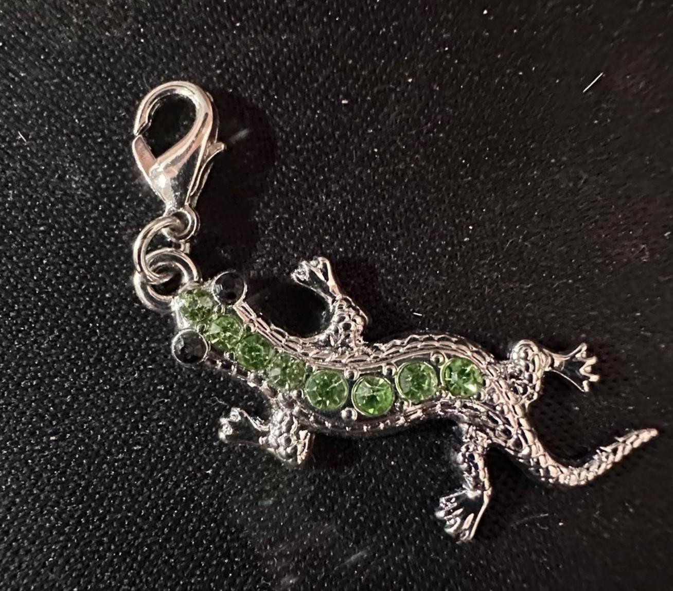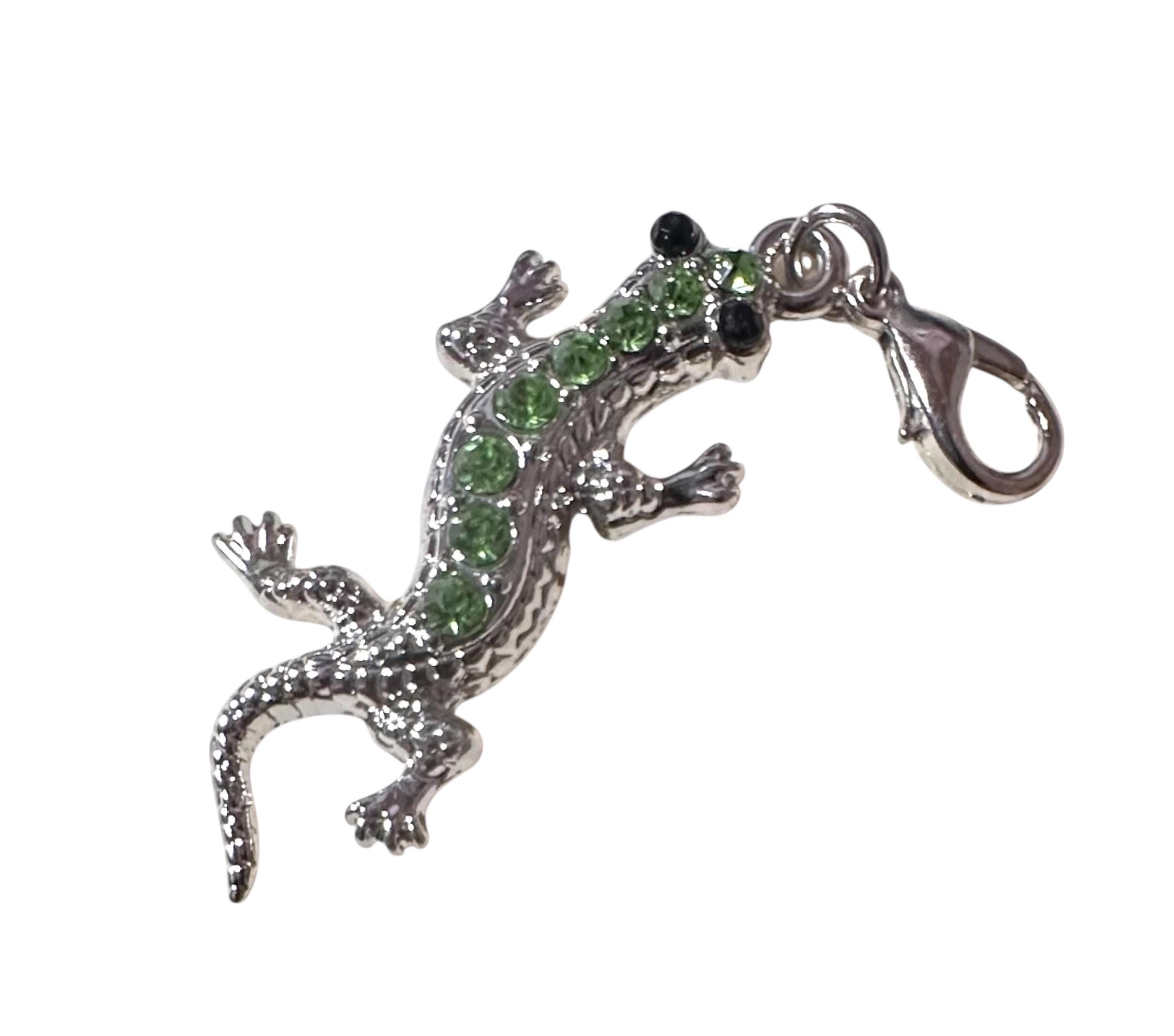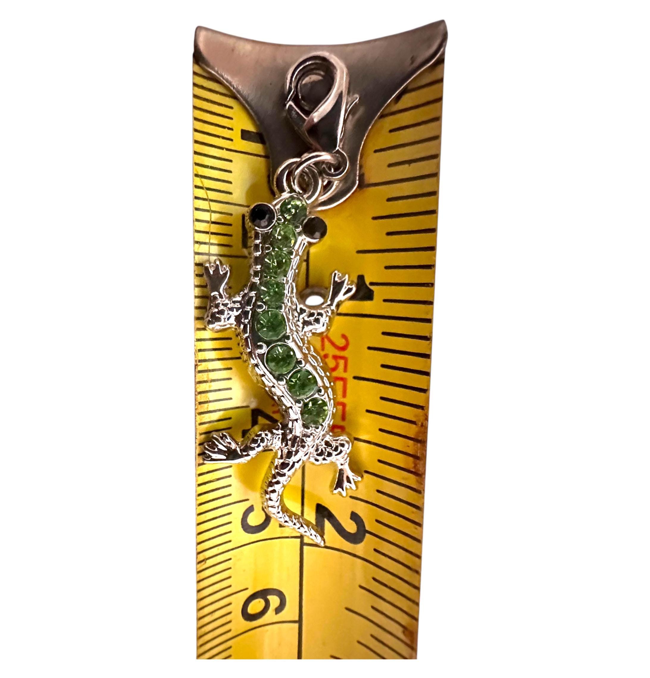 Rhinestone Gecko Charm: Silver-Tone Lizard, Green & Red Accents