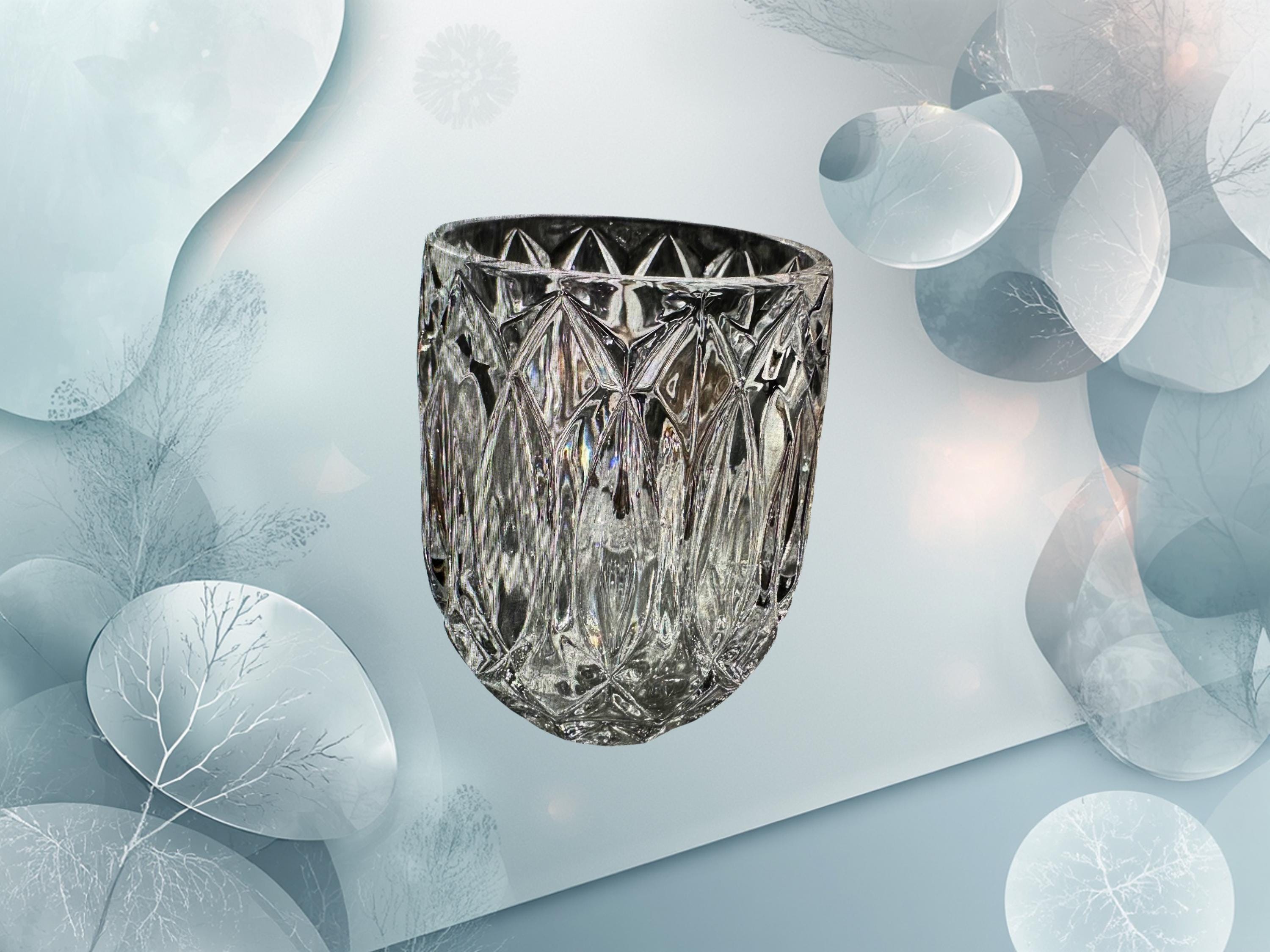 * Four-inch tall clear pressed glass construction with beautiful arc panel cuts