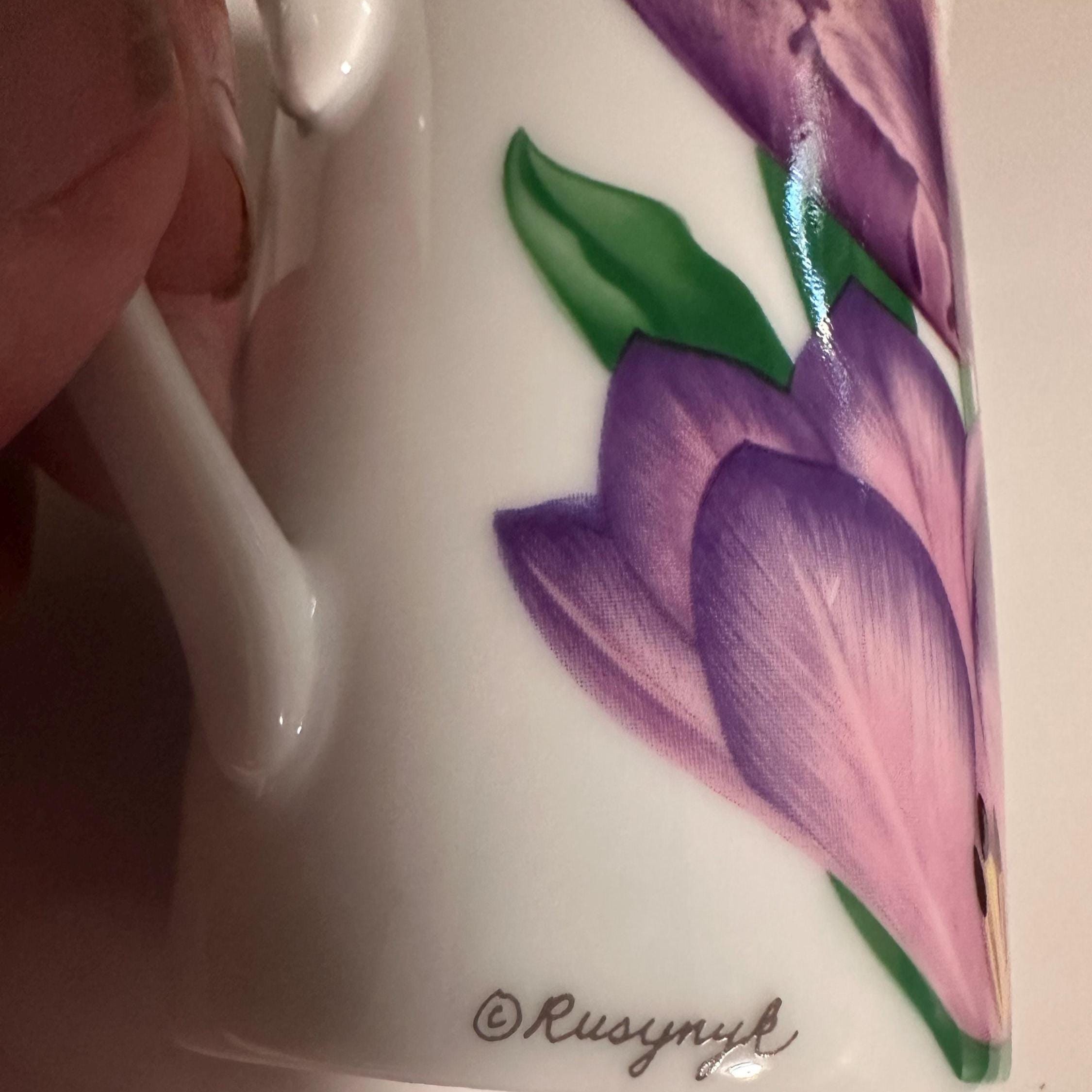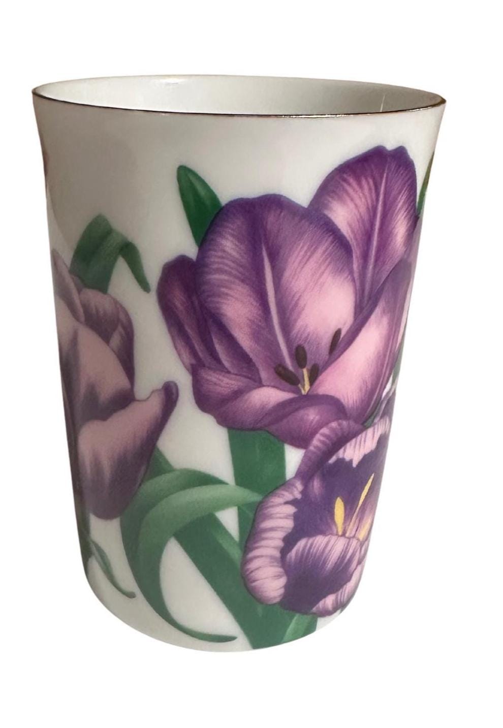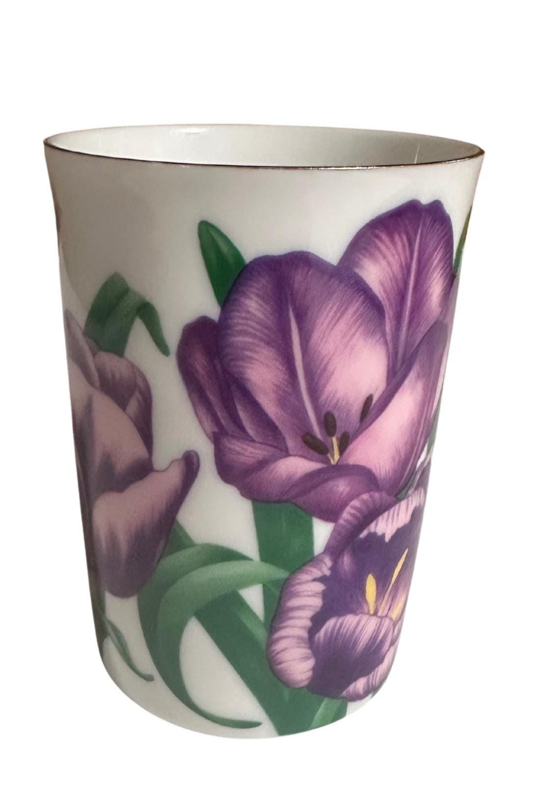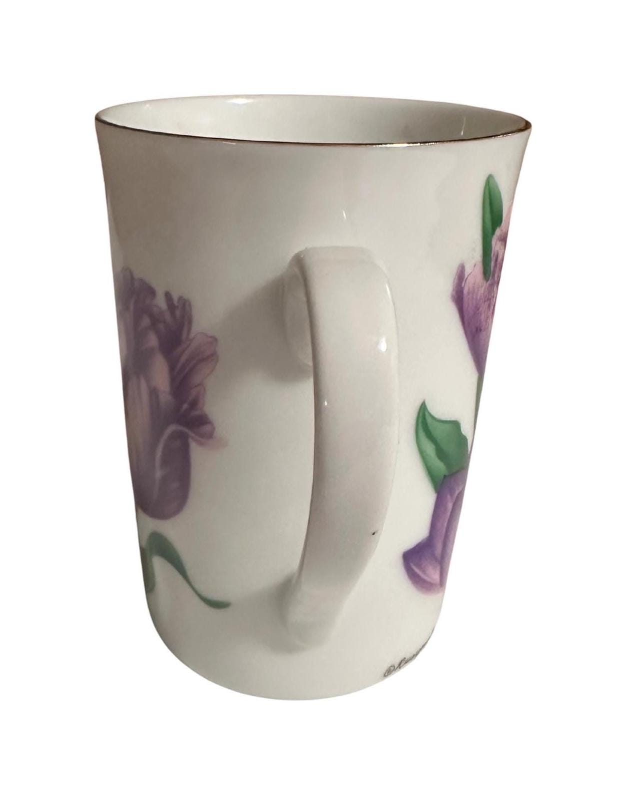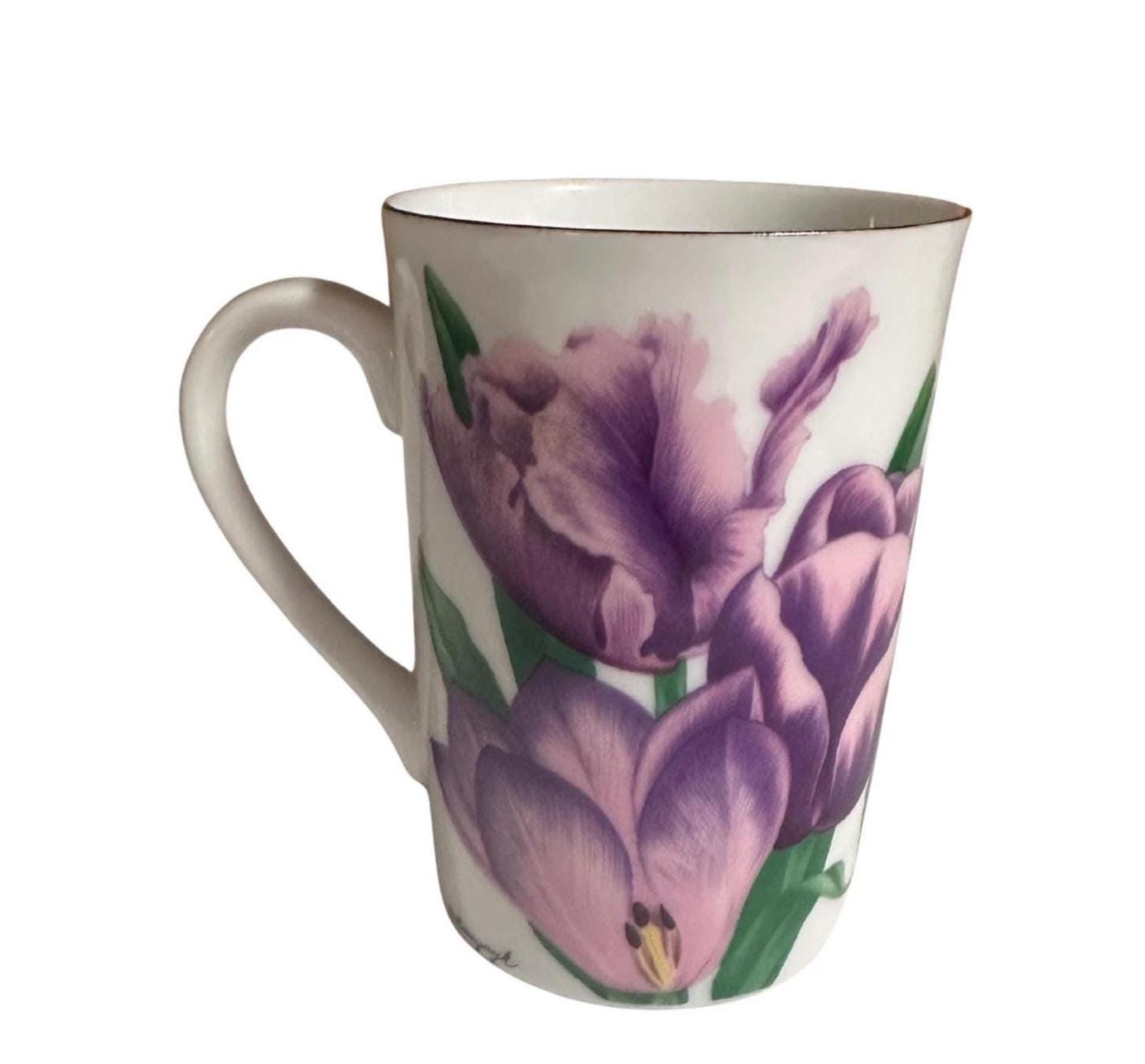 Whether you're enjoying your morning brew or looking for a thoughtful gift, this floral mug radiates charm and sophistication. Its lightweight yet durable bone china construction ensures a comfortable grip and lasting beauty. The hand-painted purple tulips add a splash of color and nature-inspired serenity to your tableware collection.