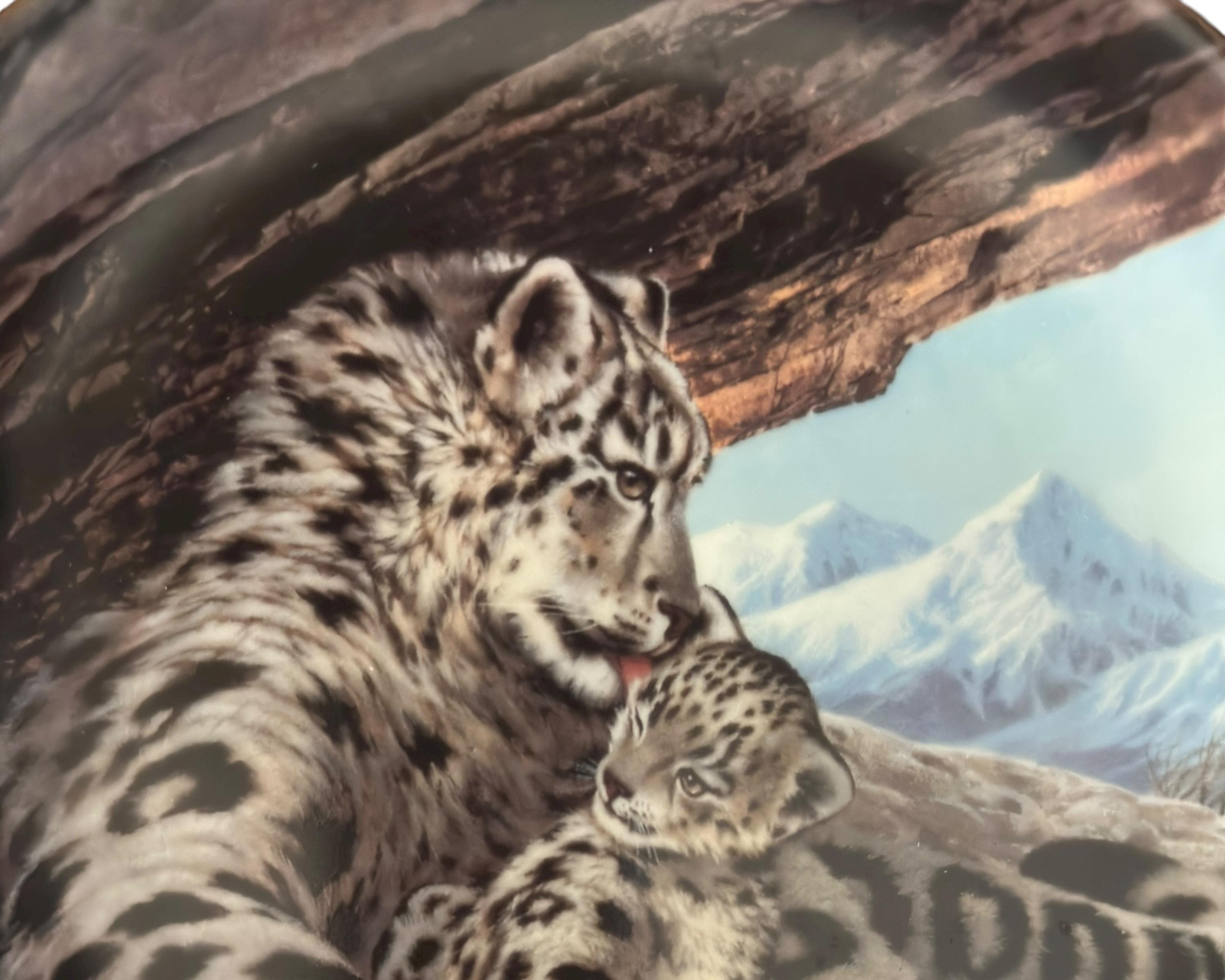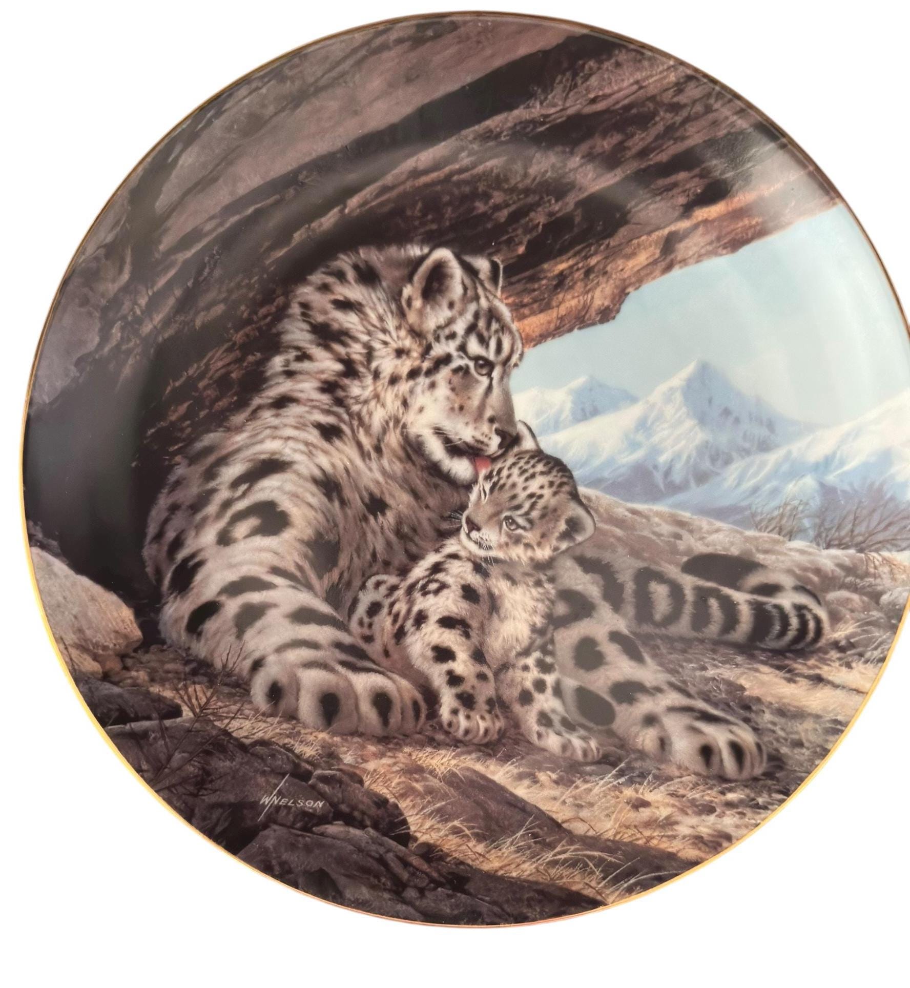 Discover the stunning Snow Leopard Collector Wall Plate from the Last of Their Kind 1989 Series by W. L. George Fine China. This exquisite piece features a beautifully detailed illustration by Will Nelson, showcasing a majestic snow leopard and her cub nestled within a rugged mountainous landscape. Perfect for wildlife enthusiasts and collectors alike, this plate captures the elusive beauty of one of nature’s most endangered species.