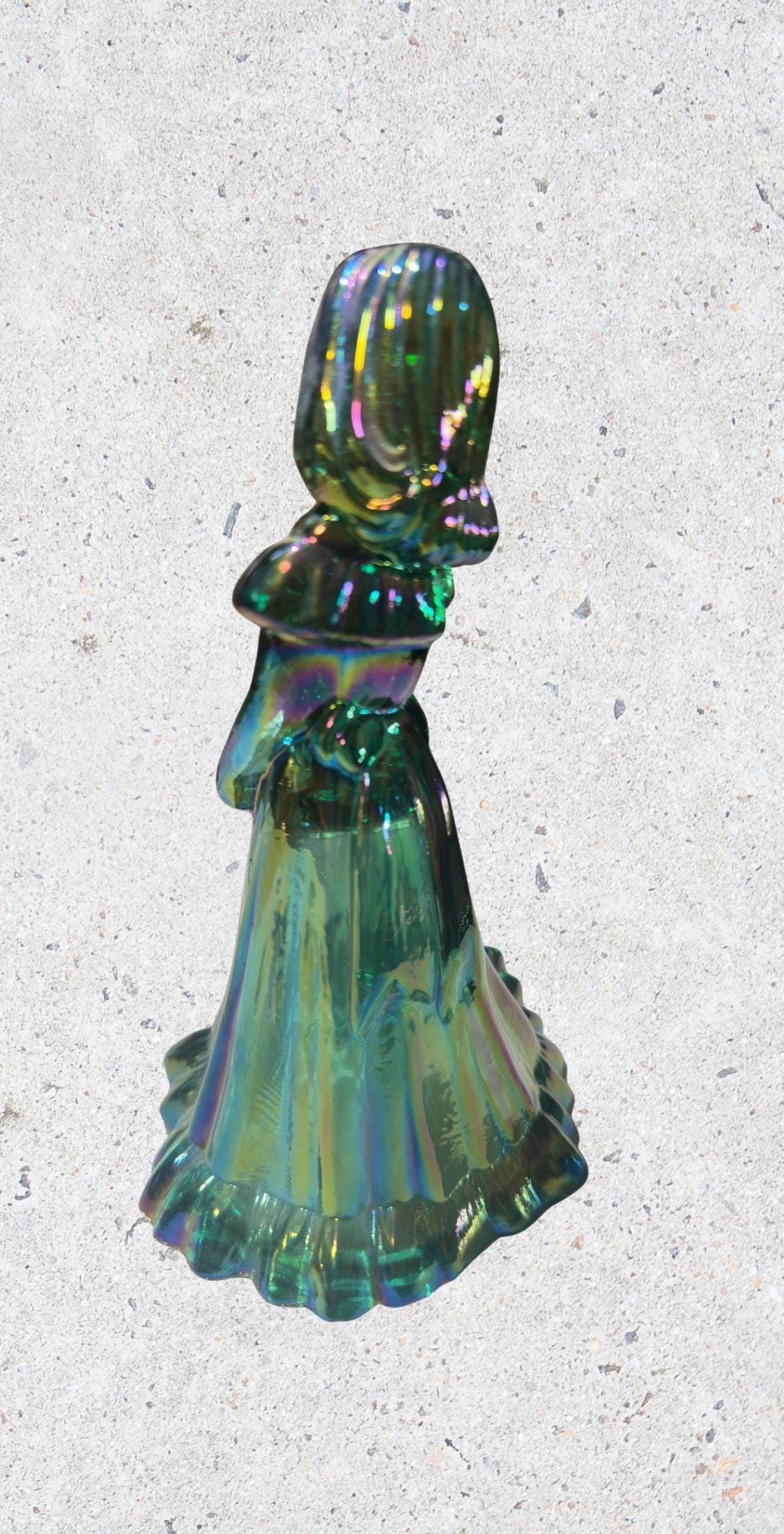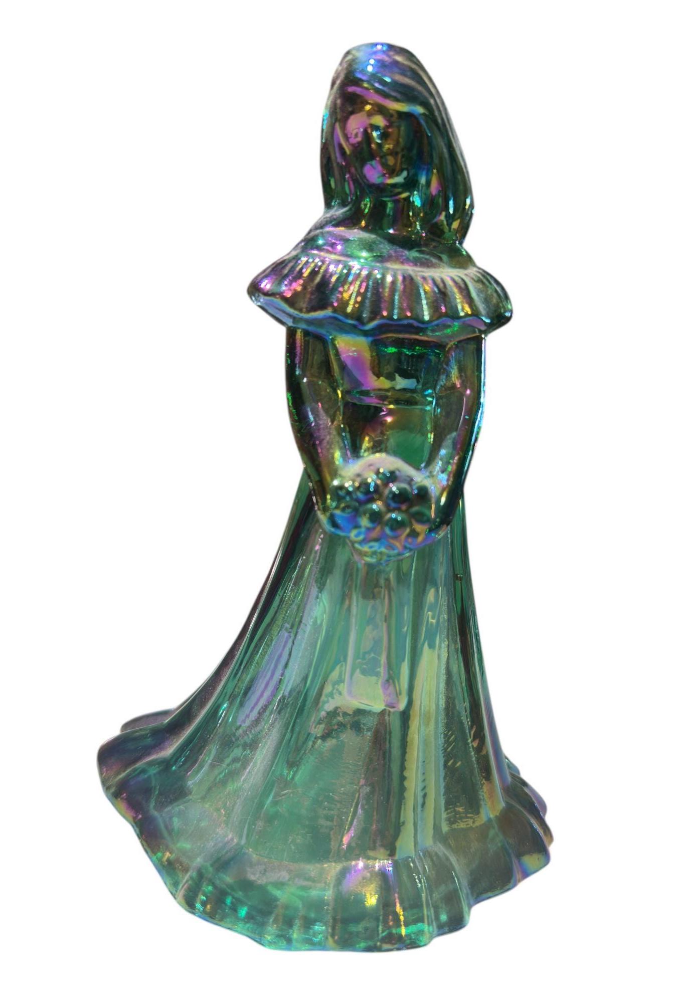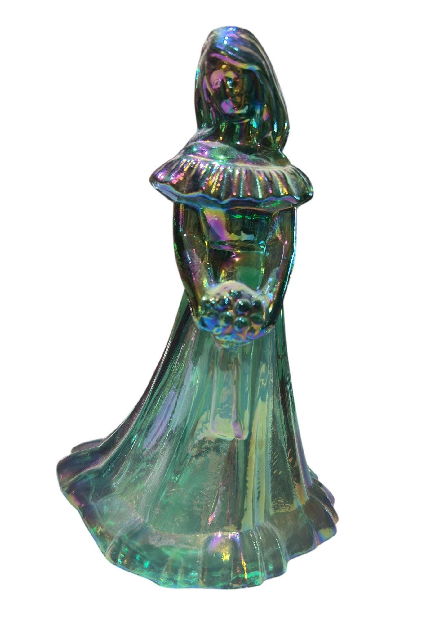 Crafted from high-quality carnival glass, the figurine features a captivating iridescent sheen that shifts beautifully in the light, showcasing hues of green, purple, and gold. The detailed hand painting highlights the bridesmaid's graceful attire, adding a touch of artistry and nostalgia. Its elegant design and shimmering surface make it a standout piece that draws admiration from all who see it.