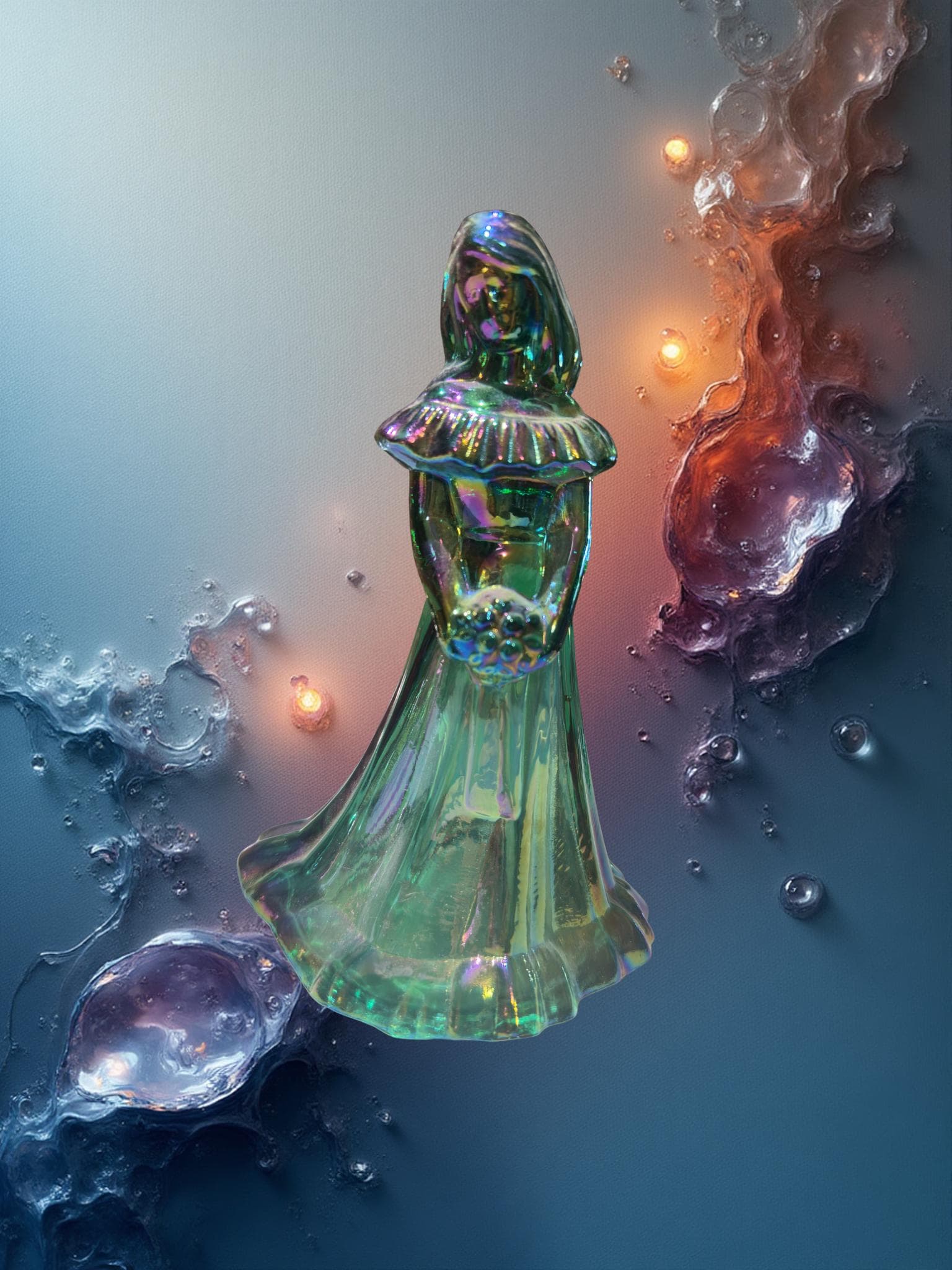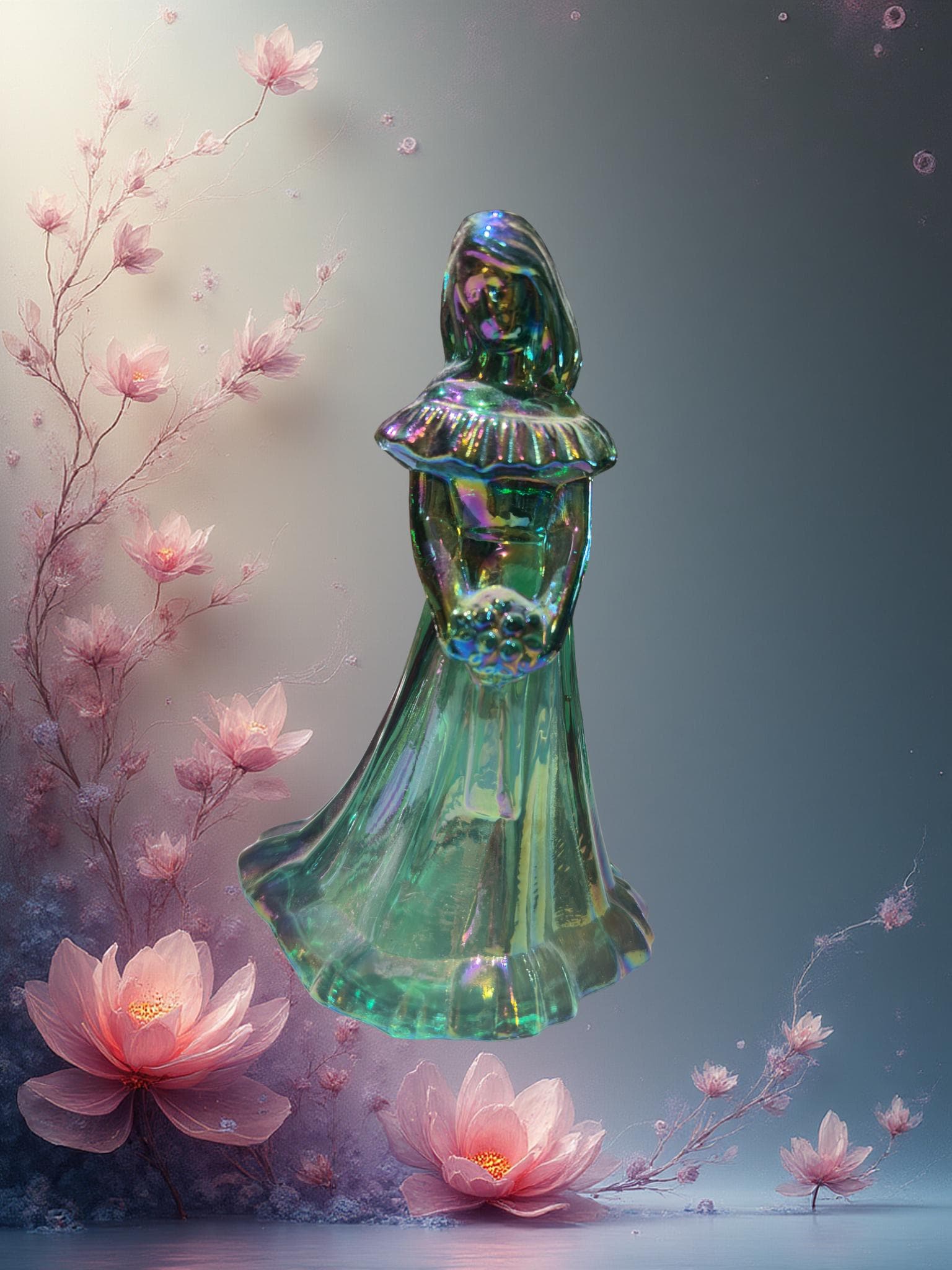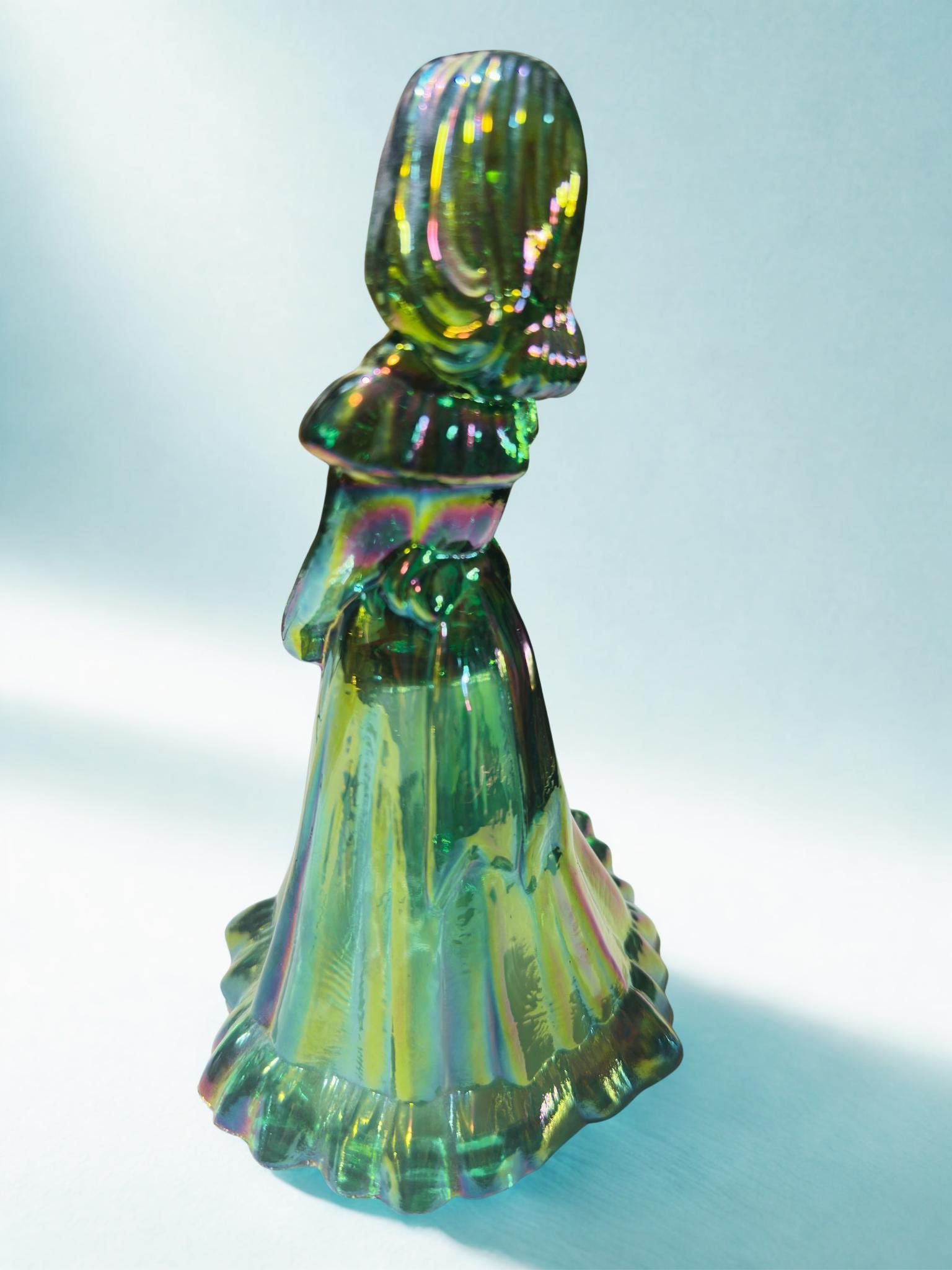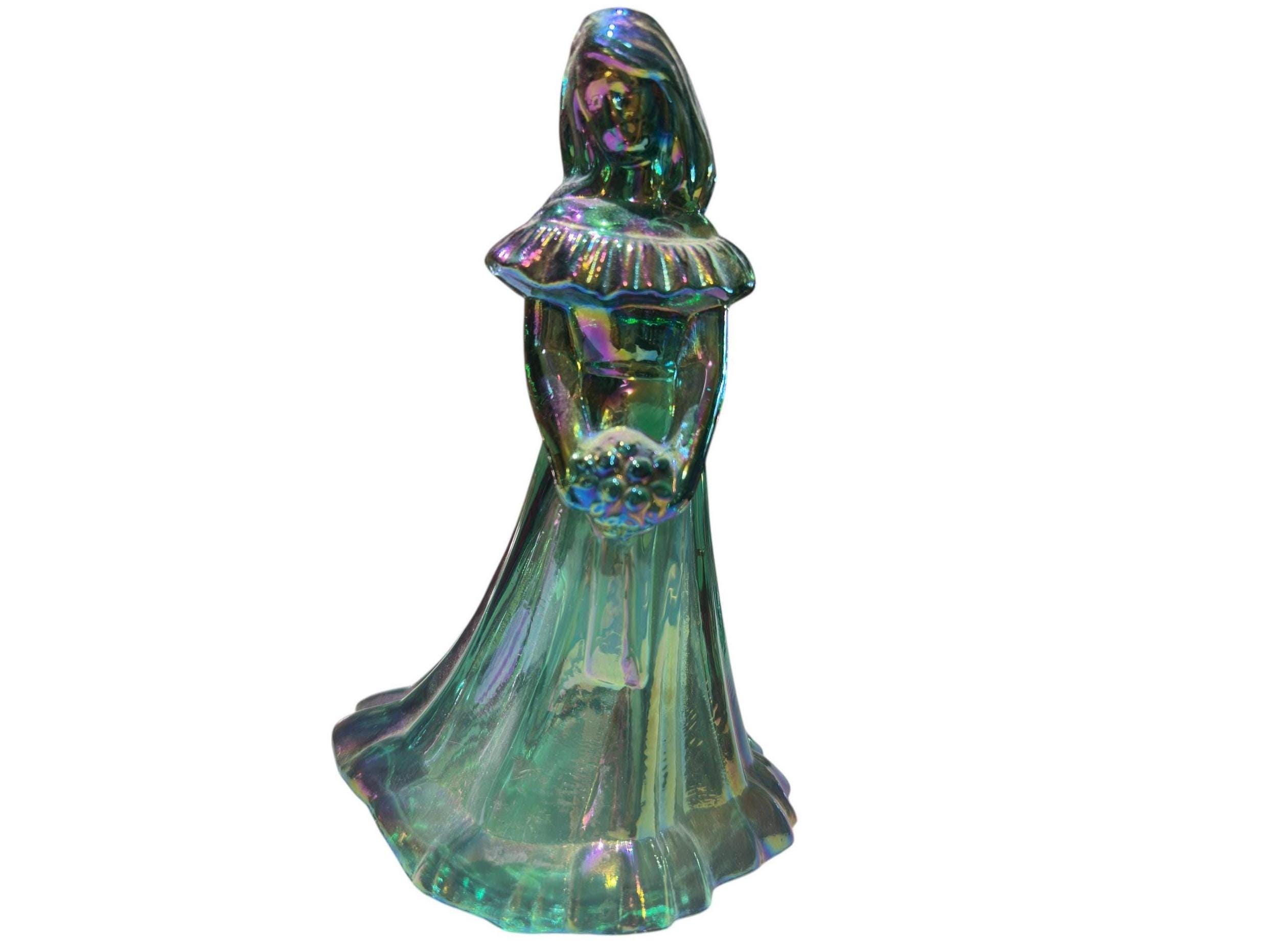 Crafted from high-quality carnival glass, the figurine features a captivating iridescent sheen that shifts beautifully in the light, showcasing hues of green, purple, and gold. The detailed hand painting highlights the bridesmaid's graceful attire, adding a touch of artistry and nostalgia. Its elegant design and shimmering surface make it a standout piece that draws admiration from all who see it.