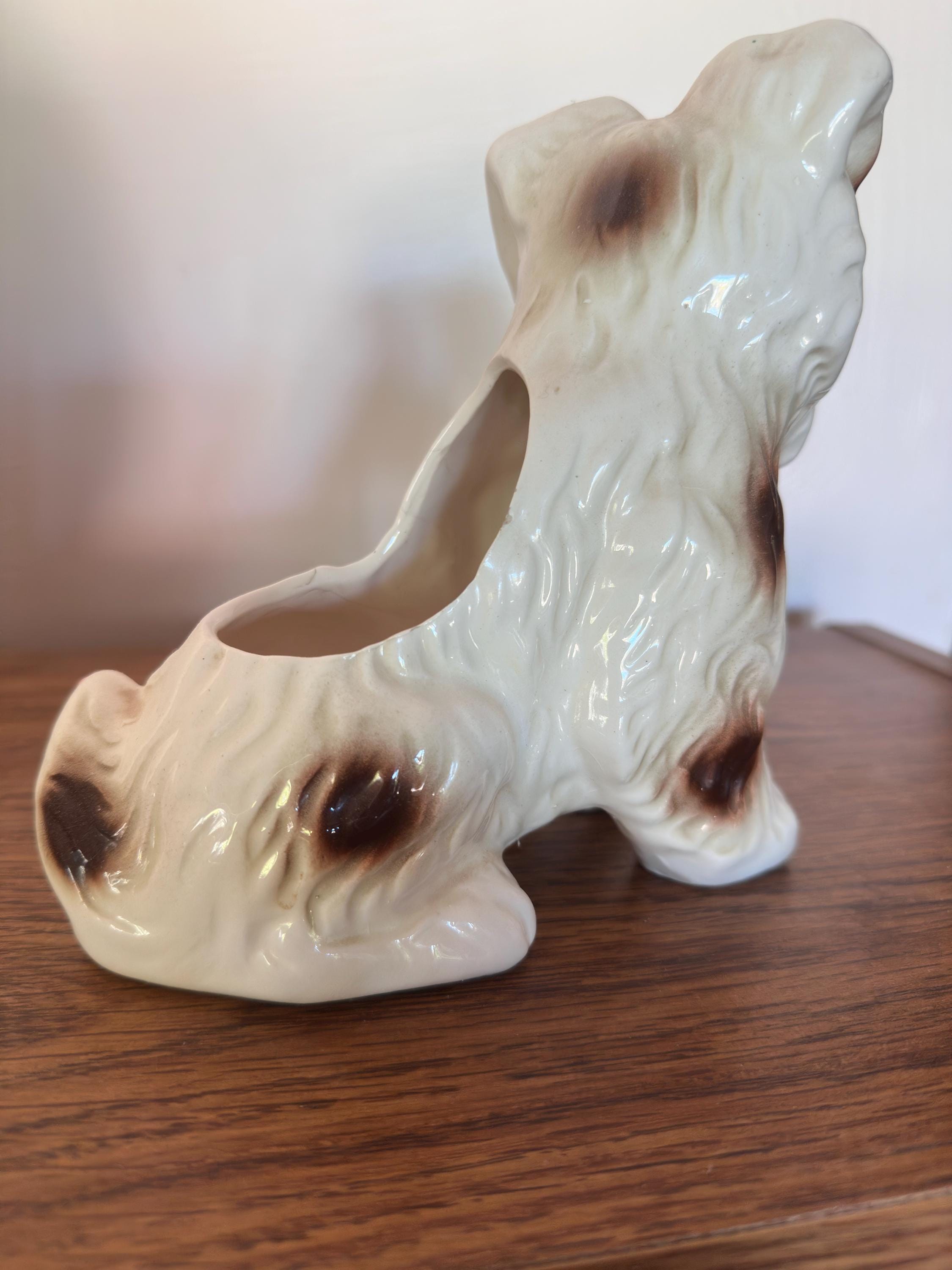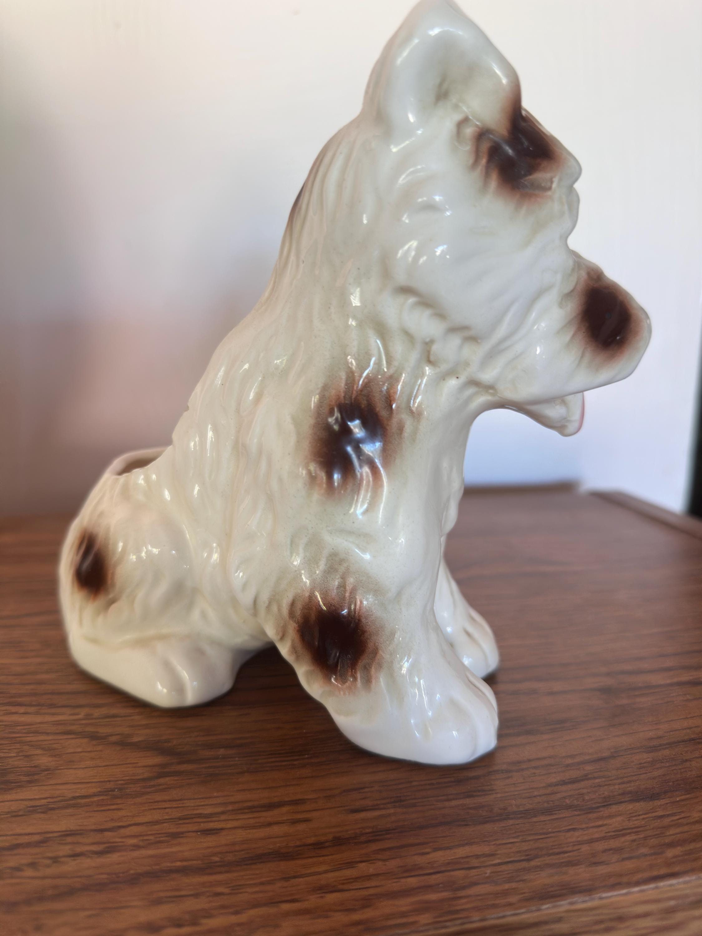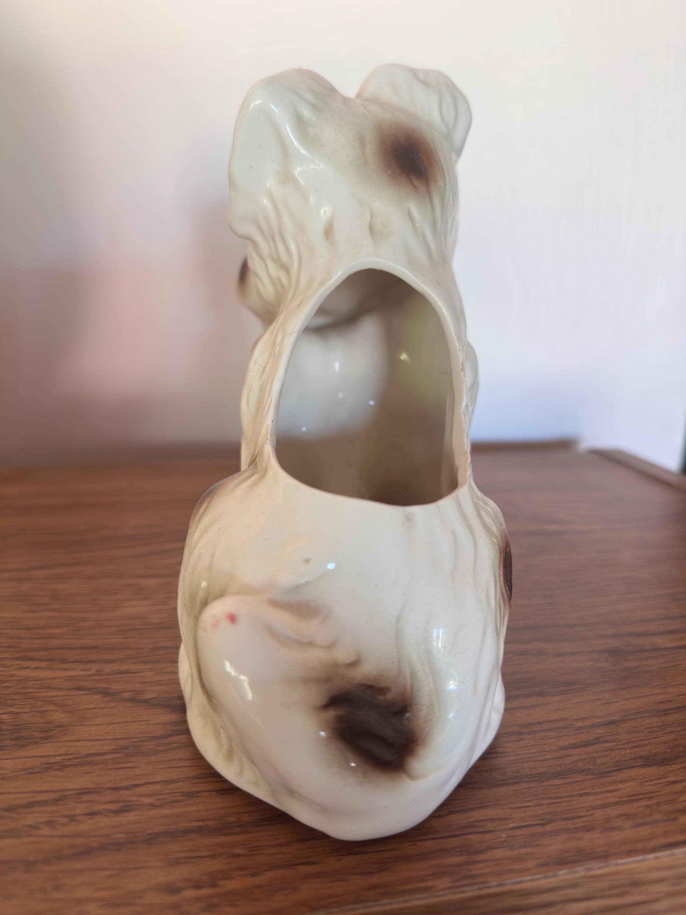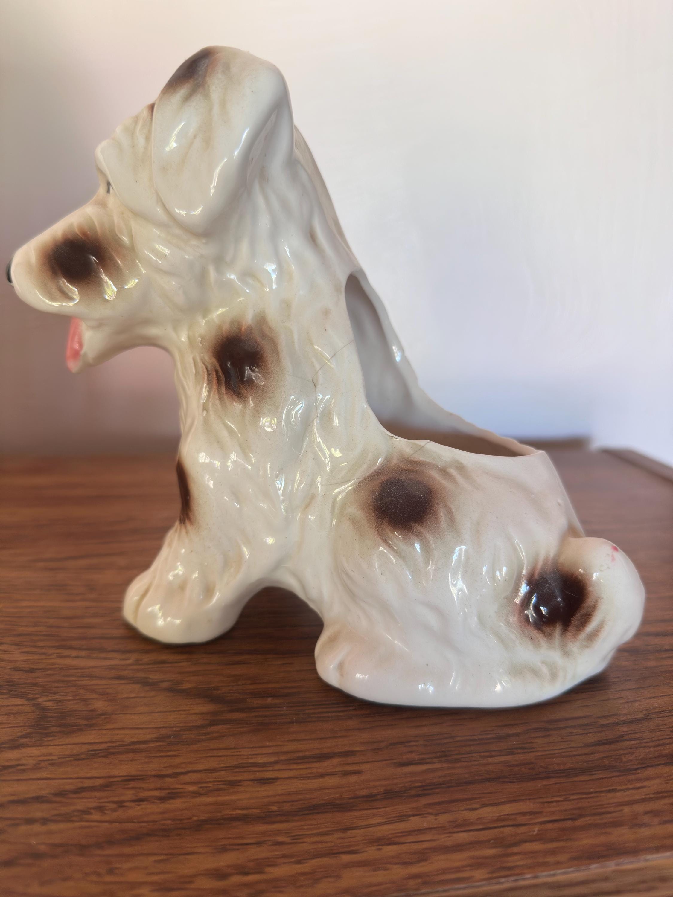 Made from high-quality ceramic, this dog planter is durable and easy to clean. Its compact size makes it ideal for desks, shelves, or window sills, adding a pop of cuteness wherever it sits. Whether you're looking to brighten your home, gift a dog-loving friend, or add a unique touch to your garden decor, this terrier vase is a perfect choice. This is a fragile ceramic old planter with visible hairline and tiny, tiny chips around the opening.