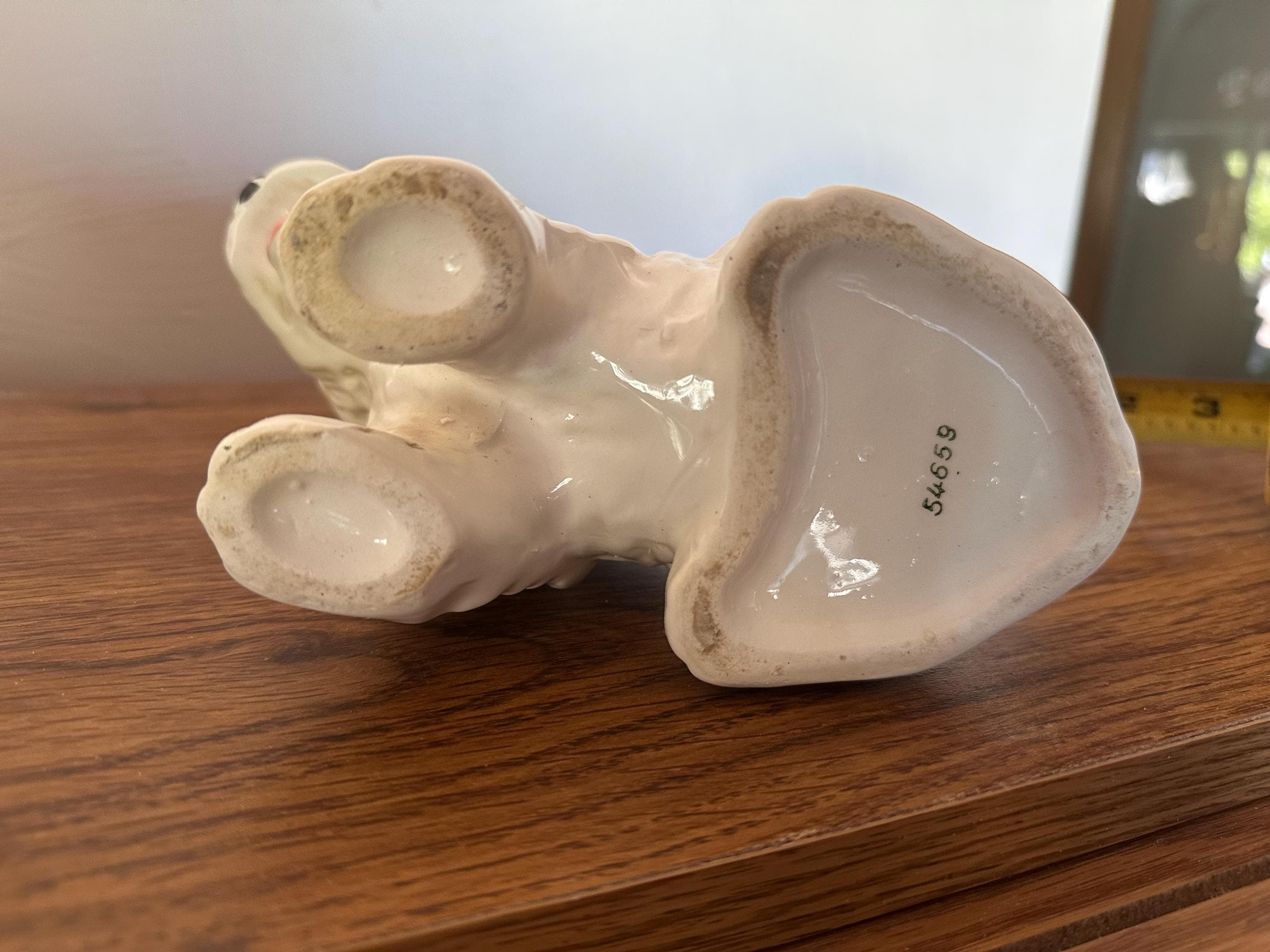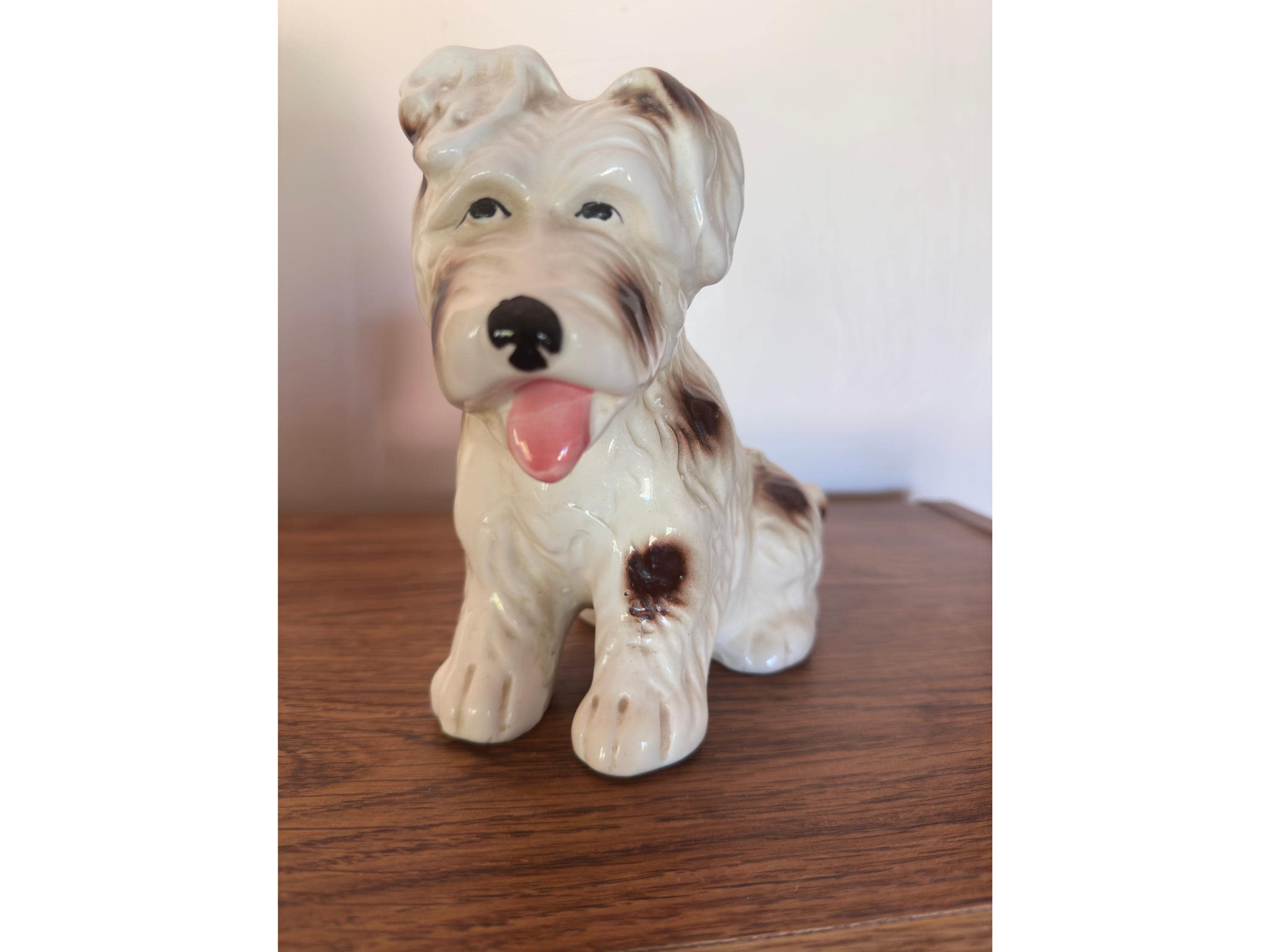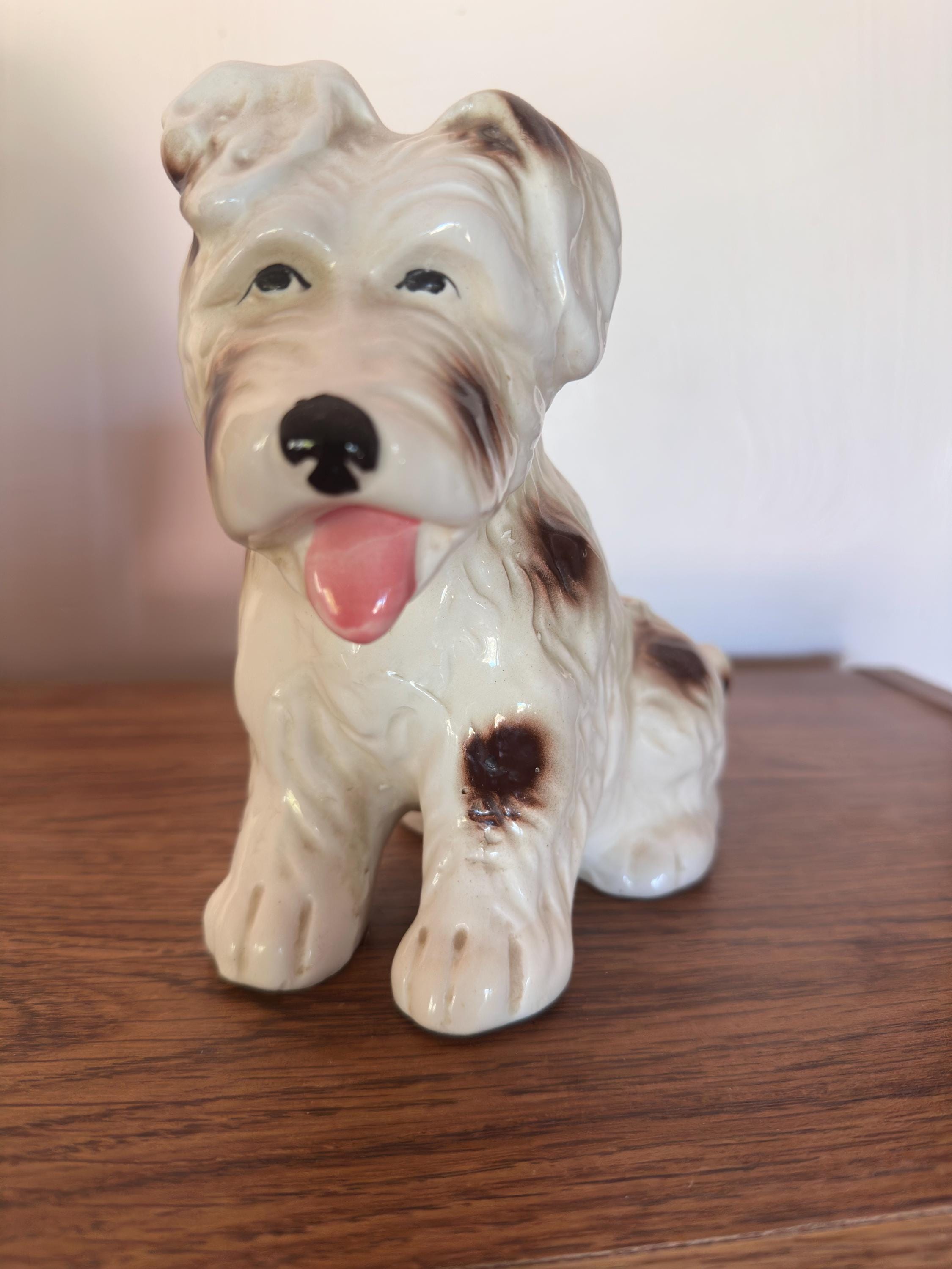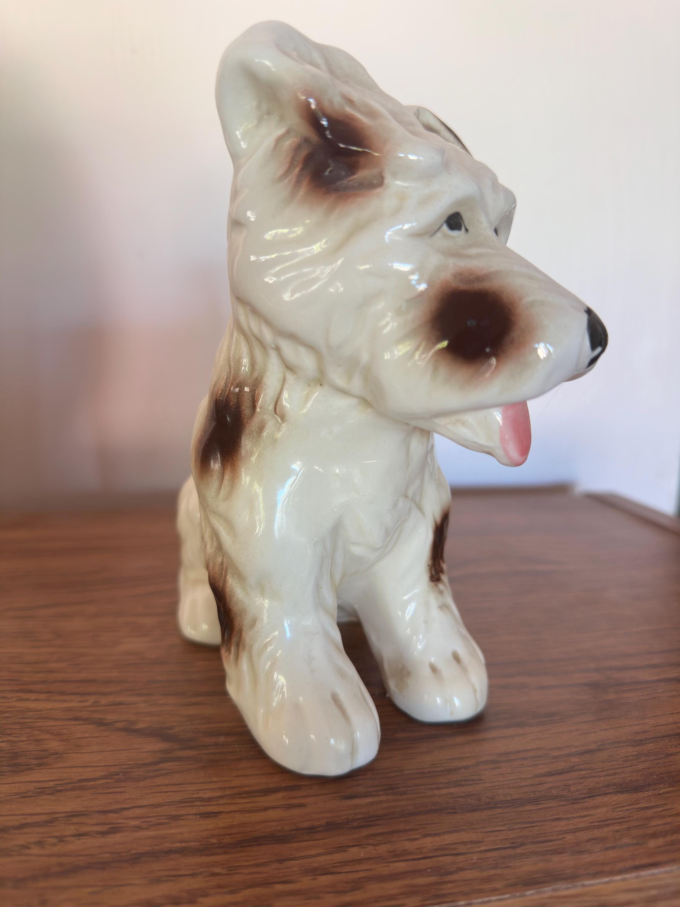 Made from high-quality ceramic, this dog planter is durable and easy to clean. Its compact size makes it ideal for desks, shelves, or window sills, adding a pop of cuteness wherever it sits. Whether you're looking to brighten your home, gift a dog-loving friend, or add a unique touch to your garden decor, this terrier vase is a perfect choice. This is a fragile ceramic old planter with visible hairline and tiny, tiny chips around the opening.