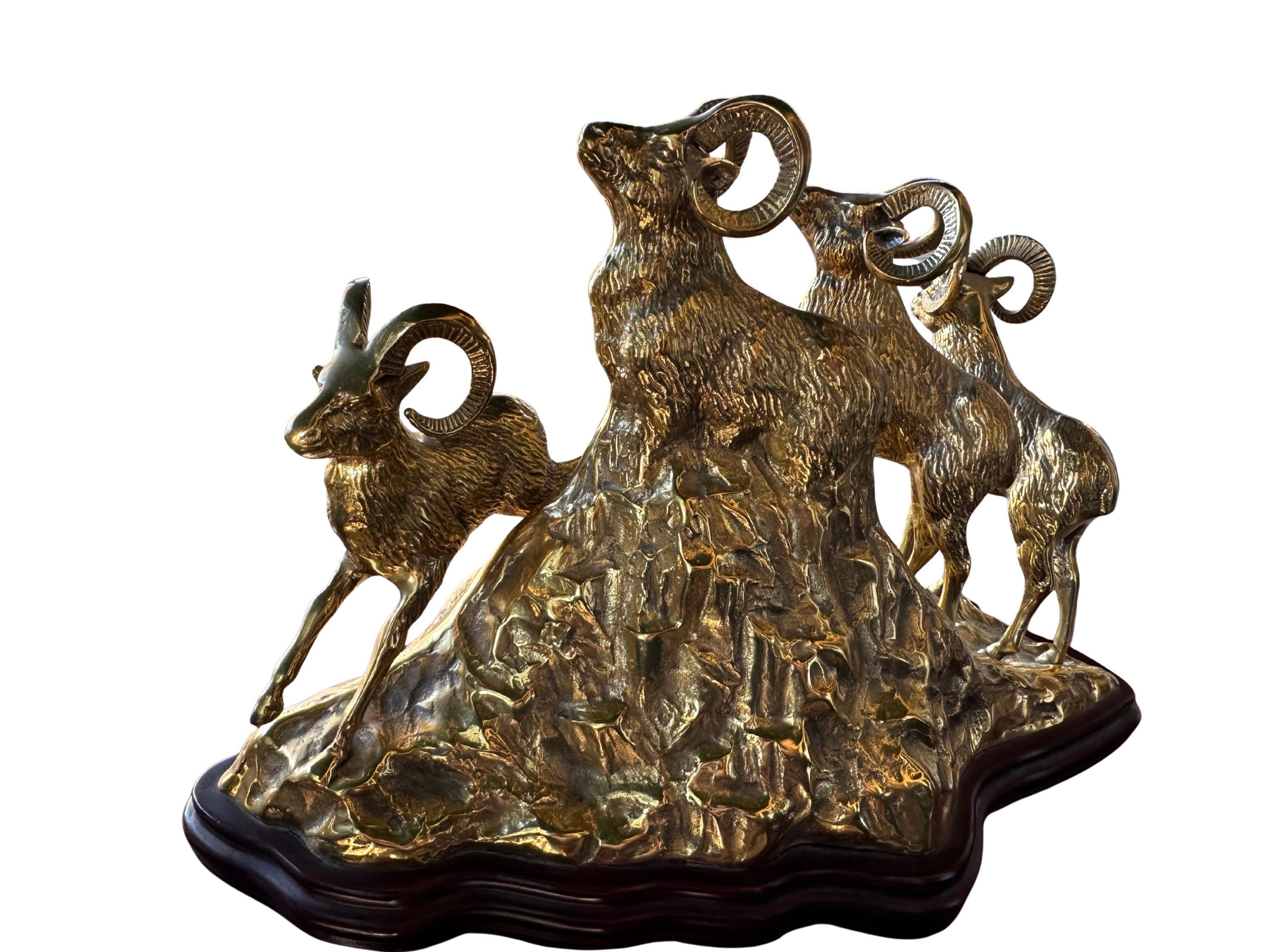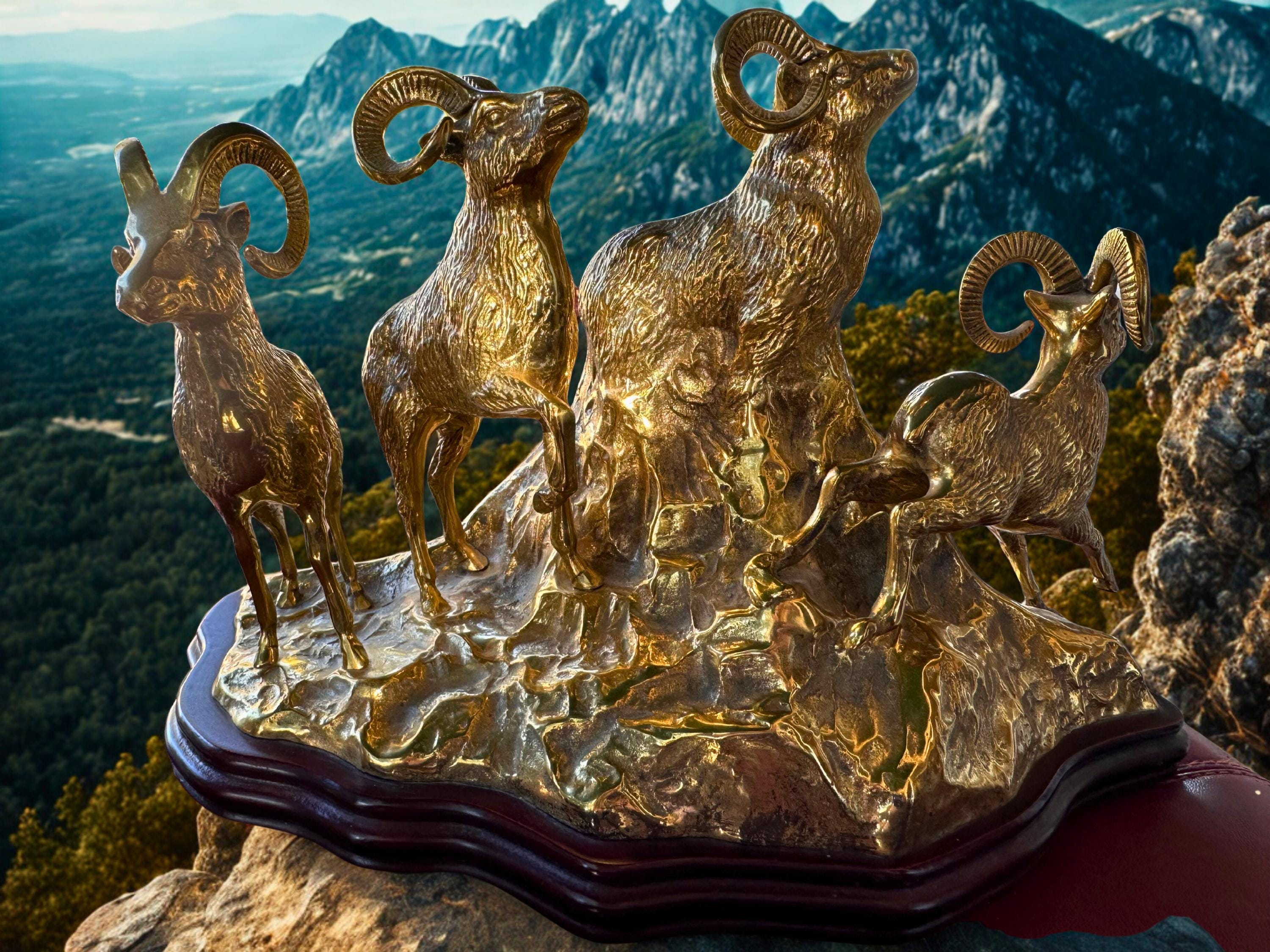 Made from high-quality brass with an aged patina finish, this figurine features intricate detailing that highlights the majestic horns and textured fur of the mountain sheep. The sculpture depicts a proud sheep standing atop a textured mountain base, symbolizing strength and resilience in the wild.