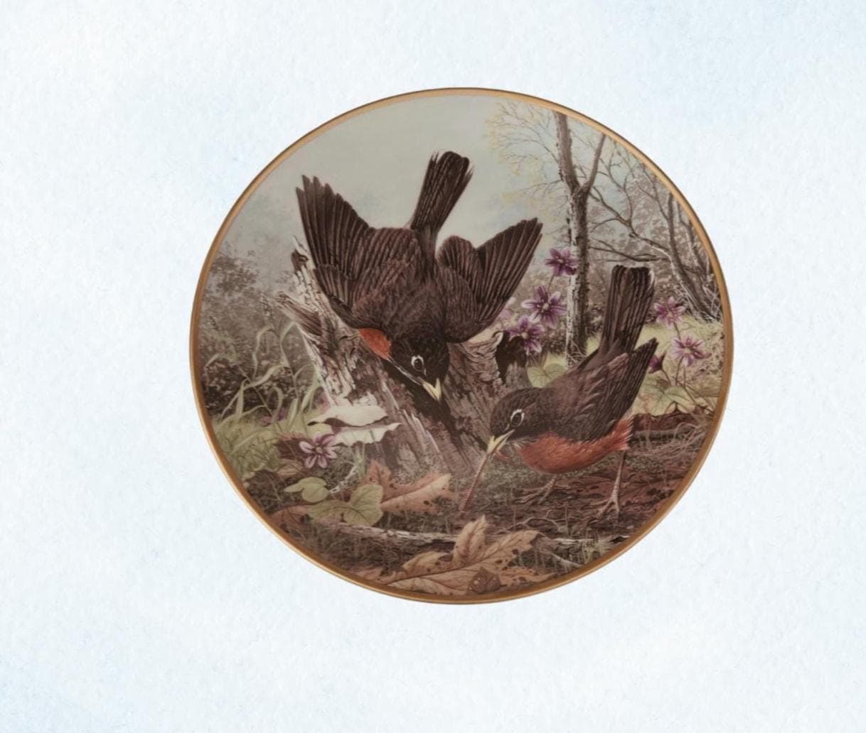 ROBINS Hunting For Food Vintage Porcelain Bird Collector Plate A. J. Rudisill National Audubon Society