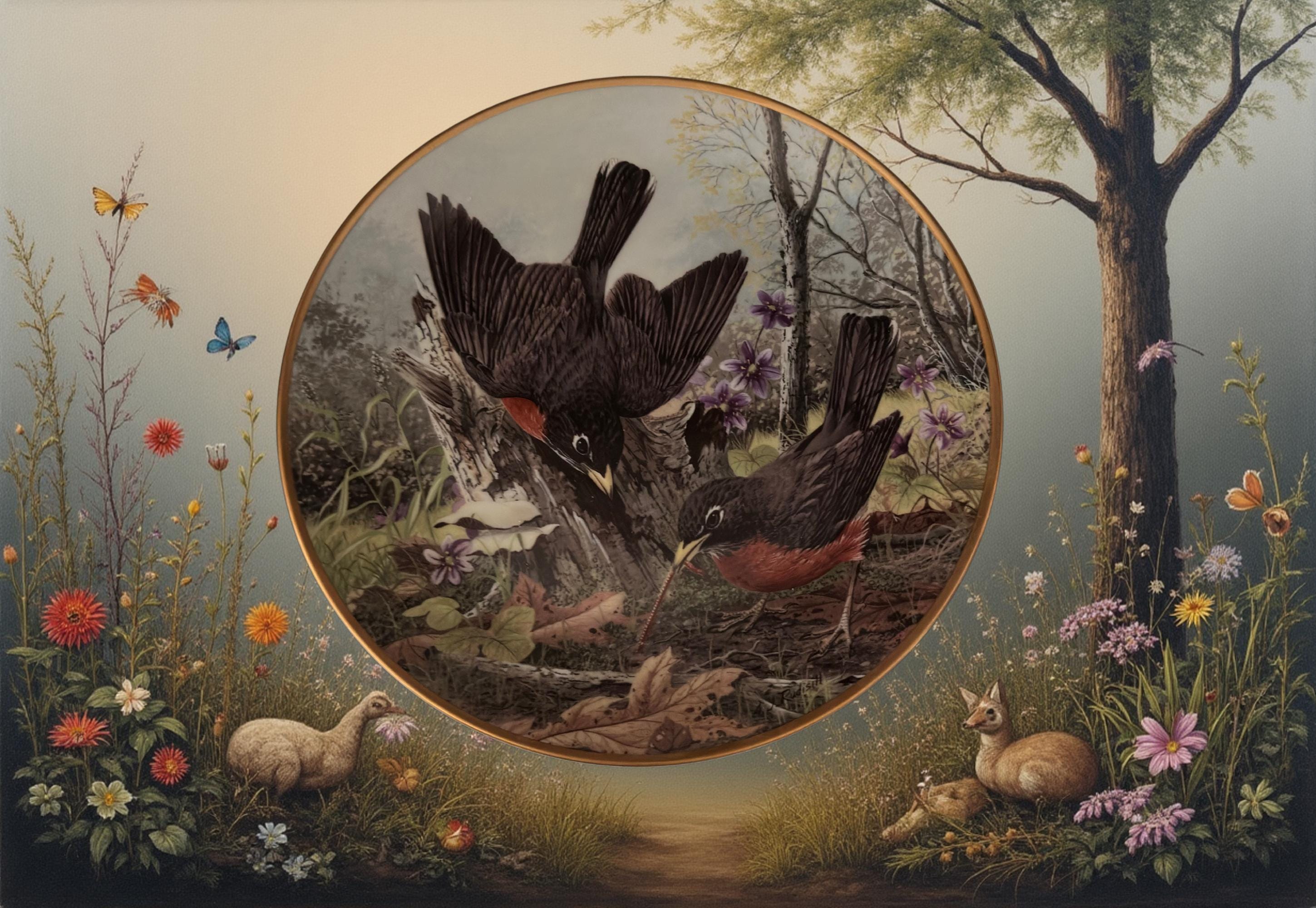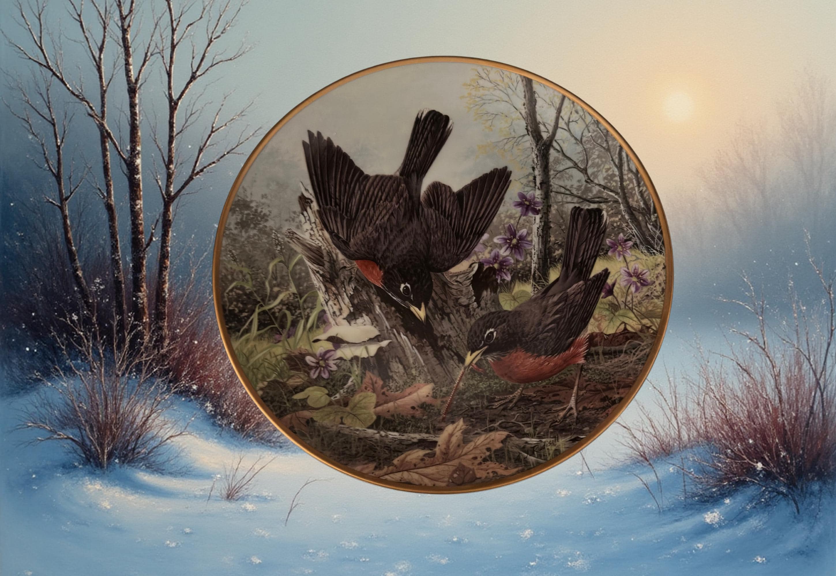 * Design: Detailed illustration of robins hunting for food, inspired by A. J. Rudisill’s artwork