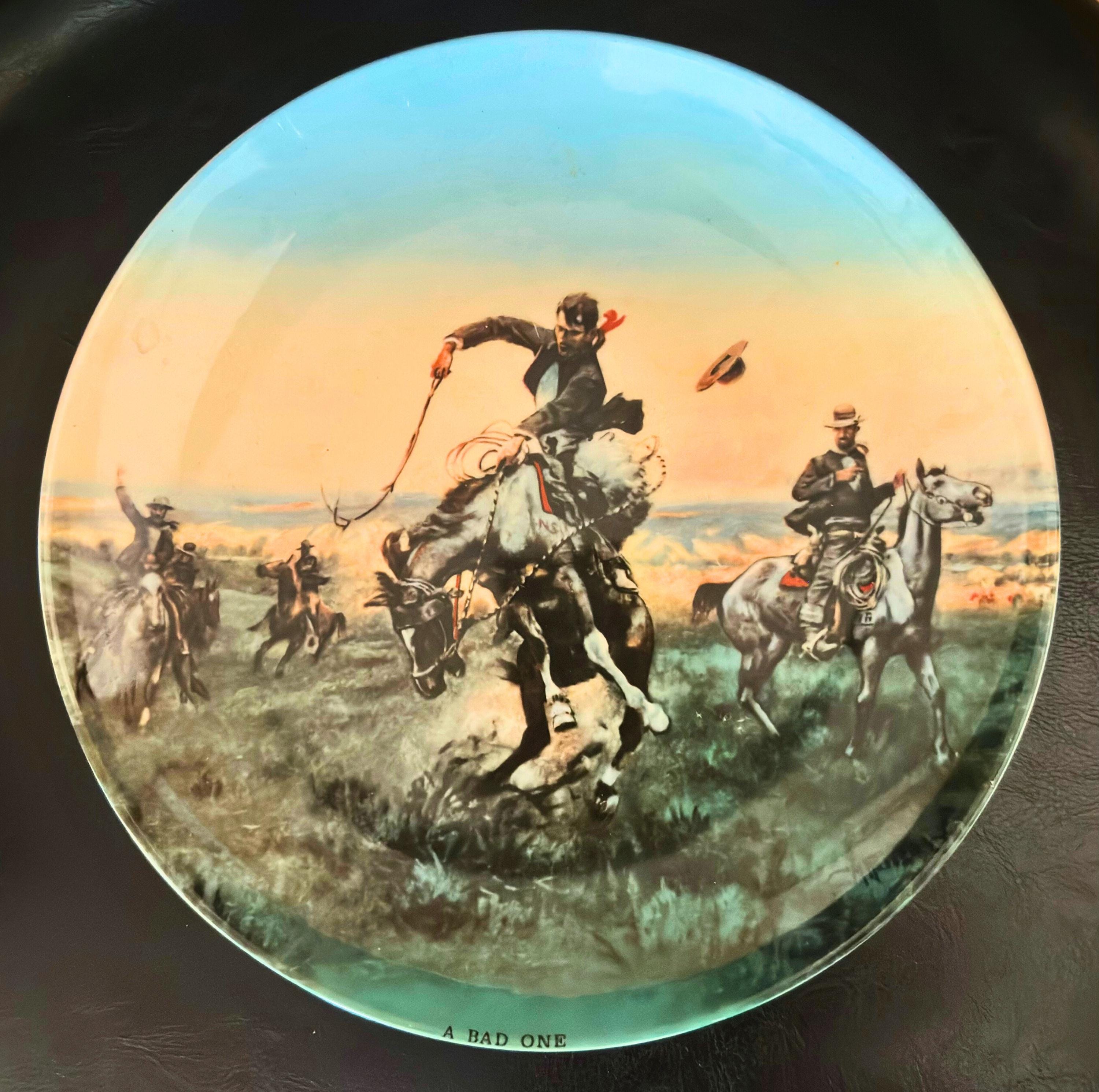 Discover the charm of the American West with this vintage Charles M Russel A Bad One collector plate from The Antique Trader, dated 1971. This beautifully crafted western art plate captures a dynamic old west scene featuring cowboys in action, showcasing Charles M Russel’s iconic style and storytelling. Perfect for collectors or enthusiasts of western memorabilia, this piece brings a nostalgic touch of the Old West right into your home.