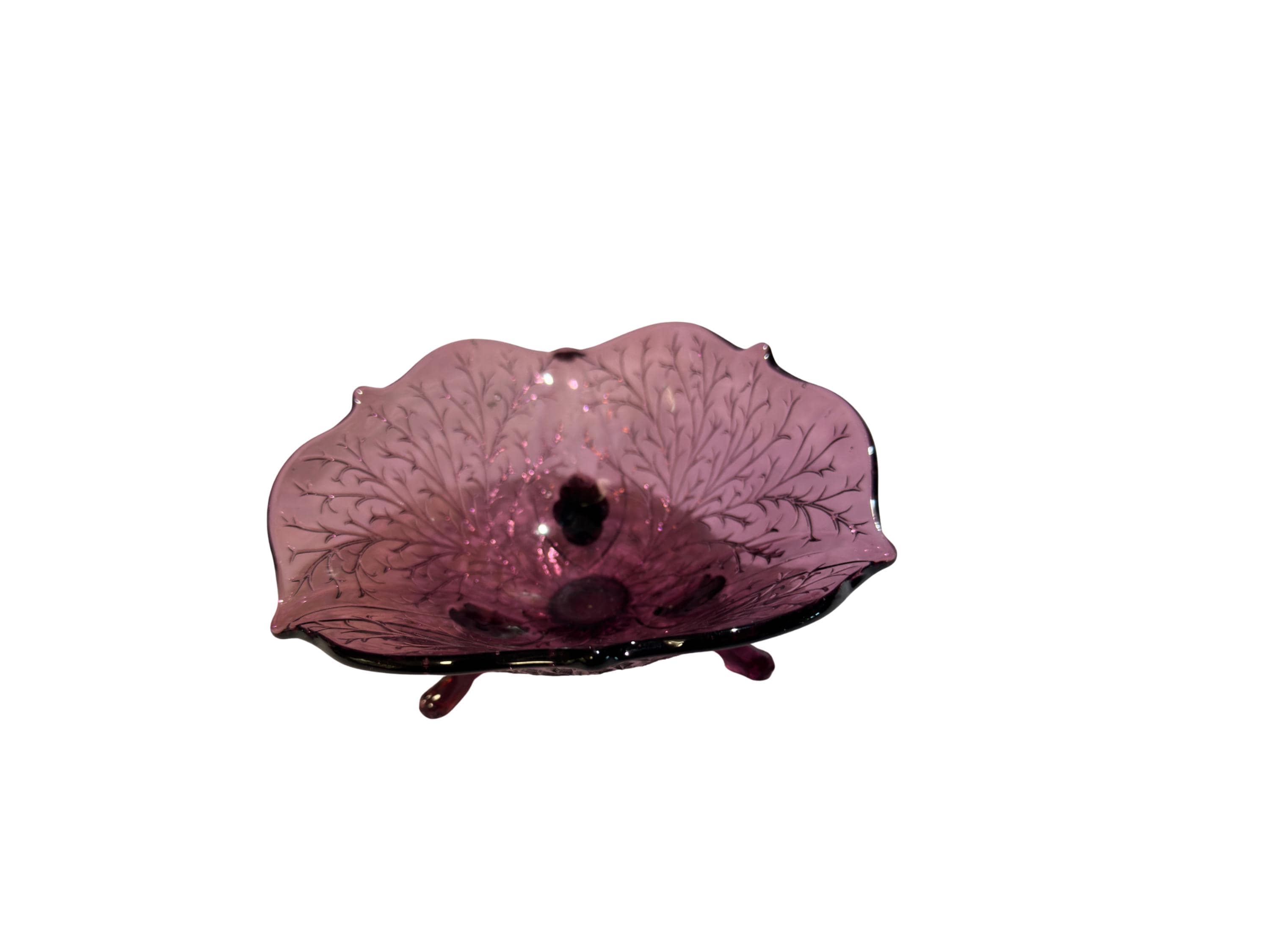 Discover the timeless beauty of the Fenton Art Glass Purple Amethyst Bowl in the stunning Silvertone Wisteria pattern. Crafted between 1934 and 1938, this vintage footed bowl is a perfect blend of elegance and history, making it an exquisite addition to any collection or home décor. The deep purple amethyst hue is complemented by the embossed wisteria or leaf design, adding texture and visual interest that captures the eye.