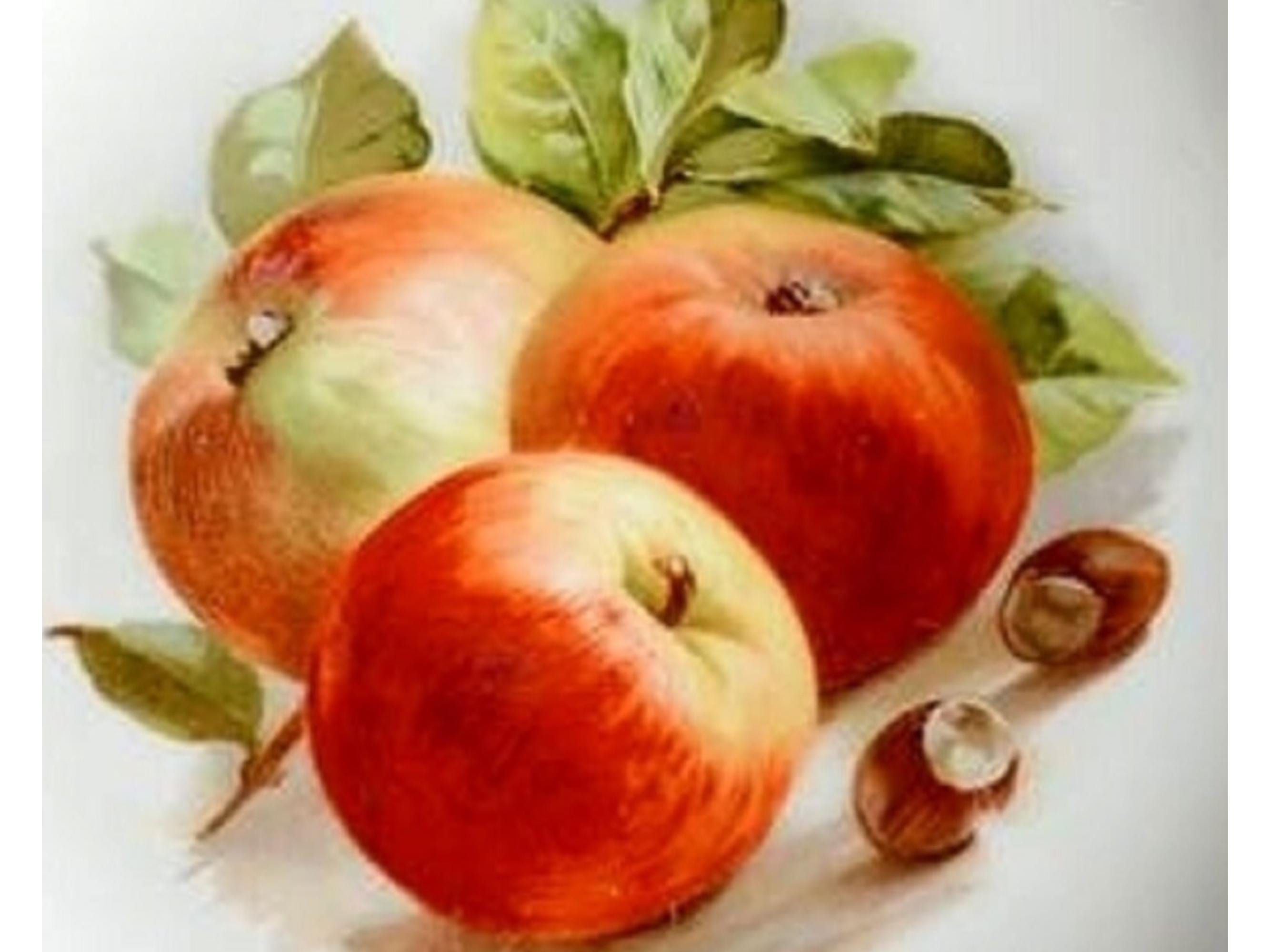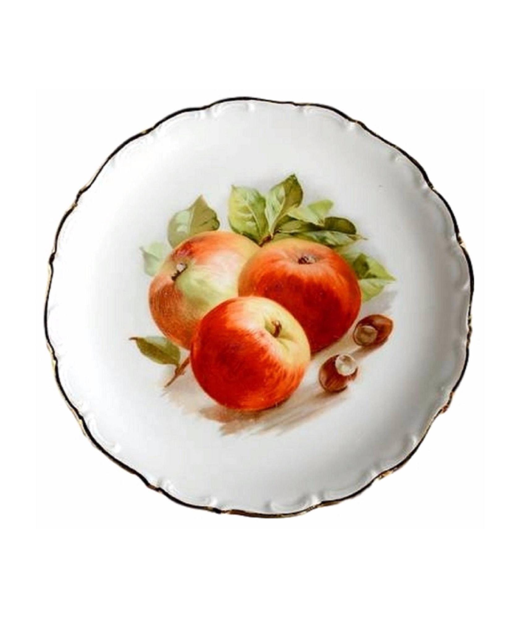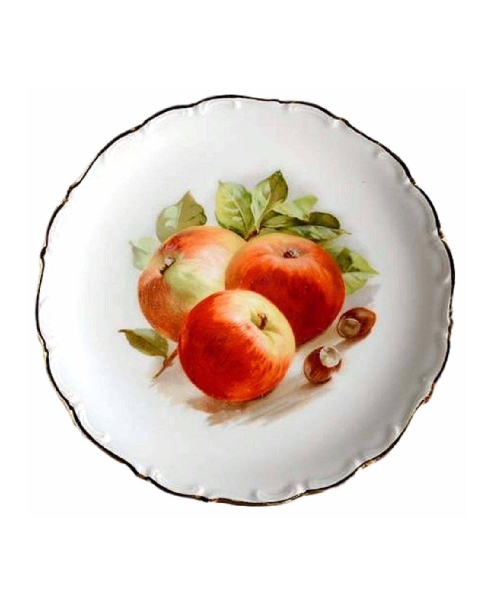Beautiful vintage Schumann fine china porcelain still life art salad plate decorated with fruit, apples, leaves and nuts. This vintage plate is edged in a gold painted rim which is also scalloped. The back stamp shows Bavaria, Arzberg, Germany.