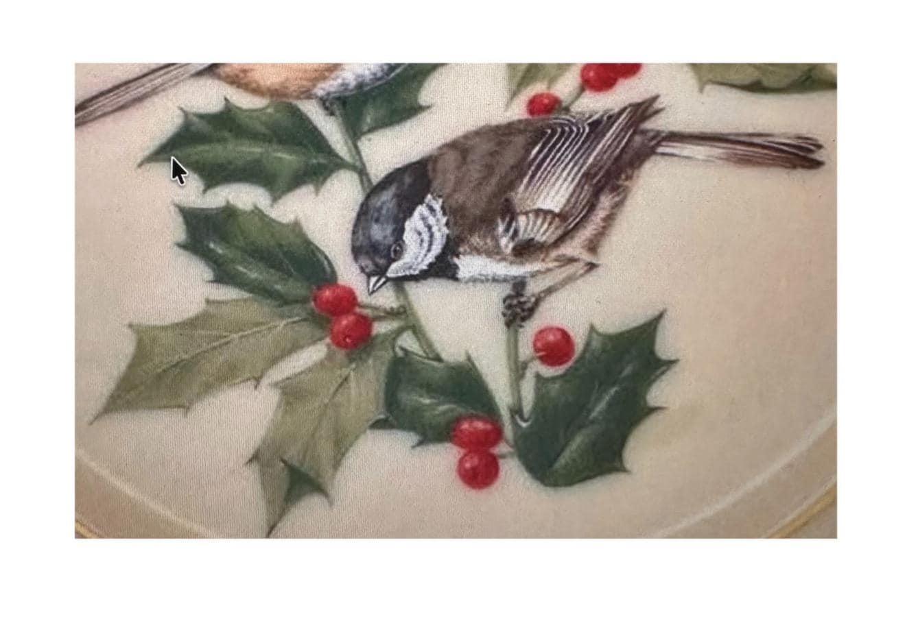 Beautiful Lenox China Wall Hanging plate with chickadee and holly fine ivory china. This is an original work of art created exclusively for The Garden Bird Plate Collection. Made in the USA. Embellished 22 kt gold accents. This fine ivory china plate was made in the 1980's. A pair of chickadees are perched on a green holly branch with red berries. Inscribed in gold with trademark in pure 24 karat gold. Great Christmas gift for bird lover.