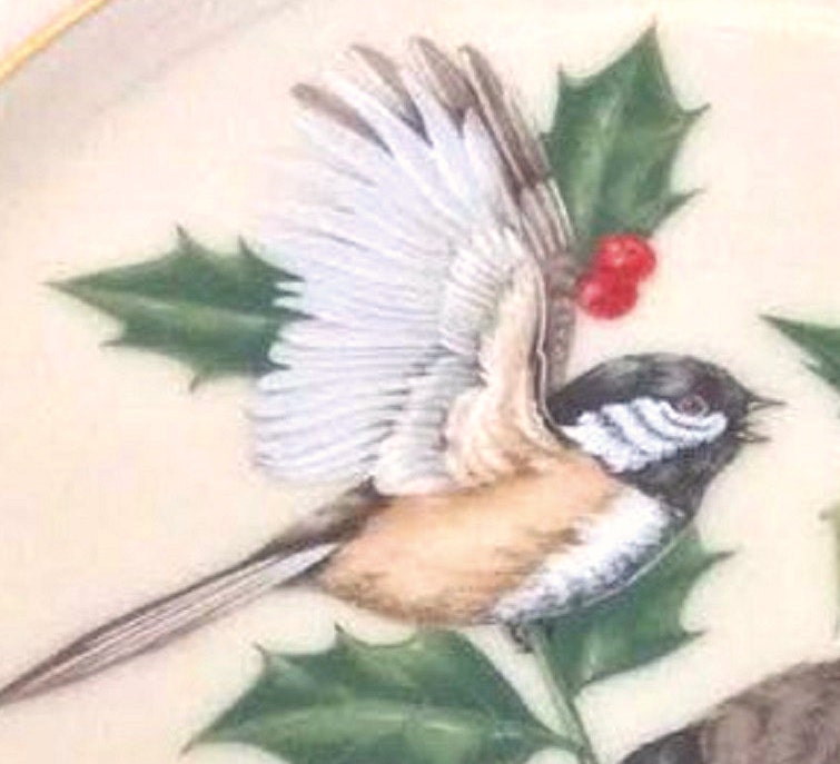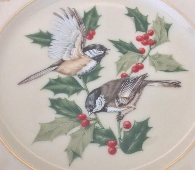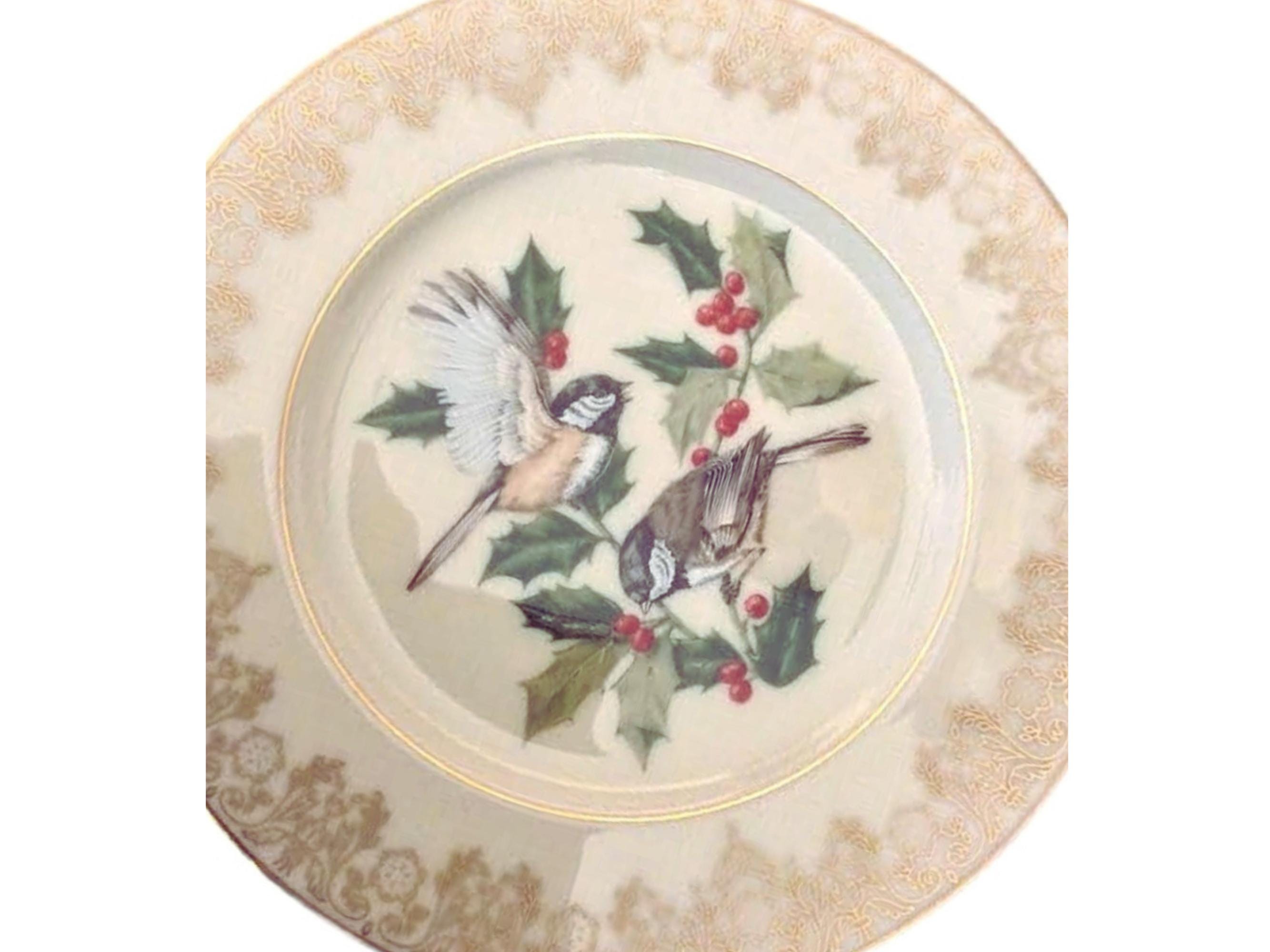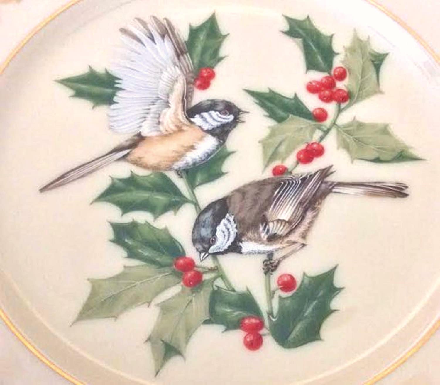 Beautiful Lenox Wall Hanging plate with chickadee and holly fine ivory china. This is an original work of art created exclusively for The Garden Bird Plate Collection. Made in the USA. Embellished 22 kt gold accents. This fine ivory china plate was made in the 1980's. A pair of chickadees are perched on a green holly branch with red berries. Inscribed in gold with trademark in pure 24 karat gold. Great Christmas gift for bird lover.