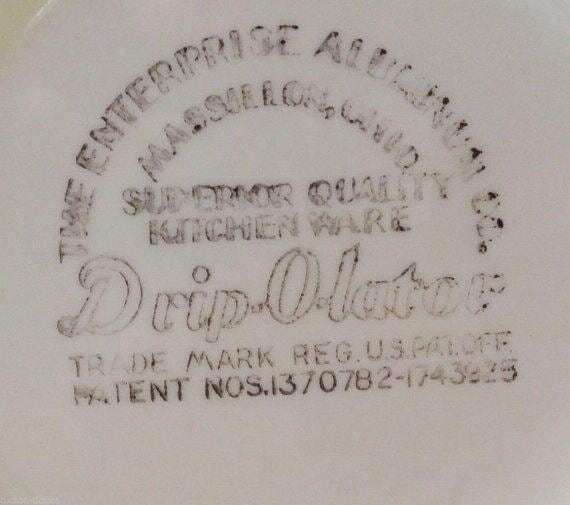 Hall China for Enterprise Aluminum Company. This Hall China teapot is superior quality kitchen ware. Not marked Hall but it is common knowledge that Hall made these coffee pots. This tea pot is a great mid century item that would look wonderful in your kitchen.