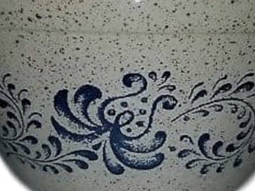 It holds 1 1/2 Quarts. It is tan with a blue design. It has blue flowers on a speckled background.