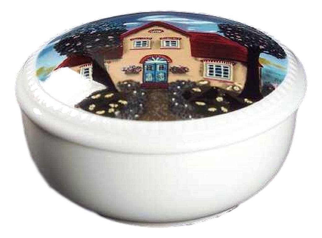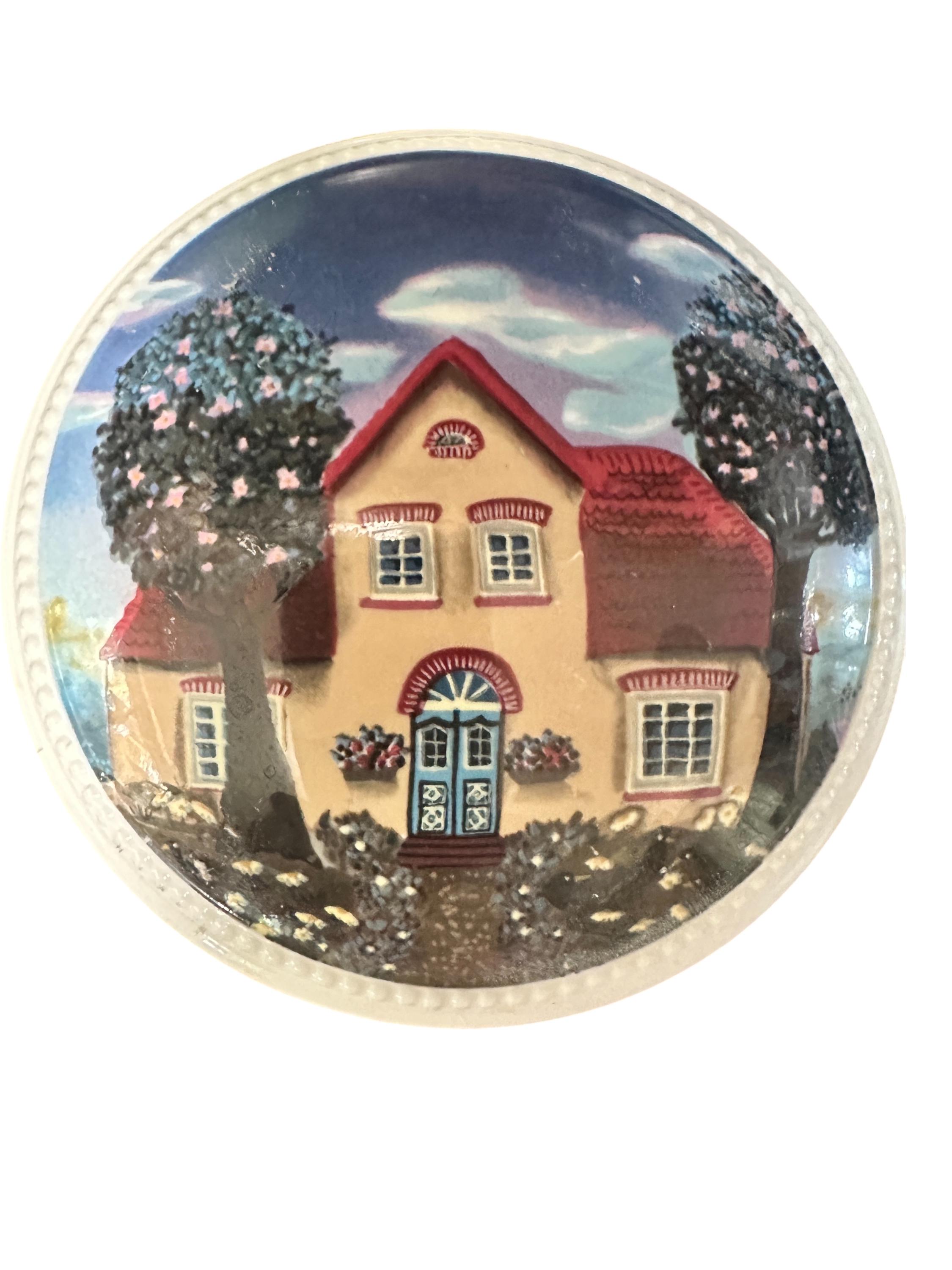 This dresser box features a colorful cottage and tree scene on the lid. The bottom is white.